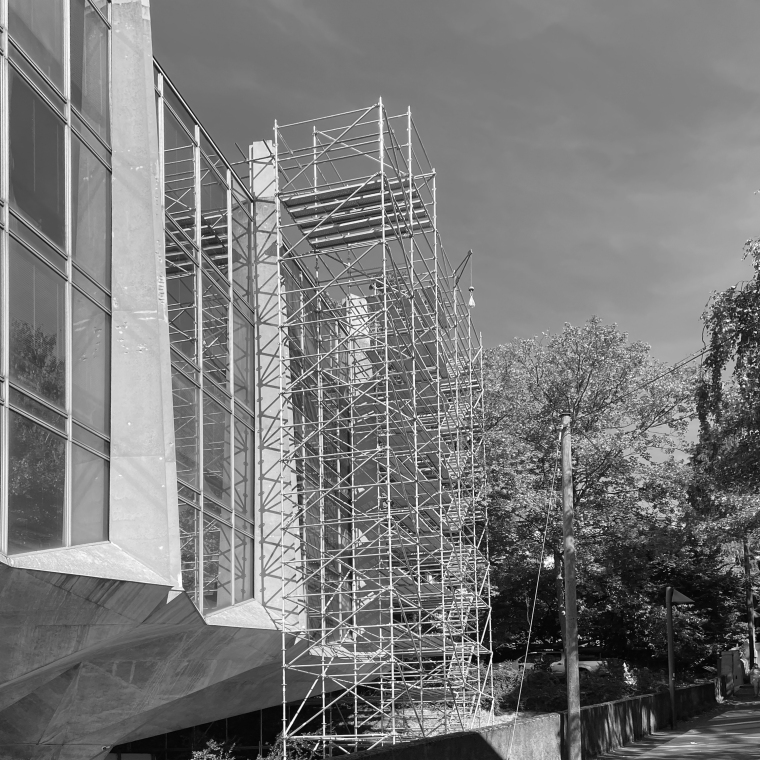 avril 2022 _ ouverture du chantier de la deuxième étape du chantier de restauration de l'immeuble 'miremont-le-crêt' de marc-joseph saugey (1953-1957). réalisation suivie par dcm.