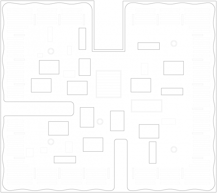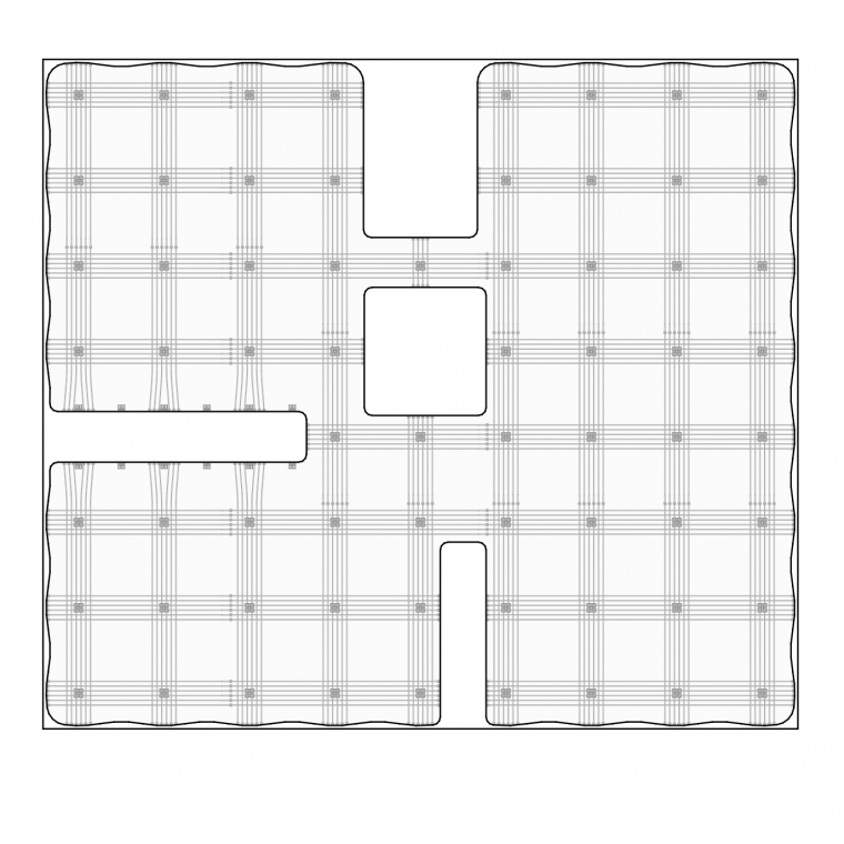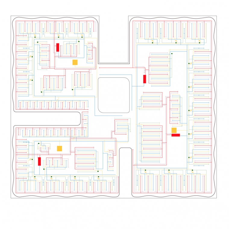 La distribution des fluides, véritable « sève » des fonctions vitales du programme, est répartie de manière régulière sur chaque plateau sur la même base modulaire que la structure.