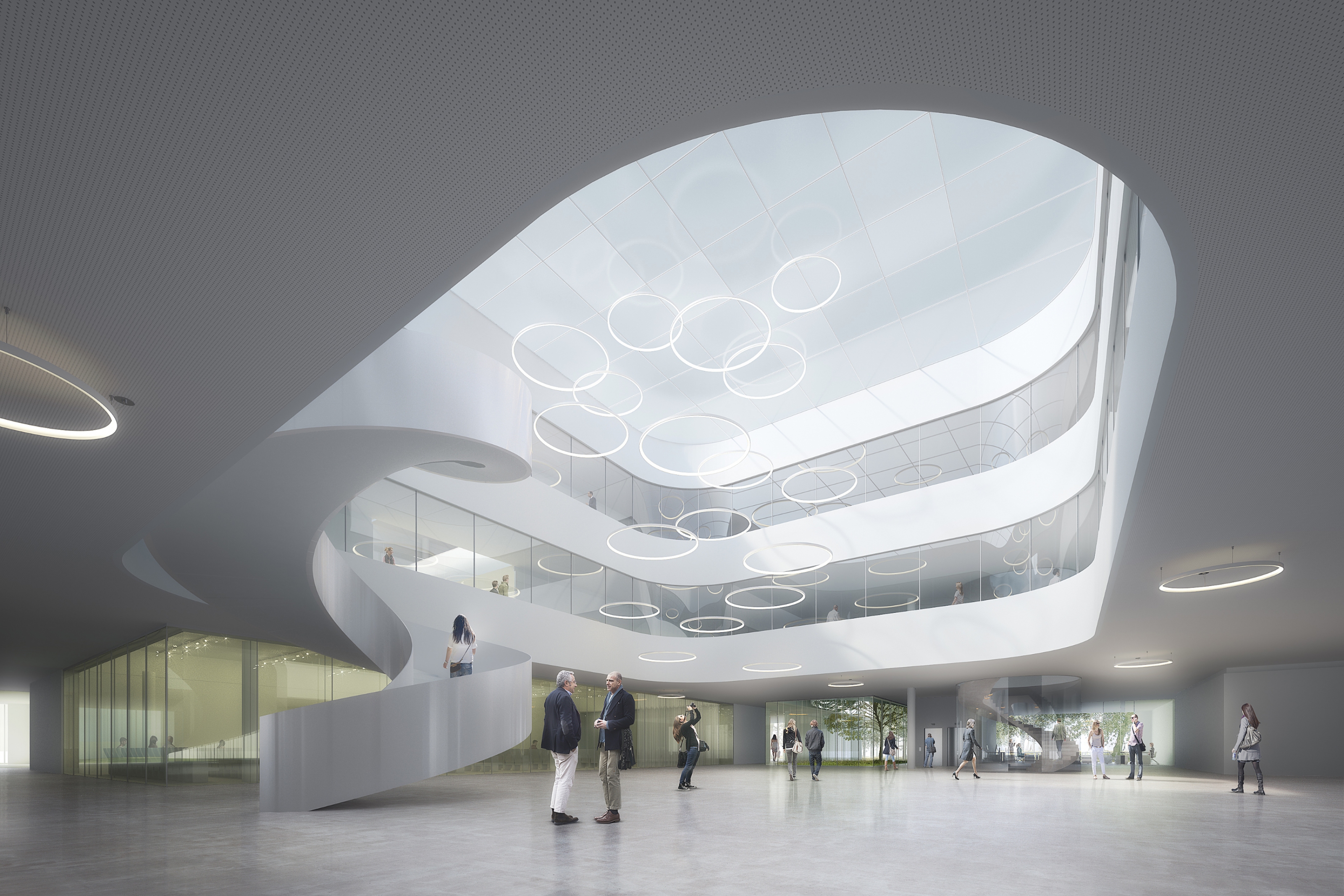 L’entrée principale constituée d’une césure dans la volumétrie, se tourne vers l’arrêt du métro au Nord, proche des parcours d’étudiants. Elle donne accès à un généreux atrium qui s’ouvre sur les trois niveaux de l’institution, permettant le repérage des fonctions. Le programme principal se répartit en trois grands plateaux sur lesquels les étudiants, chercheurs, professeurs et visiteurs peuvent se croiser, tout en bénéficiant chacun dans son intimité.