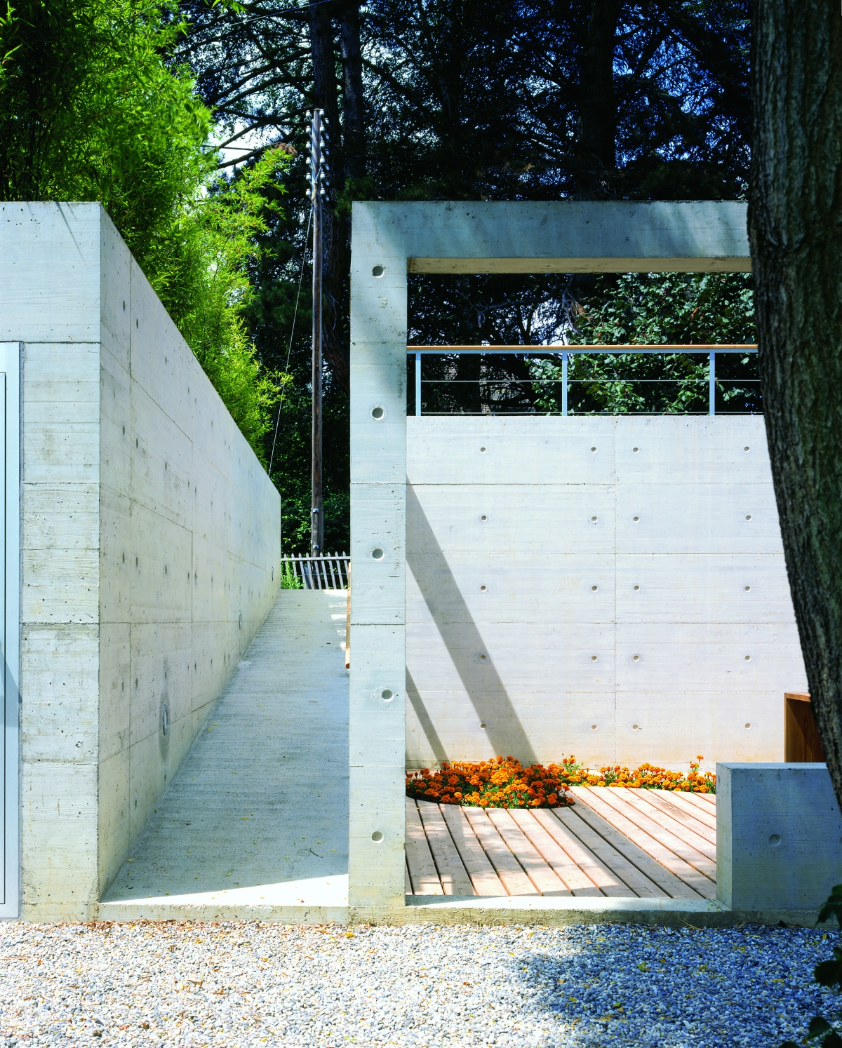 La matière qui s’inscrit en rapport dialectique avec le béton de l’enceinte est le bois naturel, un mélèze qui habille les decks, la table et les mains courantes. Le dessin de la mise en œuvre a fait l’objet d’un calepinage rigoureux dont la métrique renforce l’abstraction de l’intervention.