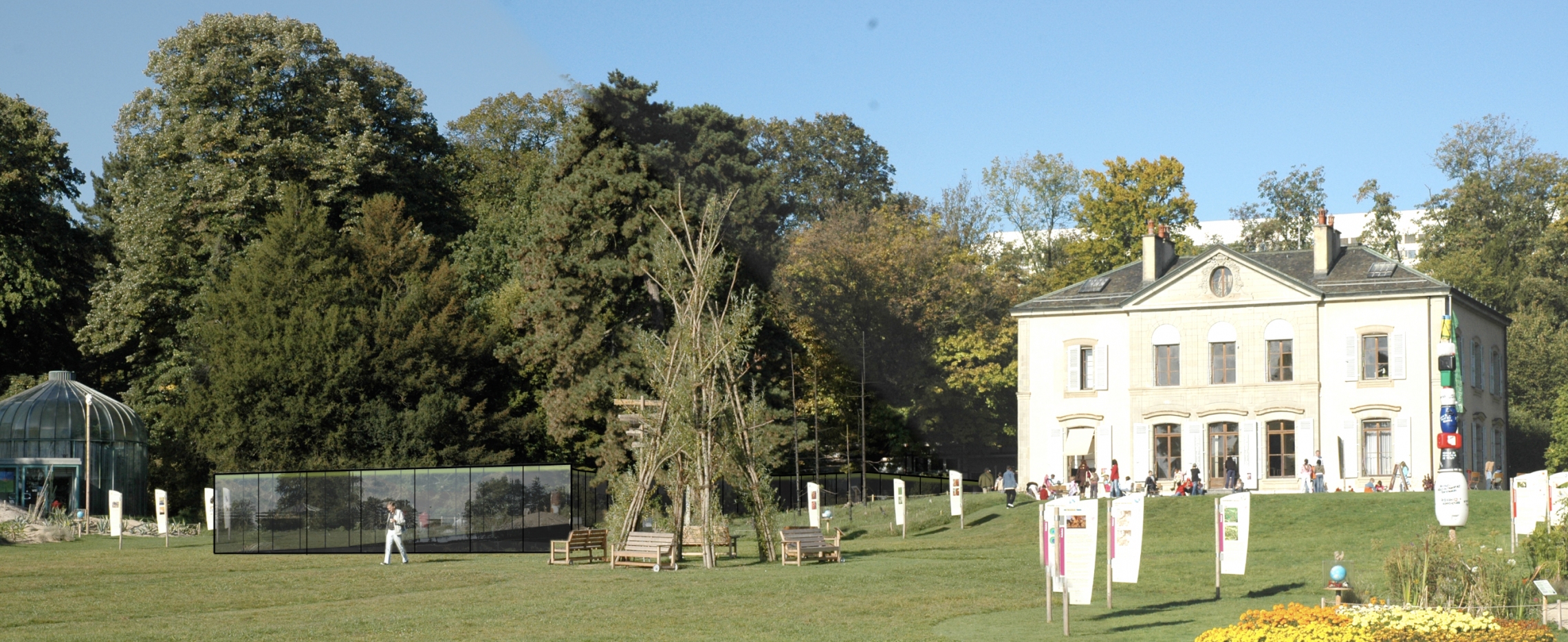 En coupe, le sol naturel du jardin, s’infléchit légèrement pour descendre au niveau des herbiers, là où la recherche s’effectue. Dans cet entre-deux, se place l’espace d’exposition permanente. La dalle de toiture est un jardin artificiel, posé à 1.40 mètre du sol naturel (en amont) : un morceau de terre découpé et placé en hauteur. Cette coupe préserve les vues vers le paysage.