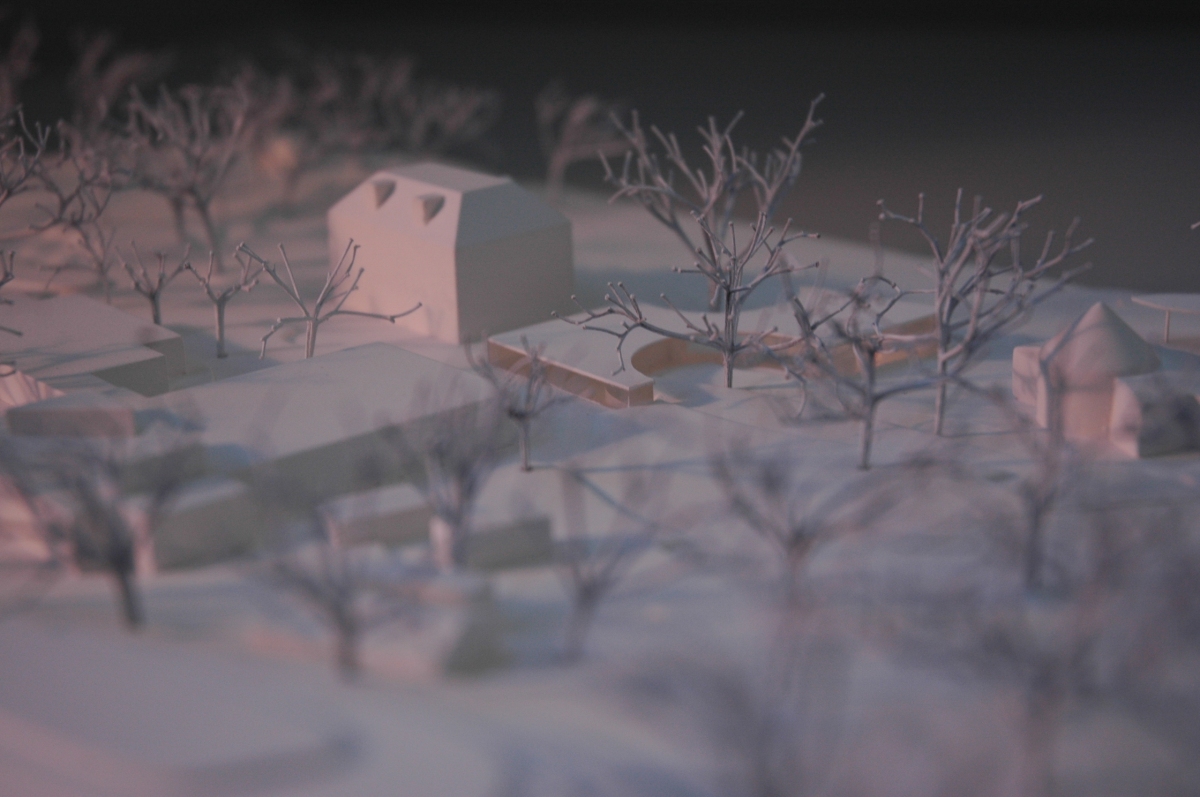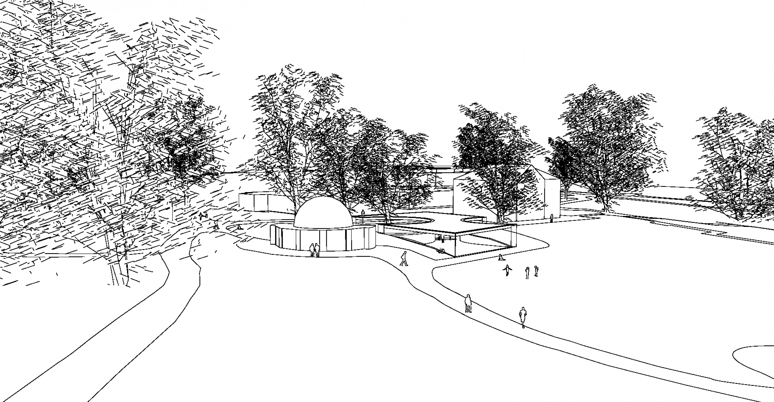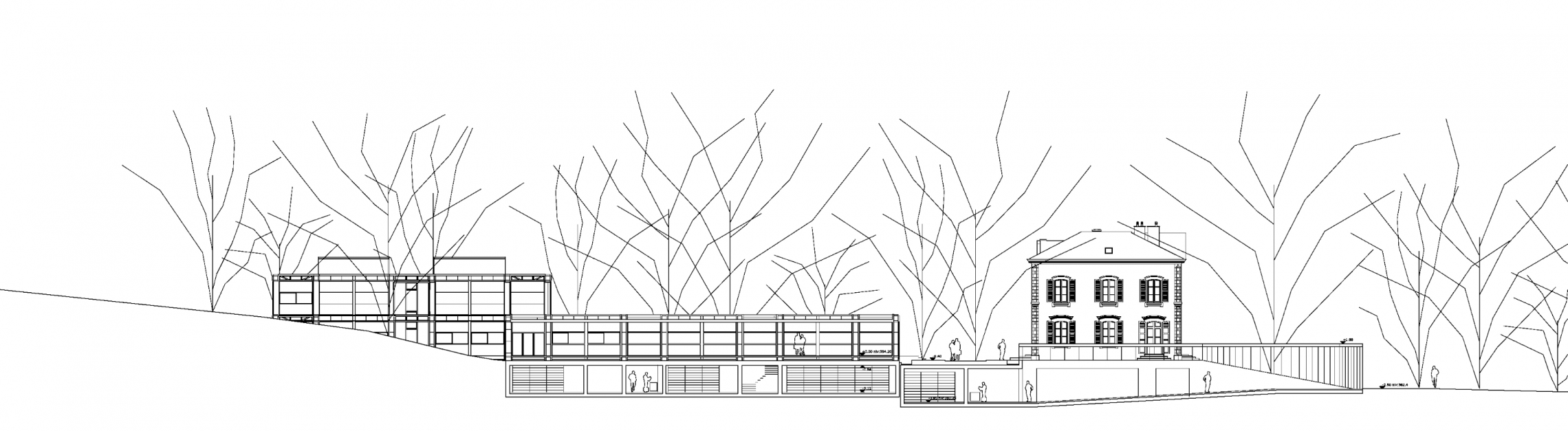 La partie émergente du programme s’installe à l’ouest de la villa 'Le Chêne', dans une portion étroite de jardin, avec un plan et une coupe particulière, intrinsèquement liée au caractère du lieu. Afin de préserver toutes les plantations existantes de qualité, le pavillon s’insère très délicatement entre les racines des arbres. Les deux arcs de cercle ainsi créés, définissent des sous espaces dans le pavillon : la partie du restaurant au sud, avec sa terrasse, et la partie exposition au nord, bénéficiant d’une lumière haute.