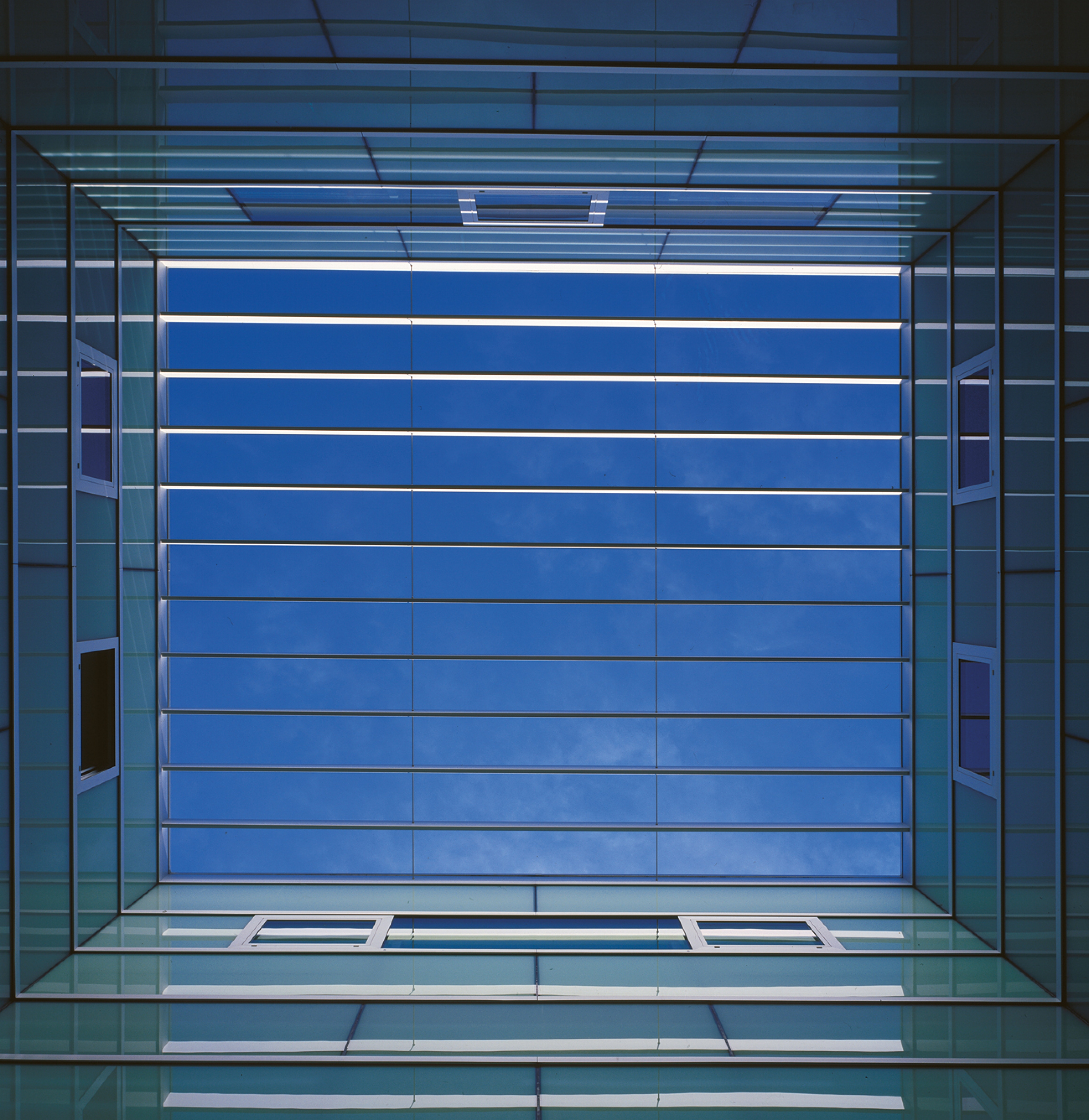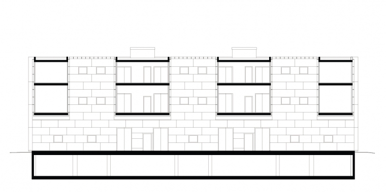 Les façades expriment à travers des lignes horizontales en aluminium, la règle dimensionnelle du projet : sur l’extérieur la peau est réalisée en panneaux contreplaqués Méranti, inscrits dans des profilés ; sur la rue intérieure elle est composée de vitrages translucides et d’éléments ouvrants en verre transparent. Les trois cours à ciel ouvert sont couronnées par des éléments de brise soleil en aluminium qui découpent l’azur en de fines striures géométriques.