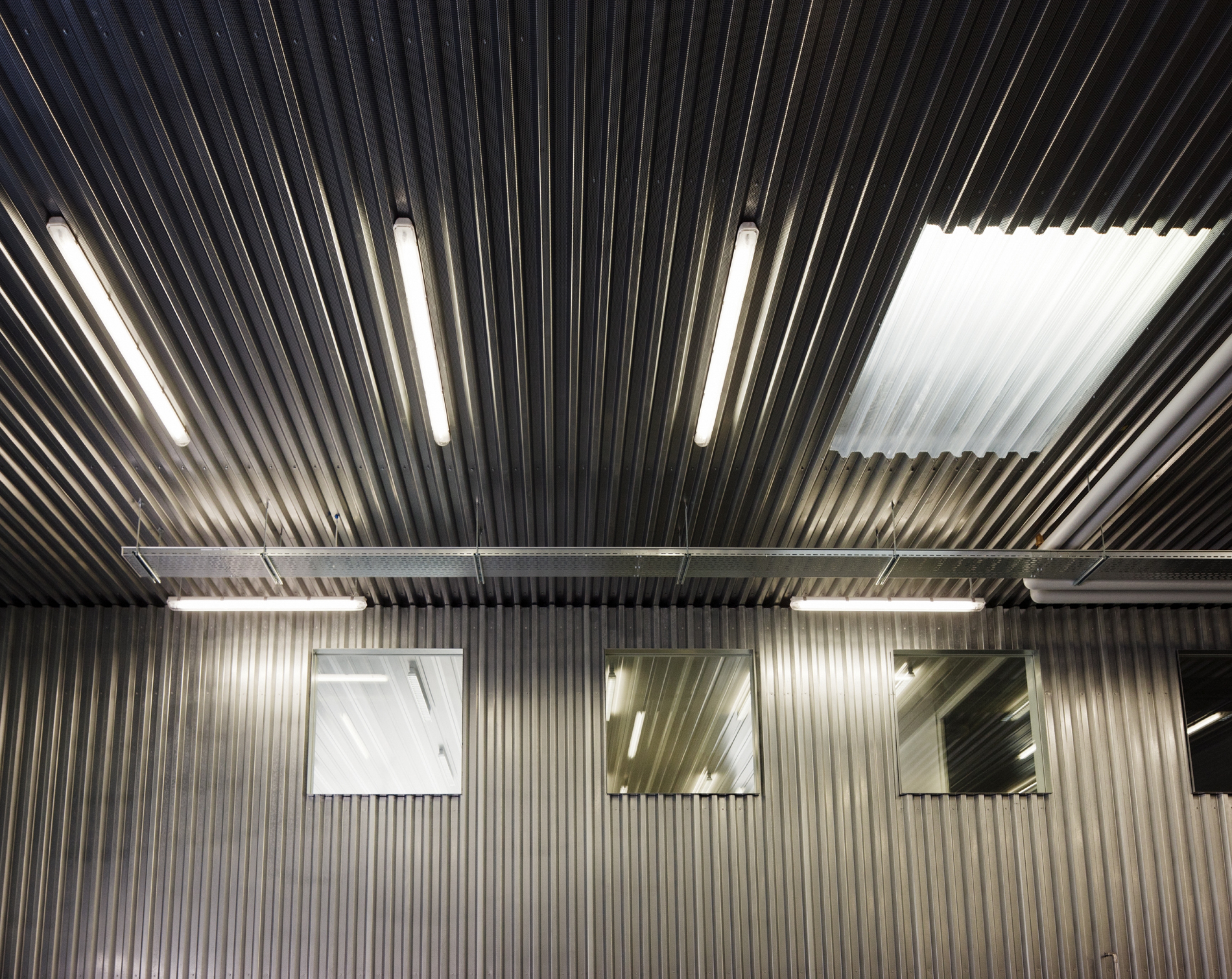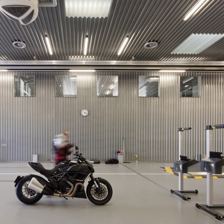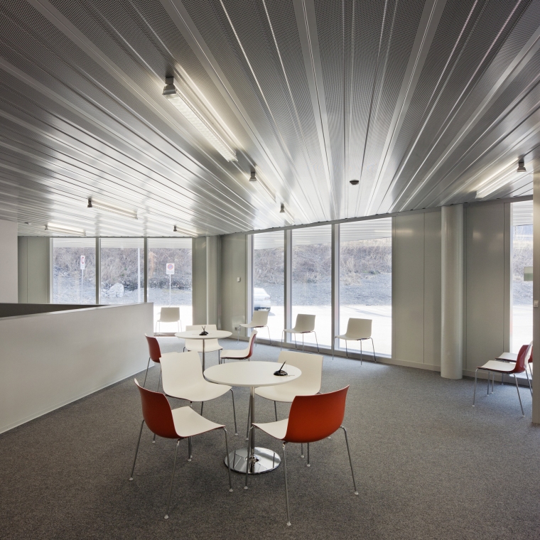 La structure de l’ensemble est prévue avec de grandes poutres en acier composé-soudé permettant de franchir le porte-à-faux protégeant les camions contrôlés. Les façades extérieures sont traitées avec une peau en tôle déployée, celles intérieures avec des cassettes métalliques, affirmant le caractère industriel de l’ouvrage.