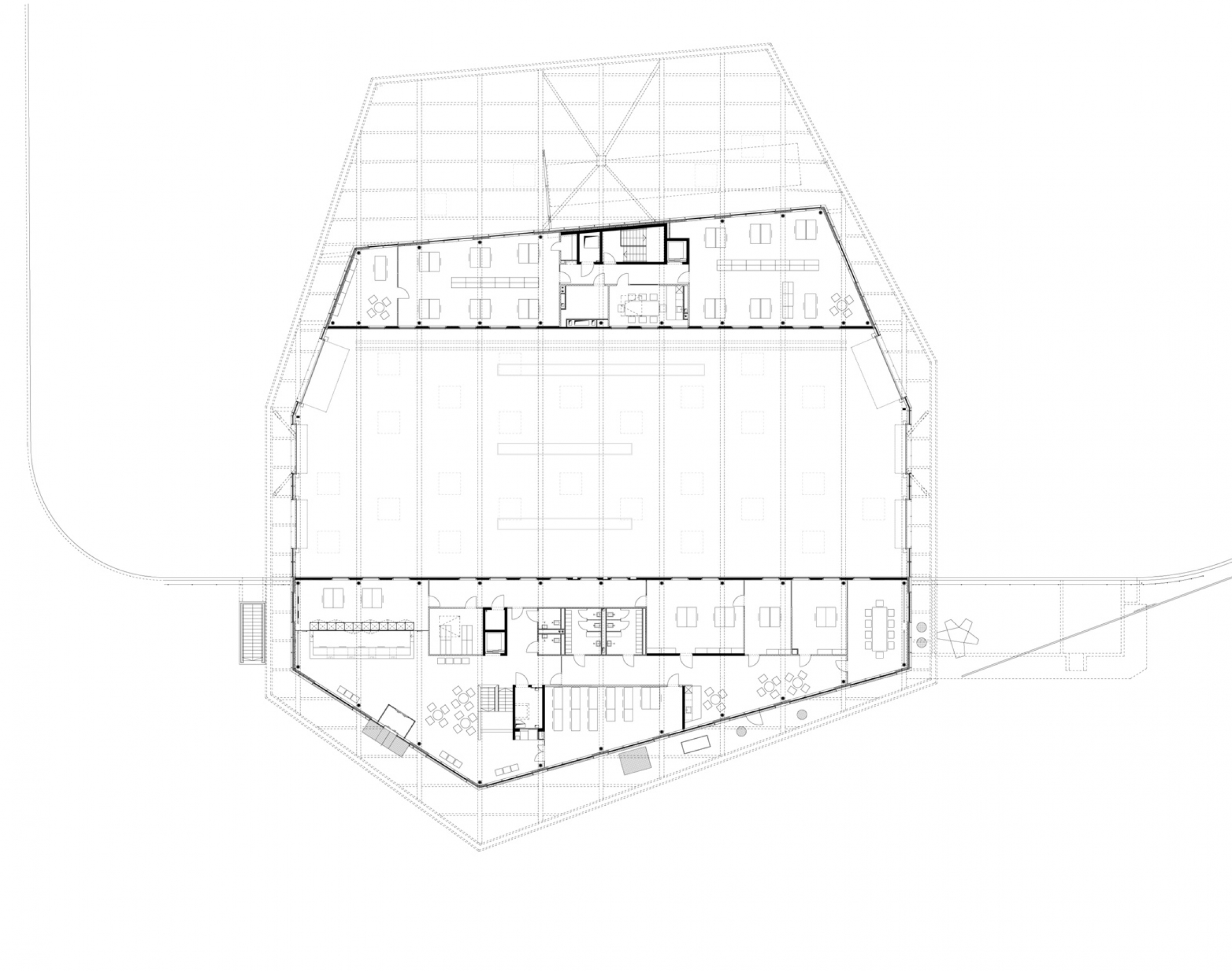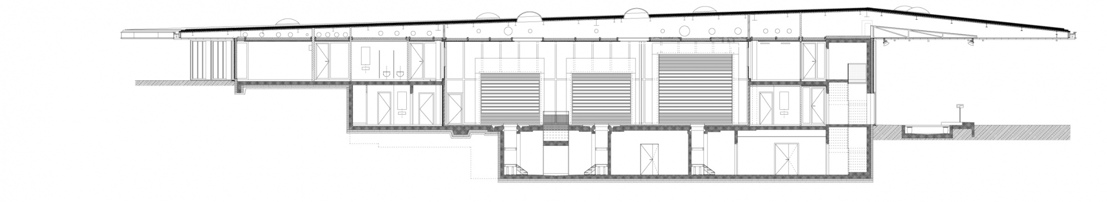 La coupe territoriale a mis en exergue une différence de niveau entre les deux parties du site à disposition, que le projet reprend dans la mise en place de la répartition programmatique. Au nord-ouest, sur la partie supérieure se situe l’entrée au 'bureau des automobiles' (CCRV). Cet espace est en mezzanine sur la grande halle de contrôle, laquelle est bordée sur sa face sud-est par les locaux de la police.