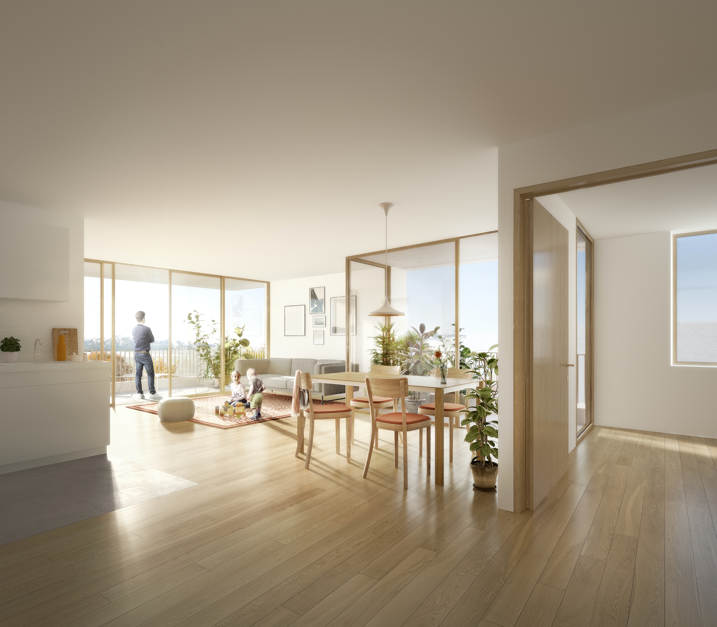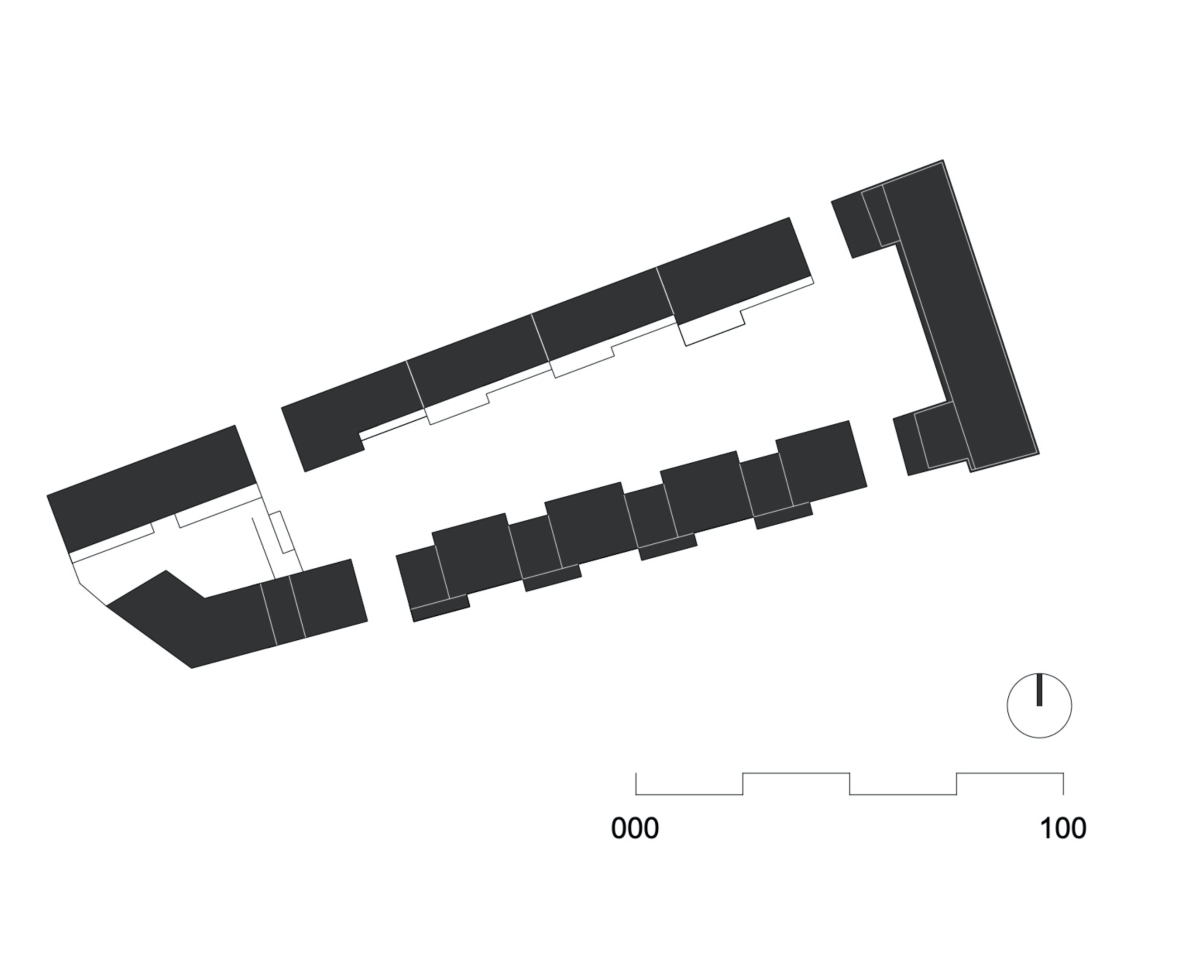 L’offre typologique est très riche puisque devant répondre à des critères spécifiques aux maîtres d’ouvrage. On y trouve des logements coopératifs – avec une distribution extérieure –, des logements subventionnés ou à loyers libres, ainsi que des appartements pour séniors. Un petit centre commercial avec une rue intérieure traversante ponctue la tête orientale du site et sa toiture offre une terrasse panoramique sur les Alpes, accessible à toute la communauté du lieu. La participation des futurs habitants est engagée, pour atteindre un objectif d’animation et de convivialité de l’espace public.