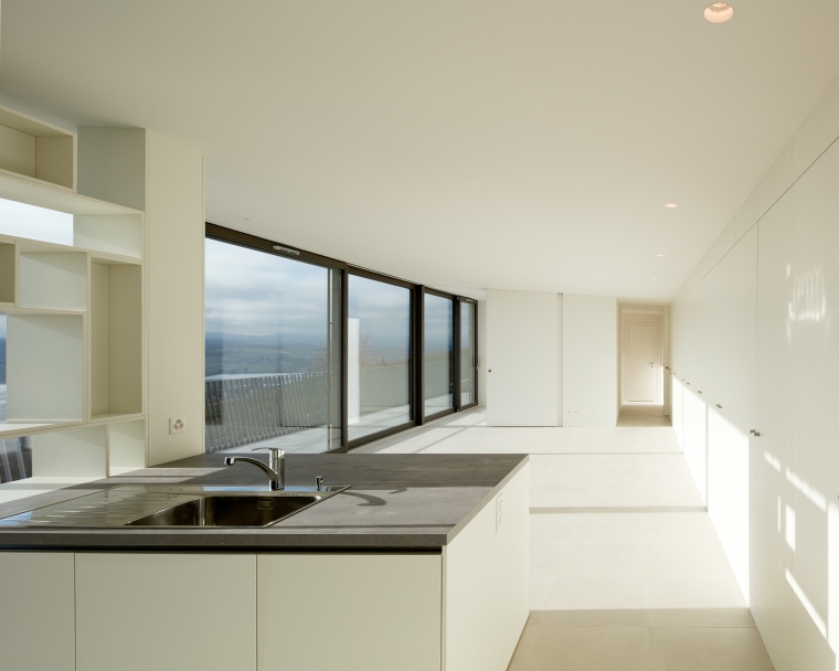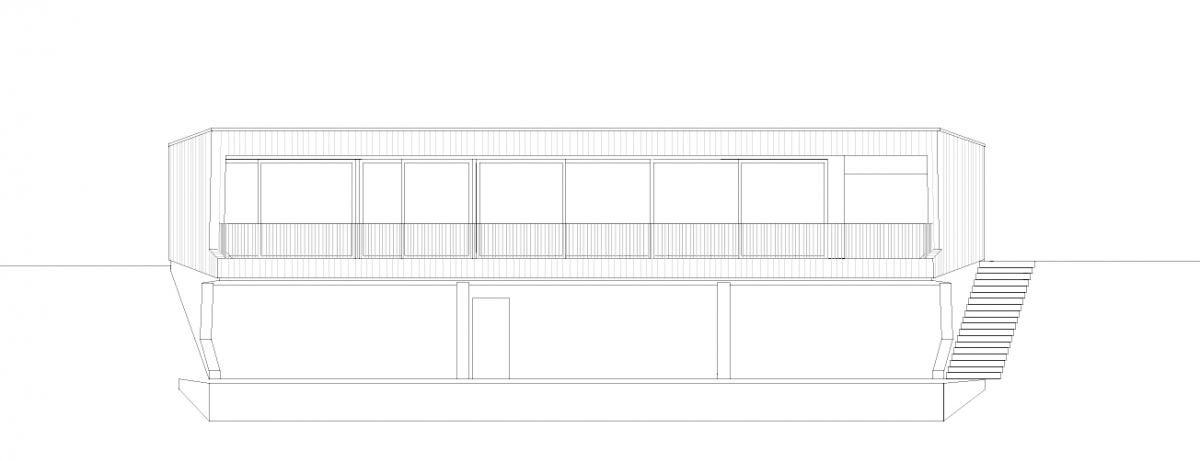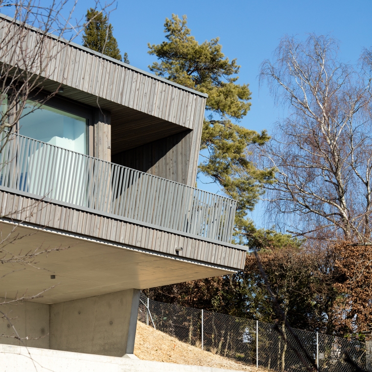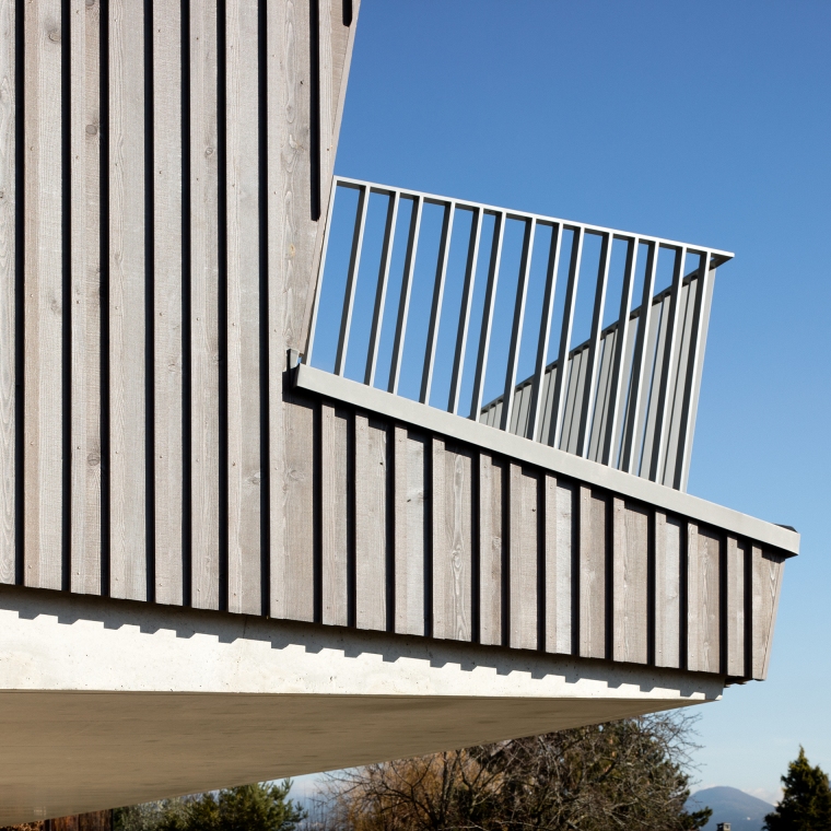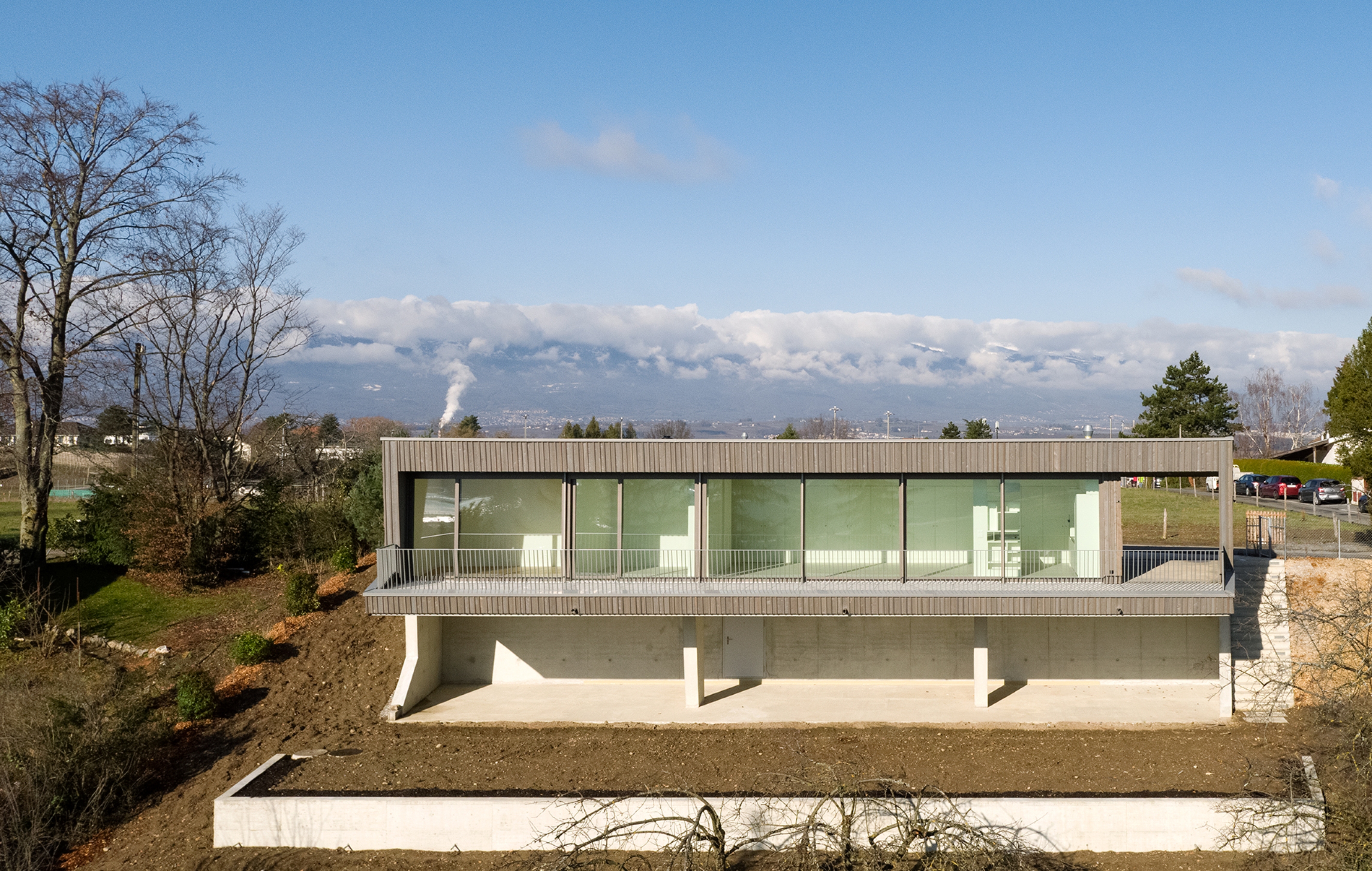 Implantée sur la rive sud de la ligne de côte de la commune de Bernex, en bordure de la campagne viticole genevoise, la maison présente deux visages : le premier, d’échelle réduite, qui évoque une modeste palissade de jardin et le deuxième, plus emphatique, qui dénote de la situation dans une pente très prononcée. La coupe génère la conception globale du projet avec, du côté amont, un unique percement qui annonce l’entrée et, à l’aval, une unique fenêtre en longueur qui s’ouvre sur le majestueux paysage de la plaine de l’Aire et le sky line du Mont Salève. Un socle en béton aux réminiscences d’ouvrage d’art ancre la villa dans son territoire incliné et supporte un volume en mélèze, expression d’un piano nobile en quasi apesanteur lorsqu’il est perçu du bas de la parcelle.