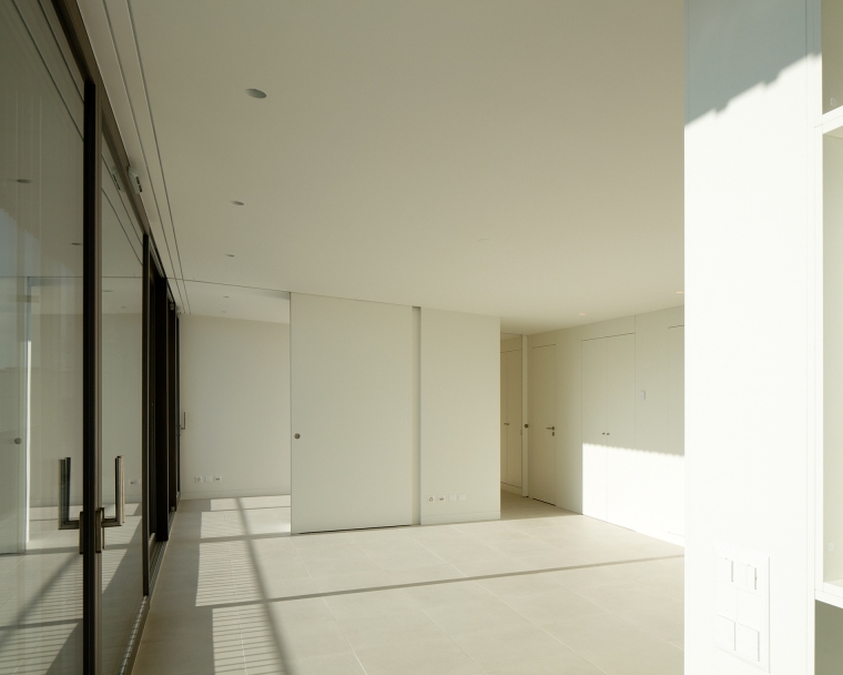 La géométrie du plan accompagne les étroites limites foncières dont les biais deviennent également le thème de composition du projet. Dans ce terrain presqu’inhospita-lier, la seule horizontale est celle offerte au logement ce qui donne son sens à la notion d’habiter ce lieu particulier. Adossé à un long meuble, le projet déroule ses fonctions, articule ses espaces et accommode son usage avec un système de portes coulissantes qui recomposent le mode de vie.