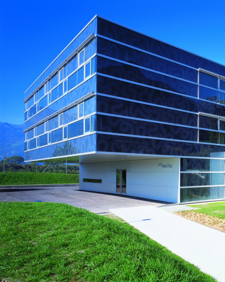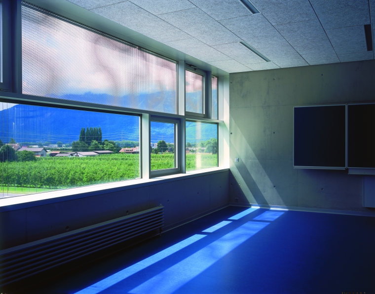 Dans la vallée du Rhône, le bâtiment est conçu comme une sorte de sculpture, posé sur un sol parfaitement horizontal en raison de la présence en sous-sol d’un abri anti-atomique de la Protection civile suisse. Il s’agit d’un prisme pur, auquel on a enlevé des parties : au sud pour créer un préau couvert, au nord pour ouvrir la distribution intérieure vers les montagnes. A l’est on a sorti un 'tiroir' pour accueillir les deux salles enfantines.