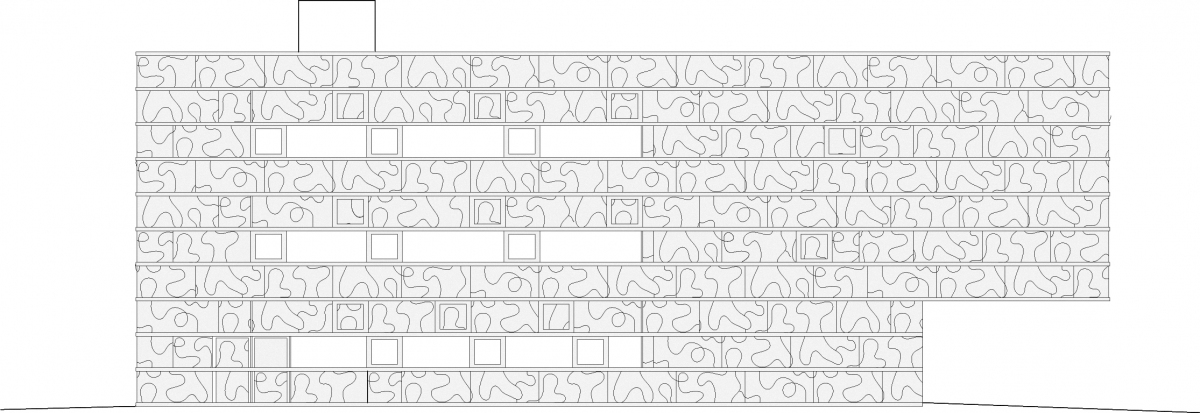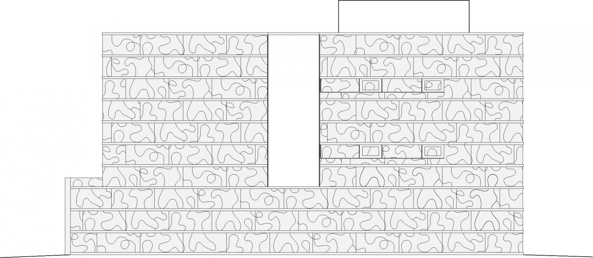 A cet intérieur en béton minimaliste répond une peau extérieure en verre sérigraphié qui thématise par son motif des 'impressions d’enfance' : des formes libres, qui évoquent autant la cristallisation de l’eau en neige que le 'tag' new-yorkais de l’artiste Keith Haring.