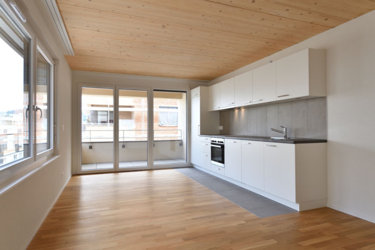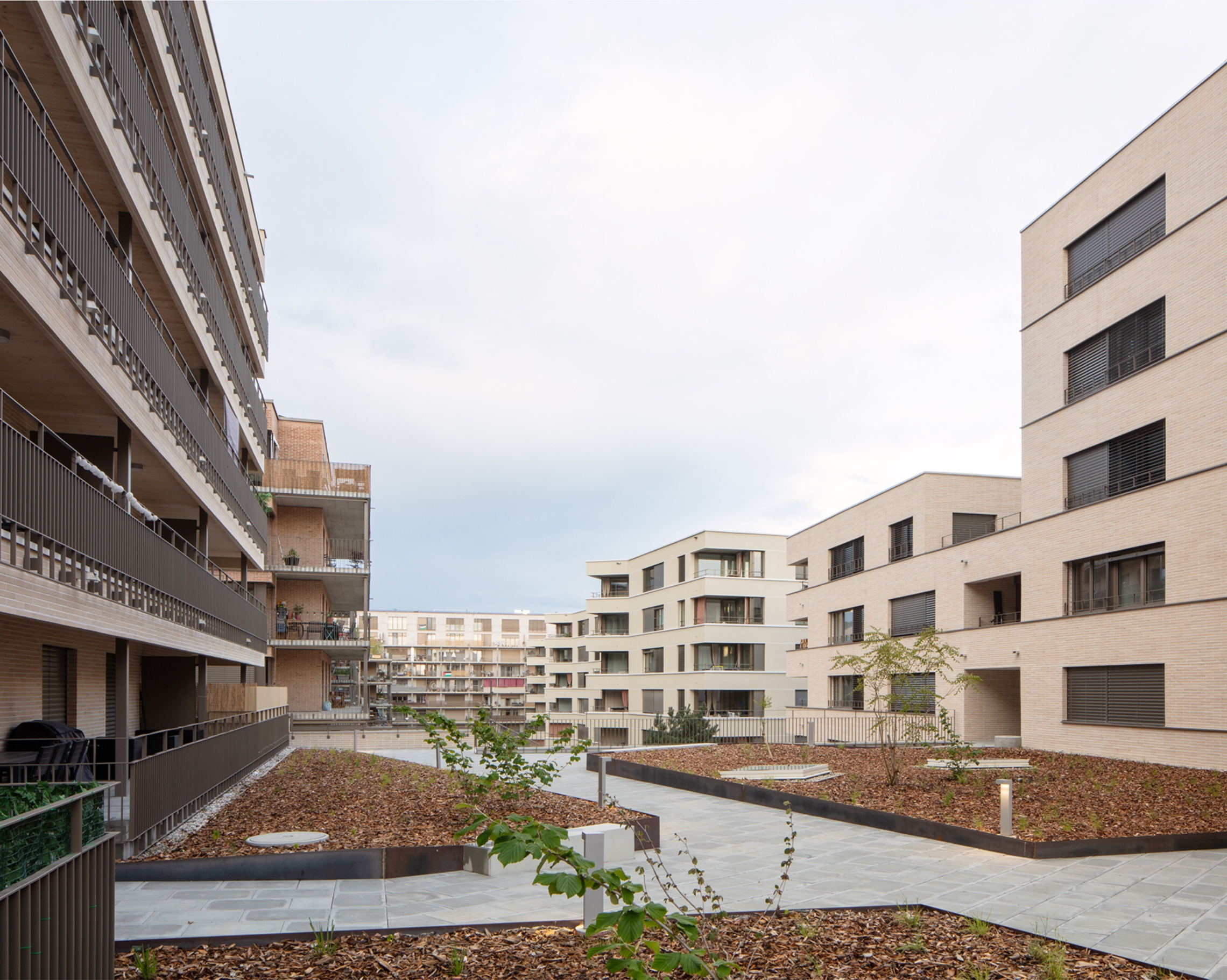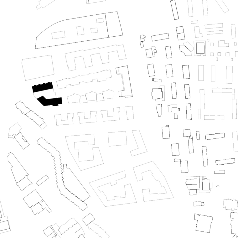 Le bâtiment situé à l’ouest de la pièce urbaine « B » se compose de deux volumes posés distincts, sur un socle. L’ensemble réalisé s’inscrit dans la silhouette du quartier qui cherche à reproduire une courbe dont le centre est plus bas que les extrémités. La disposition des immeubles offre une percée visuelle depuis l’espace semi-public situé sur la toiture-jardin, vers le grand paysage lacustre.