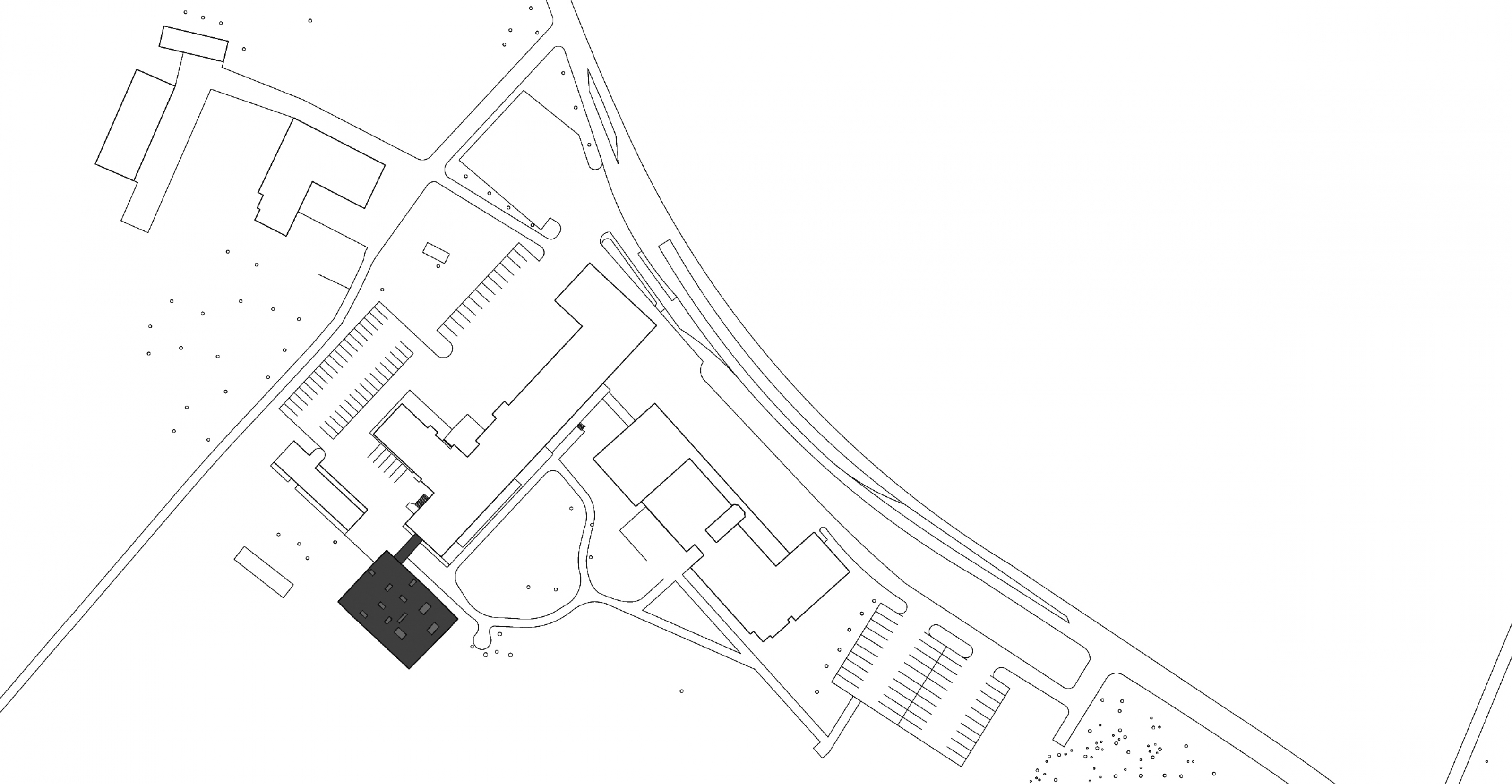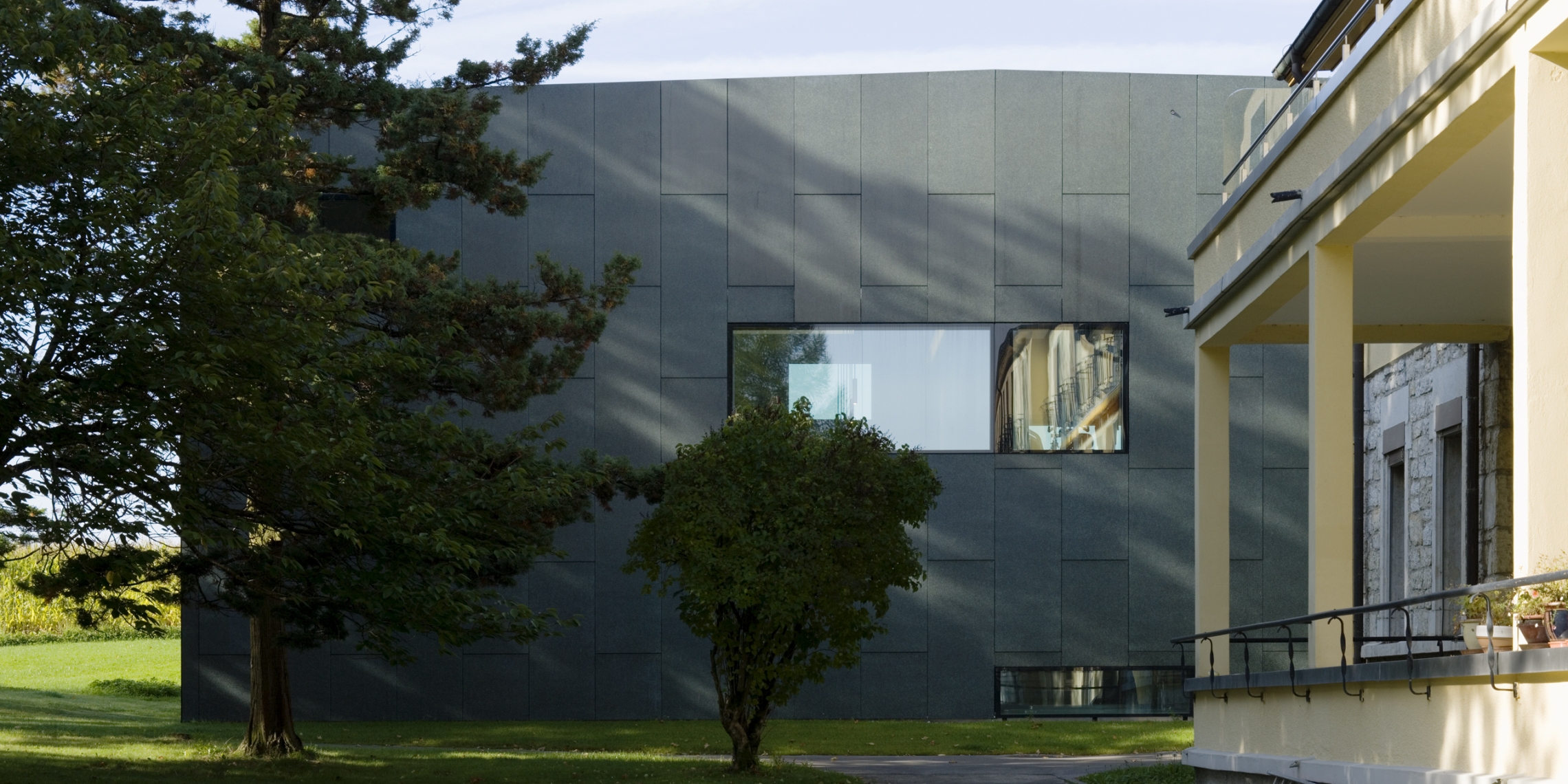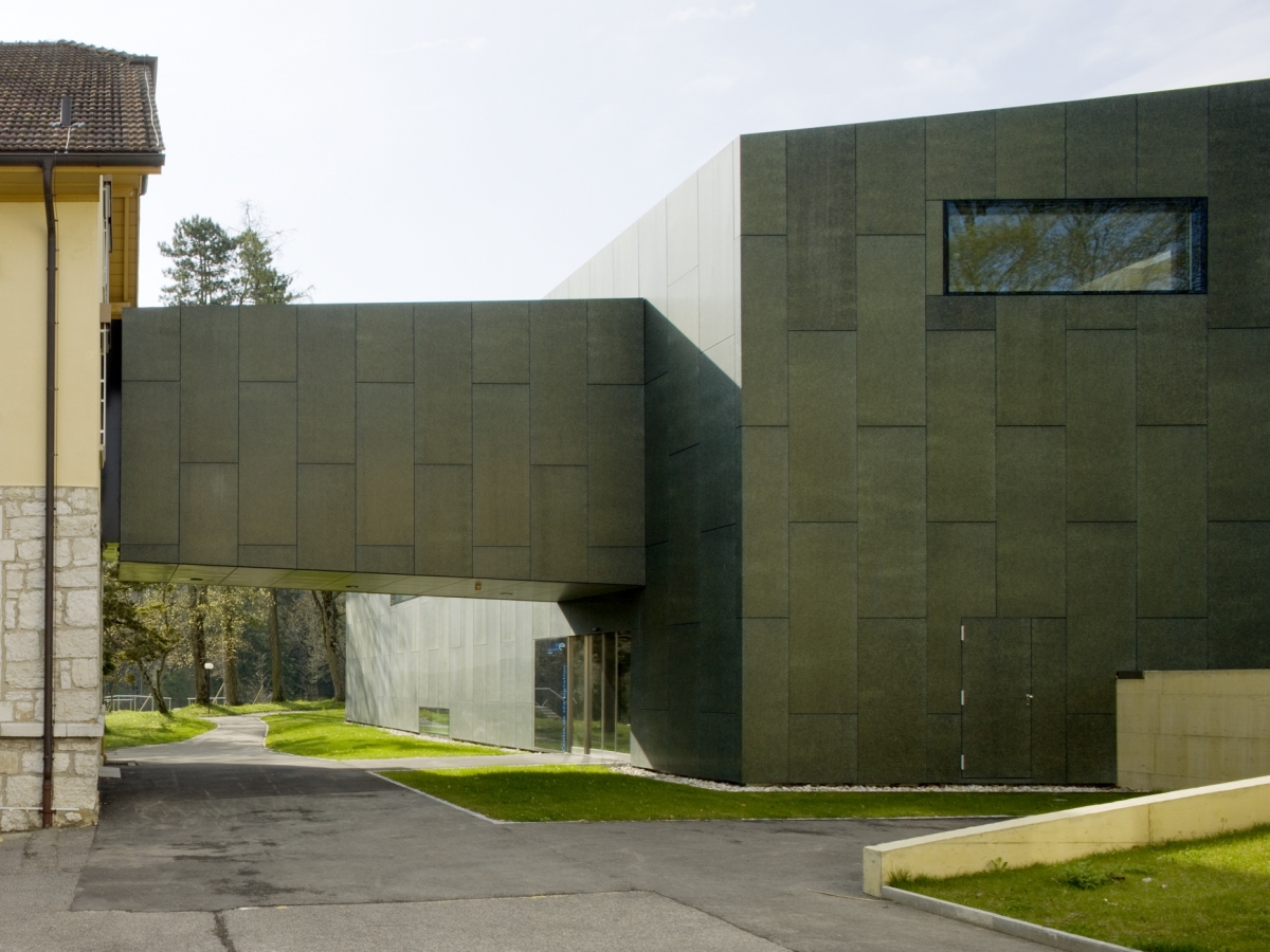 Le parti architectural est de créer un volume simple dont les arêtes sont légèrement biaisées en plan et en élévation, afin qu’il s’intègre de manière harmonieuse aux différents types de bâtiments présents sur le lieu. A la manière d’une sculpture, le volume se pose dans le magnifique paysage jurassien du Val-de-Ruz. La totale planéité de sa peau de verre et de cuivre lui confère une expression contemporaine, la passerelle de liaison étant conçue comme une excroissance du volume principal, dont elle reprend la matérialité.