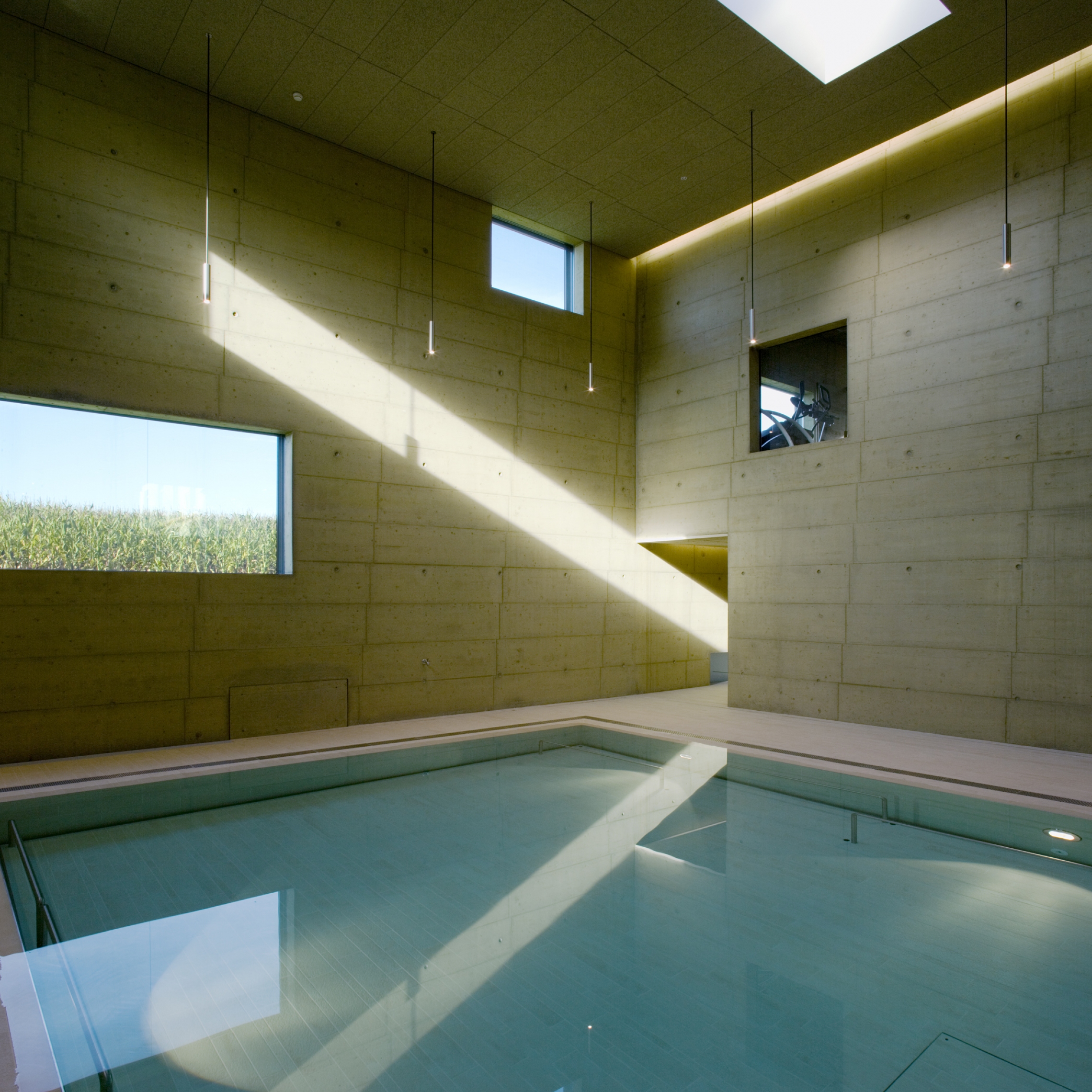 La piscine, réalisée sur une double hauteur, se met en rapport avec le paysage par quelques grandes fenêtres formant des cadrages, par des ouvertures sur le ciel et par des fenêtres intérieures en relation avec l’étage. L’utilisation d’un béton teinté et calepiné précisément confère à l’espace intérieur de cette pièce d’eau, une matérialité et une texture particulière.