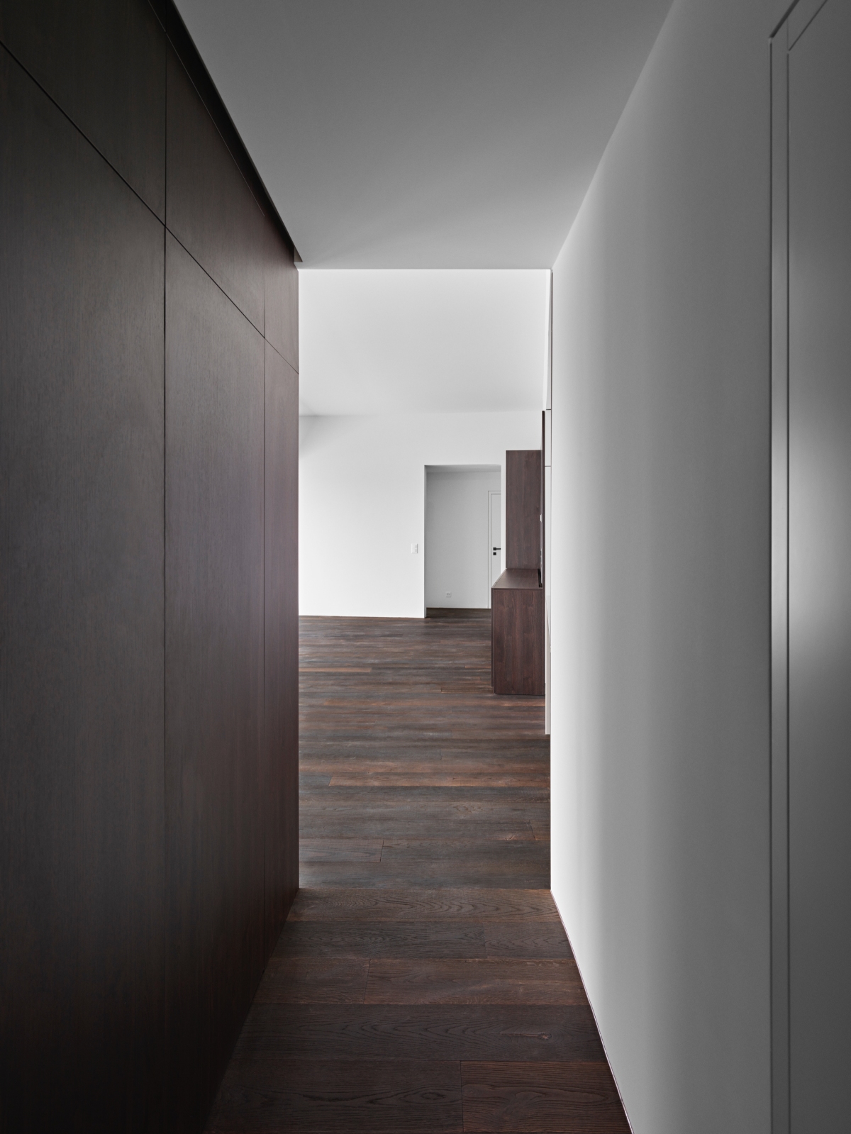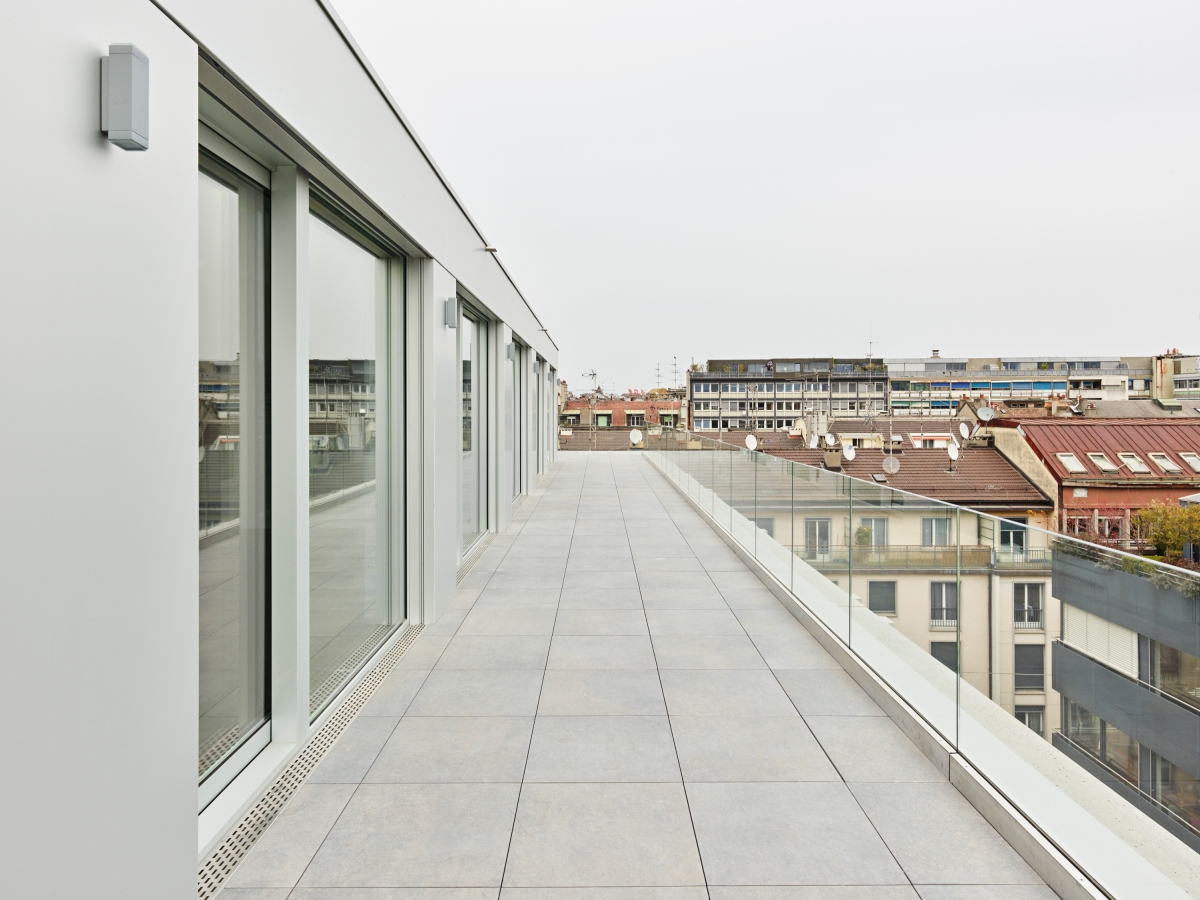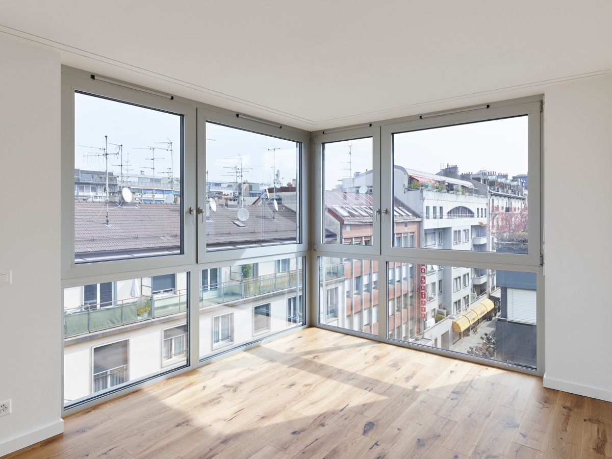 Les typologies ajoutées gardent une continuité avec les appartements d’origine de cet immeuble construit à la fin des années soixante par les frères Honegger. Une terrasse commune en toiture est prévue ainsi que de nouvelles installations de panneaux solaires et une pompe-à-chaleur. Construit à partir de la toiture existante, ce chantier se déroule en site occupé, y compris au dernier étage. Pour y arriver, un nouveau plancher avec un vide technique d’environ 30 cm permet la déviation des gaines de ventilation et conduites d’eaux pluviales entre les étages existants et les nouveaux. Des poteaux en béton préfabriqués posés aux balcons du 4ème étage descendent la charge des nouveaux étages en continuité avec les porteurs des façades existants. Les nouveaux planchers mixtes bois-métal permettent de réduire le poids des niveaux rajoutés.
