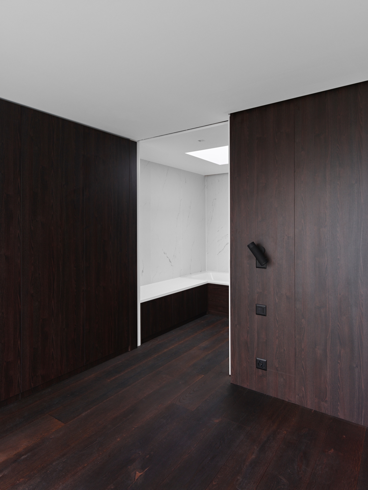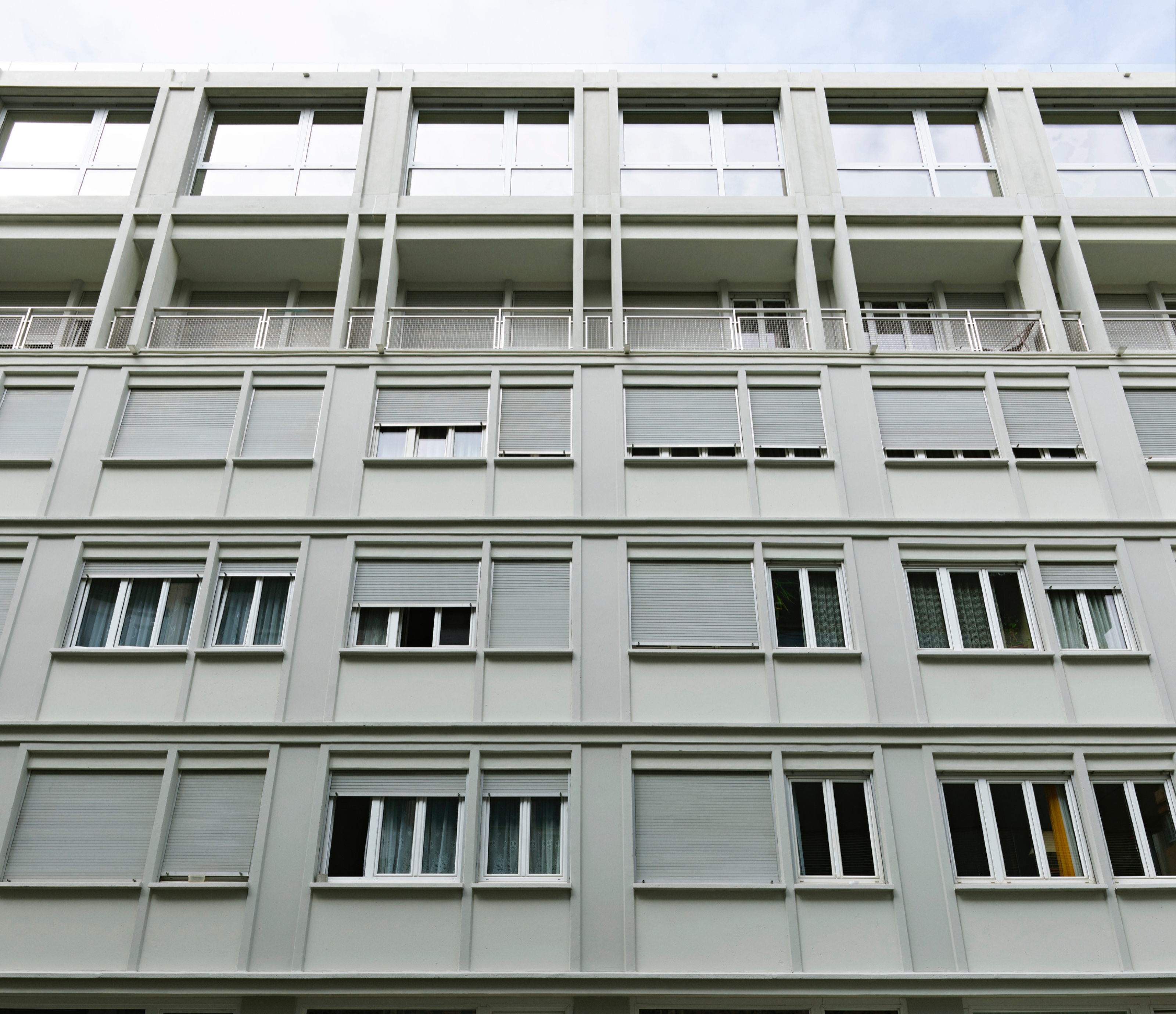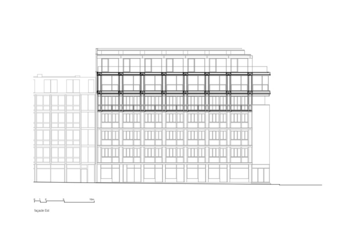 Le volume existant présente une façade très travaillée avec une grande visibilité des éléments constructifs distincts. Le projet reprend le langage architectural ainsi que les travées structurelles originelles. Les modules des fenêtres de la sur-élévation s’ouvrent sur la totalité de la trame offrant plus de lumière aux nouveaux appartements. Le 6ème étage, en retrait, continue cette même métrique avec une matérialité et une expression de façade plus contemporaine et légere.