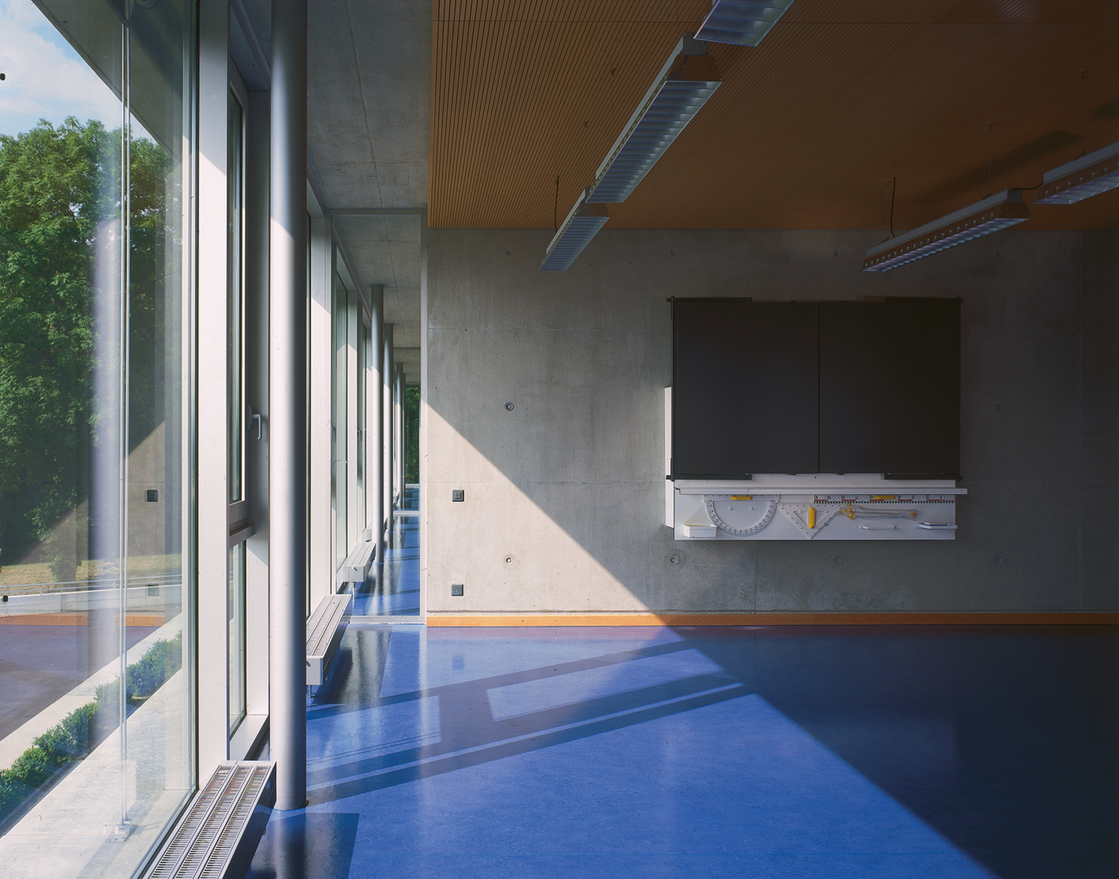 Le collège est constitué d’un système porteur lamellaire en béton définissant chacun des espaces de classes et d’une façade vitrée périphérique. La séparation classes - couloirs s’affirme à travers un élément non porteur constitué d’armoires et de hauts-jours en hêtre naturel. Les revêtements de plafonds des classes sont eux aussi traités dans la même essence. L’ensemble des sols est unifié par un linoléum de couleur bleue.