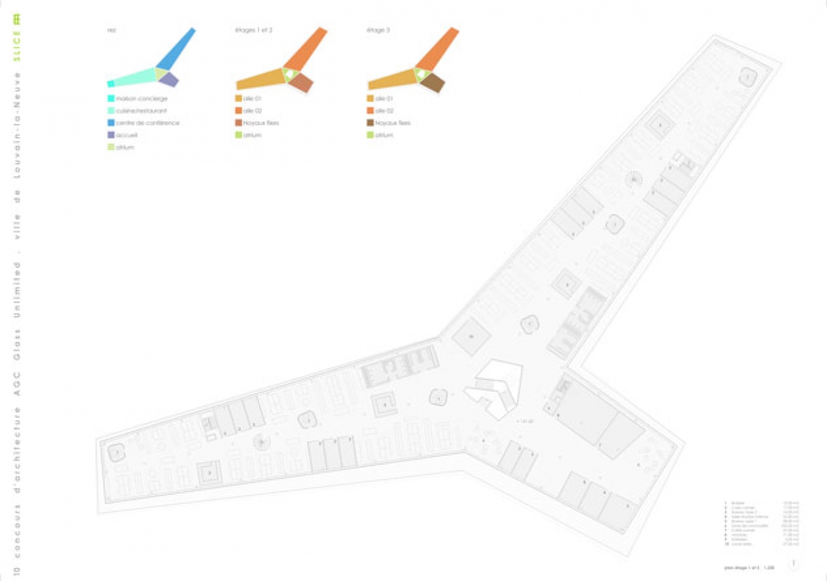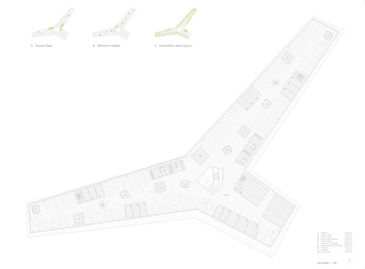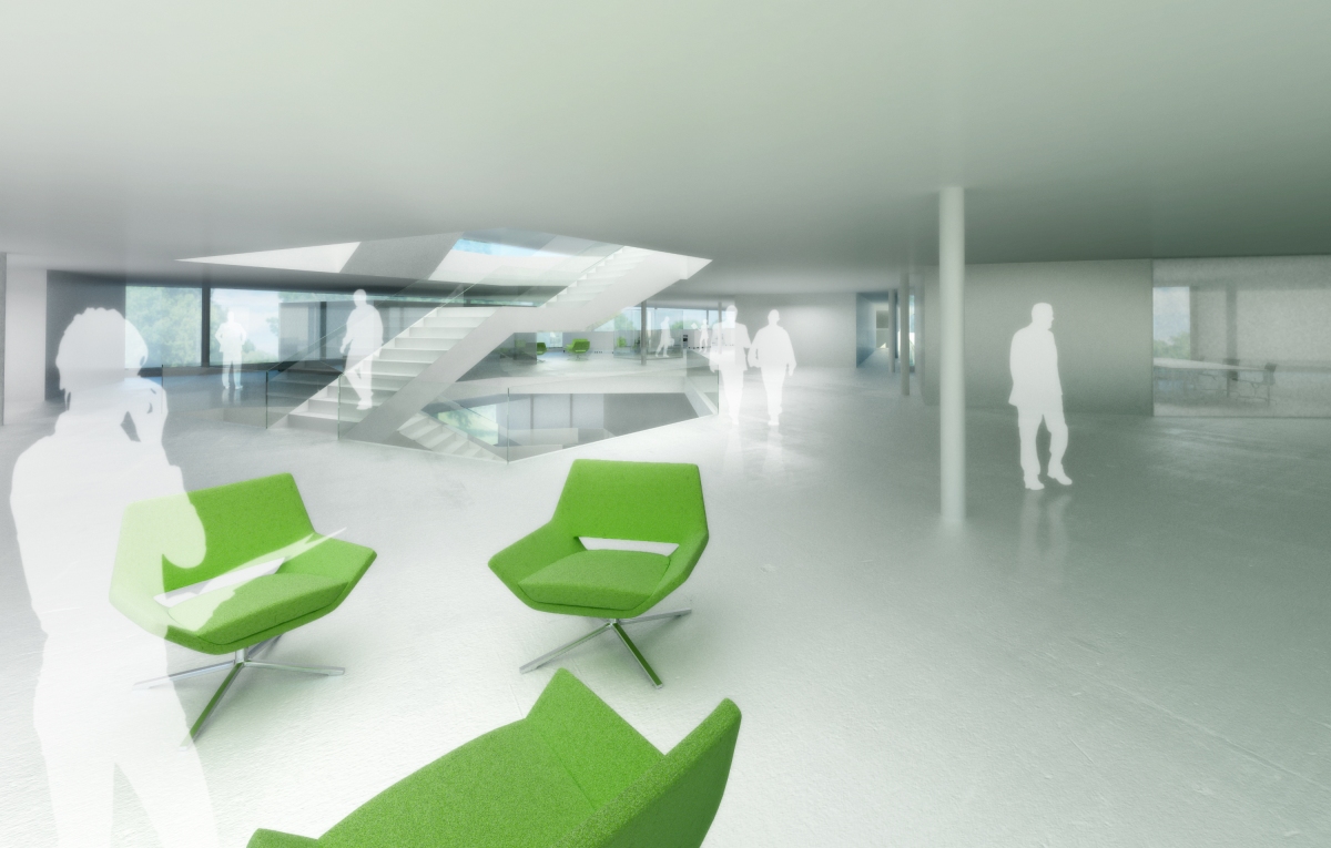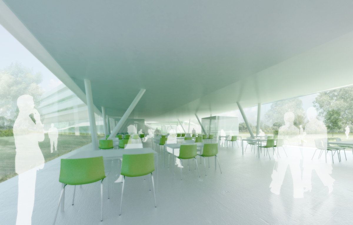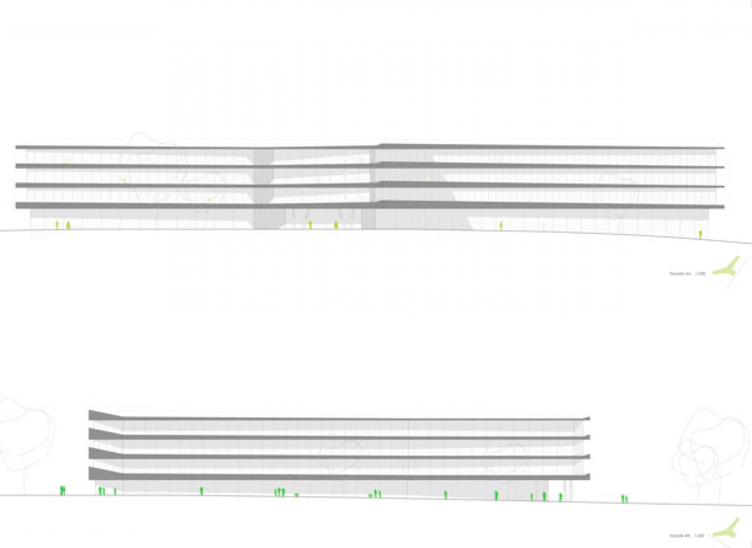 Le bâtiment prend une forme libre, permettant l’intégration paysagère. Le rez-de-chaussée sur pilotis en 'V' est entièrement vitré pour laisser passer le regard et la nature. Ce dispositif en plan permet au surplus de différencier les ailes pour les divers secteurs administratifs du maître d’ouvrage. Les façades en verre se marient à des éléments horizontaux filants sur tout le volume, et dont la dimension et la forme changent en fonction de l’orientation cardinale.