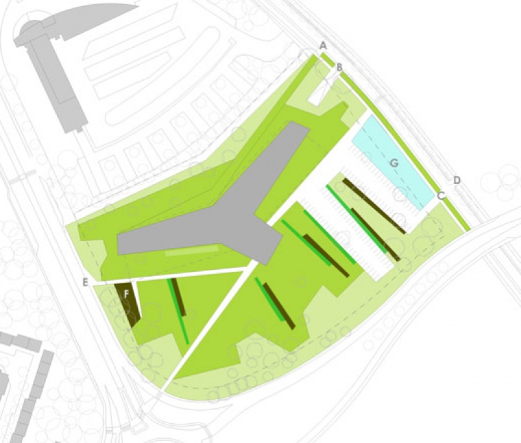 La notion de 'porte de la ville' est ainsi travaillée par une prise de distance par rapport à la bretelle de sortie d’autoroute afin de conférer à l’entrée dans la ville une gradation du cadre bâti se resserrant progressivement, (le champ visuel au long du parcours mene vers le centre urbain tout en donnant au projet une visibilité importante.)