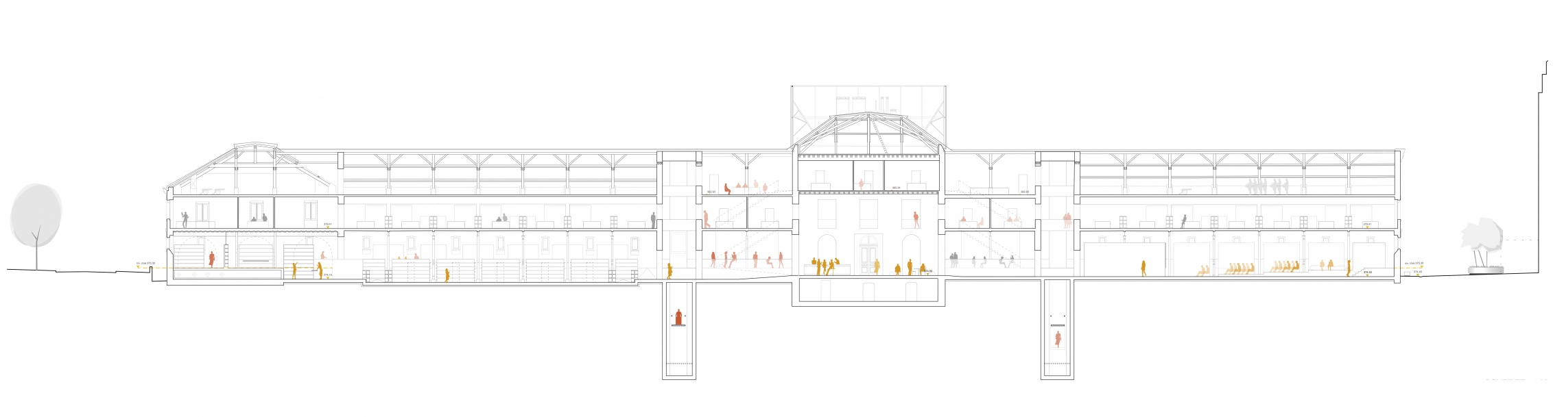 Les activités professionnelles sont disposées le long des façades rues relativement fermées, sur des planchers rehaussés qui permettent de disposer les places de travail à la juste hauteur des canonnières existantes et sous lesquelles court une galerie technique. La mise en place de ce niveau de référence ‘’professionnel’’ réhaussé prend assise sur une autre contingence du programme: tenir compte des crues exceptionnelles pour sécuriser les ouvrages et s’affranchir de venues d’eau dans les dépôts enterrés.