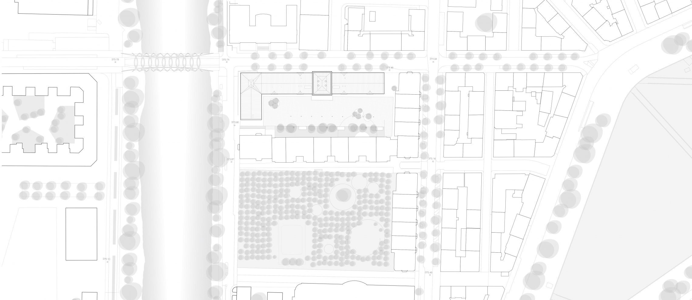La cour est considérée comme l’espace de référence de l’institution. Elle se présente comme une extension minérale du parc Baud-Bovy voisin duquel il reprend une partie de son langage formel. Le revêtement de sol présente l’empreinte des dépôts disposés en-dessous: les dalles en pierres naturelles et en métal gravé se jouent des nuances de couleur pour refléter la diversité et la richesse des documents conservés. Un nouvel alignement d’arbres et de colonnes lumineuses restituent une des allées principales qui structurait autrefois le complexe en fer en cheval de l’Arsenal originel.
