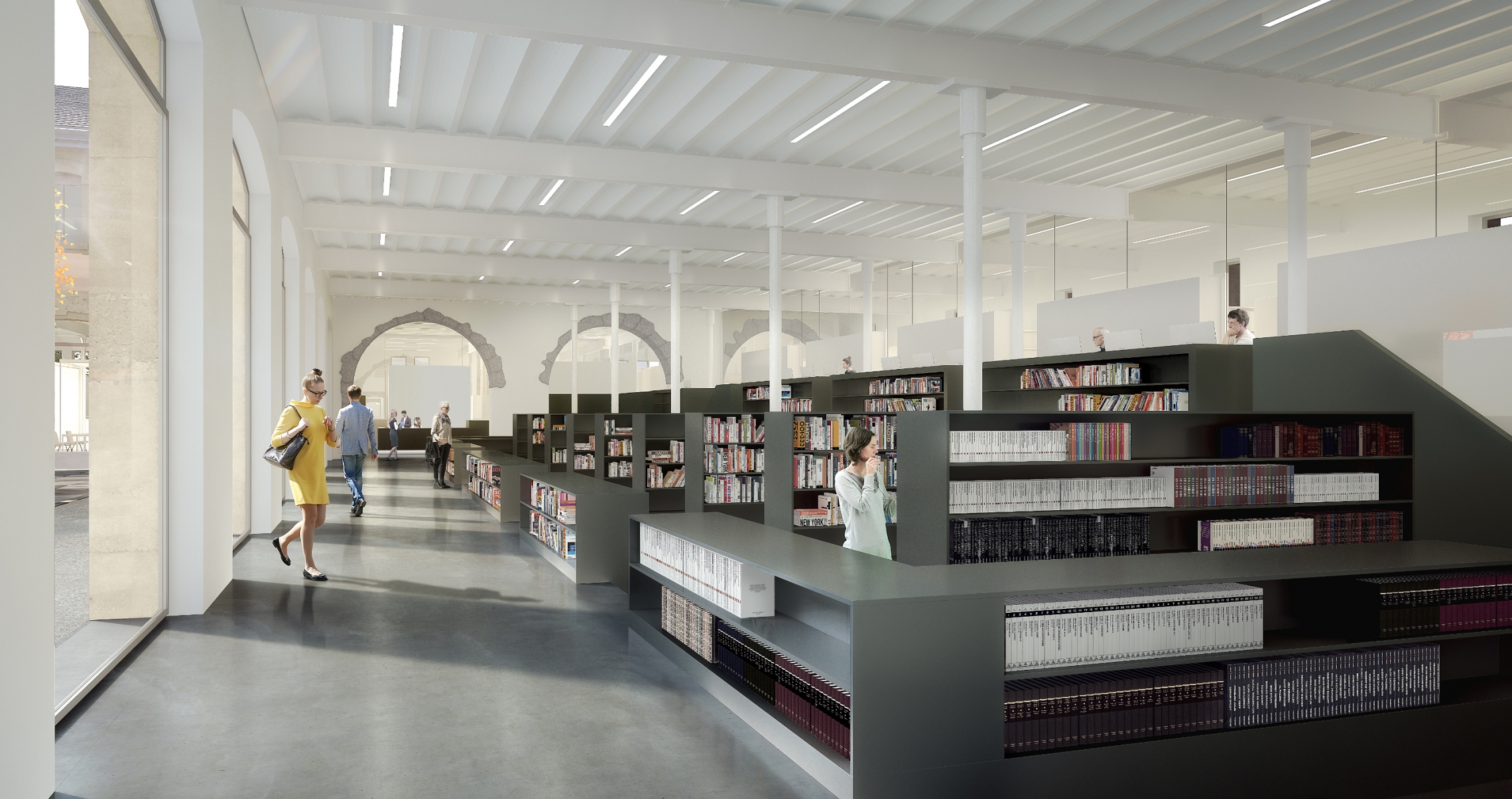 A l’intérieur, le projet propose la restitution et la mise en valeur de la substance patrimoniale de l’édifice dans les espaces publics. Ainsi, les colonnes métalliques forgées et enrobées de béton du rez-de-chaussée sont remplacées par des nouvelles colonnes présentant un élancement comparable. Le système porteur horizontal composé de poutres rivetées et de voutains longitudinaux est conservé et mis en valeurs dans les espaces majeurs.