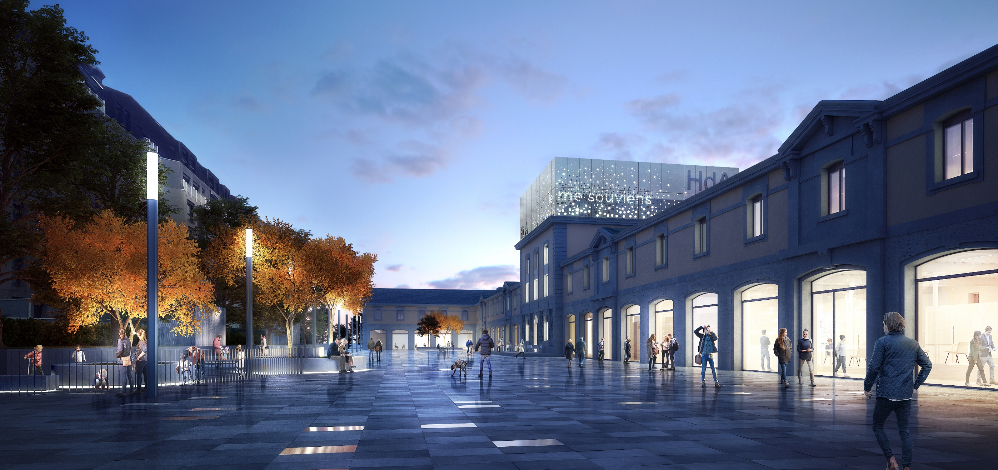 Le projet propose de compléter les interventions intérieures par un élément distinctif extérieur à l’attention du quartier. Masquant le coeur technique majeur de fonctionnement du bâtiment, une couronne lumineuse devient la coiffe de l'austère bâtisse militaire. Ce signal matérialise ainsi la mutation sémantique de l'oeuvre de Marc Camoletti, dans un quartier à la vie nocturne revendiquée où l'enseigne lumineuse commerciale cohabite désormais avec l'enseigne lumineuse artistique.