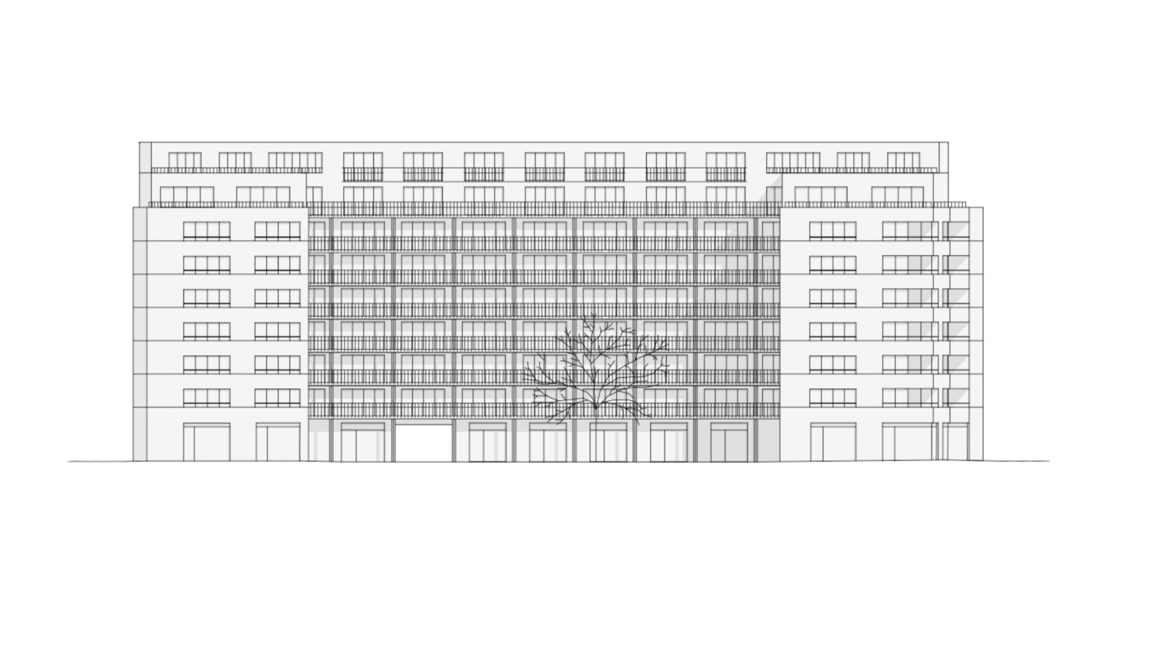 L’immeuble est constitué d’un rez- de-chaussée et de huit étages, dont deux en léger retrait. Ces retraits assurent la transition d’échelle entre le front de la route des Plaines- du-Loup et ses voisins. De grandes terrasses accompagnent l’orientation majeure des appartements dont la typologie traversante se tourne vers la nature.