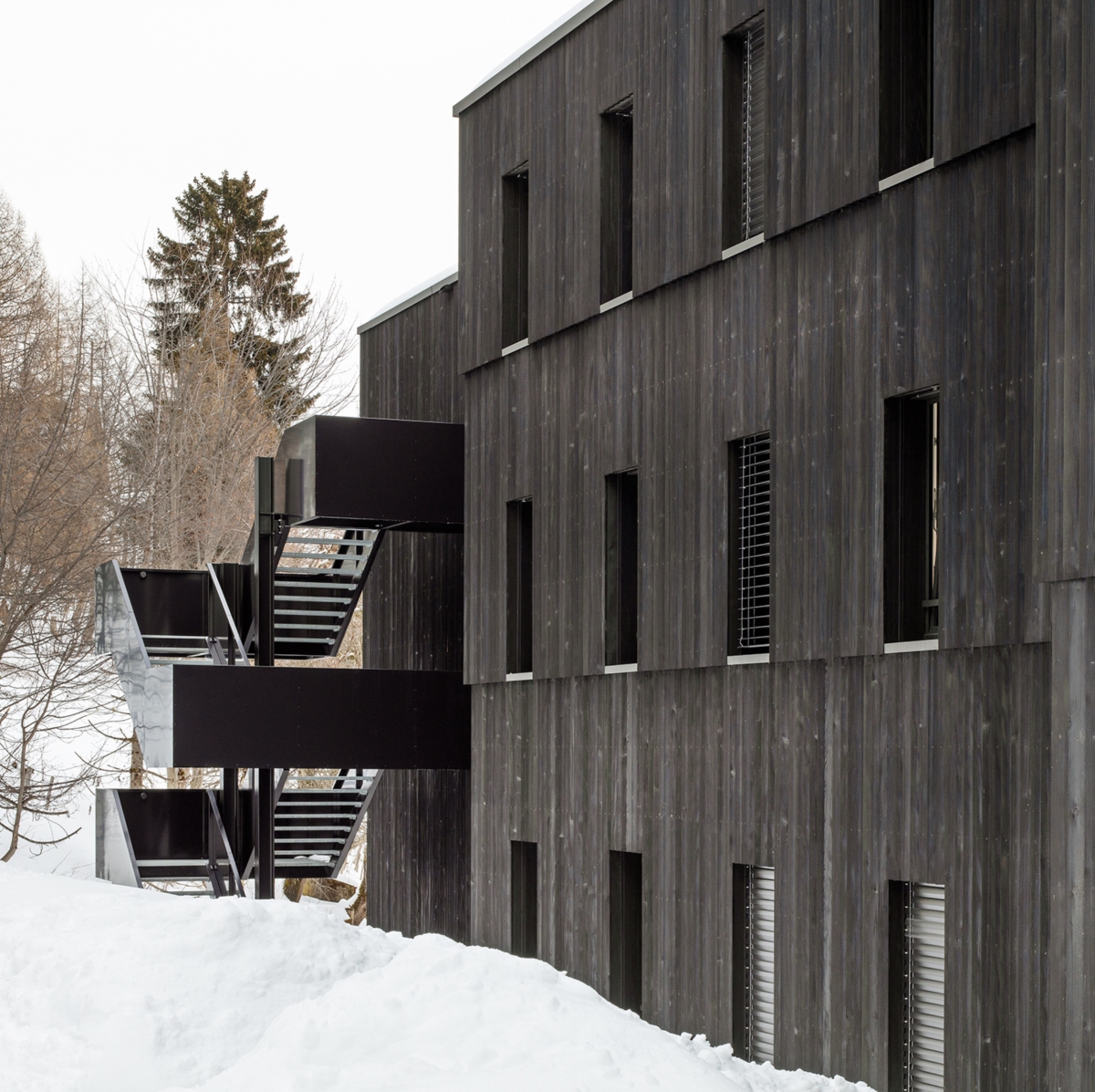 L’enveloppe joue sur de très subtils décalages de plans entre les niveaux et sur l’assemblage des lames à clin qui génèrent un jeu d’ombres et de lumières dans un univers boisé. Le caractère très obscur de la peau renvoie à certains tableaux de Pierre Soulages et rappelle l’image de l’ancien chalet sis sur la parcelle dont le bois avait foncé sous les rayons du soleil.