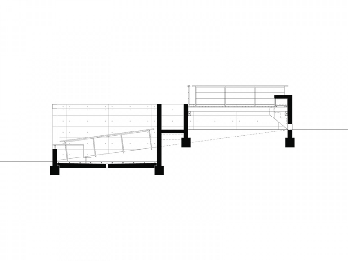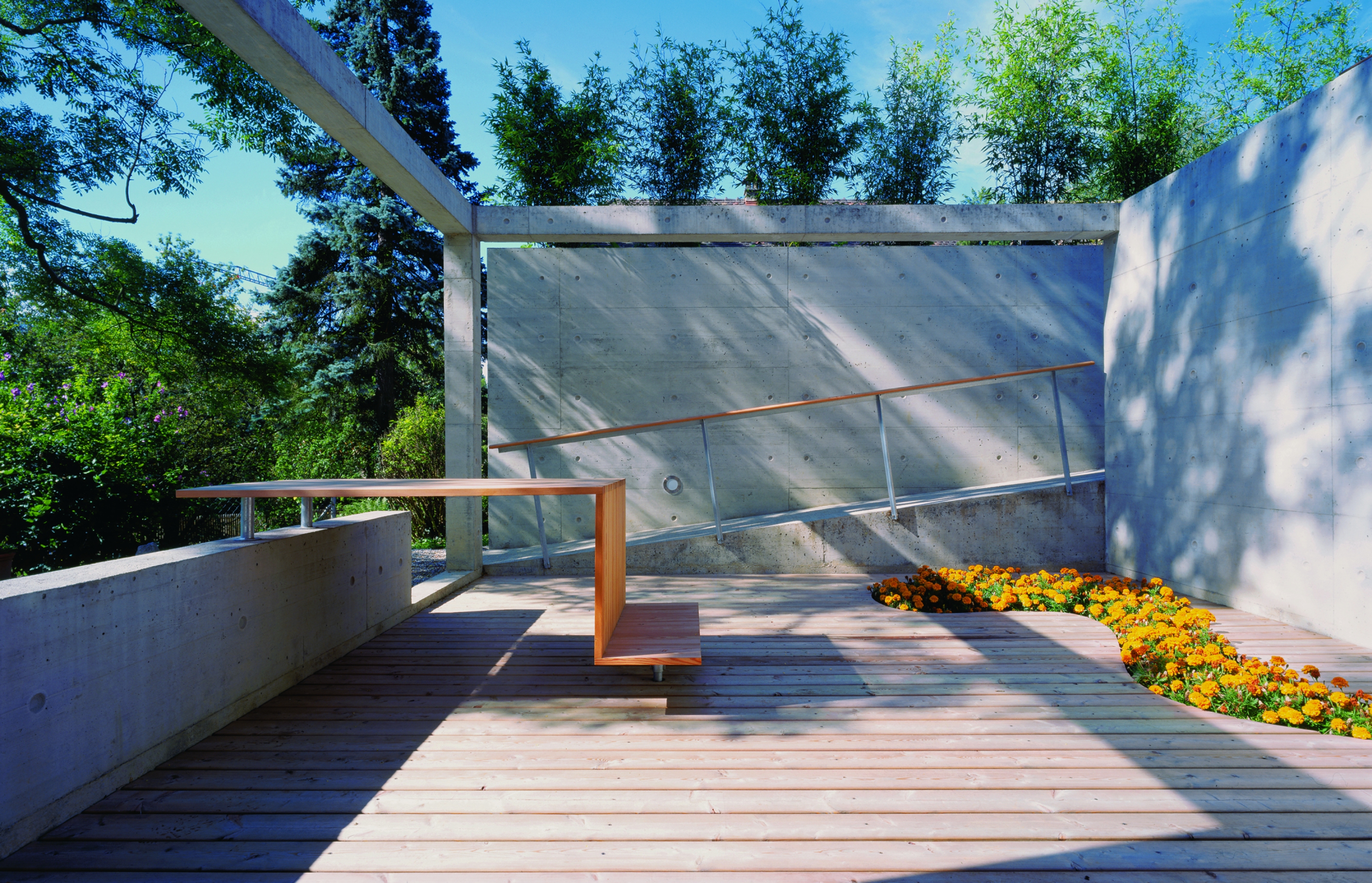 La matière qui s’inscrit en rapport dialectique avec le béton de l’enceinte est le bois naturel, un mélèze qui habille les decks, la table et les mains courantes. Le dessin de la mise en œuvre a fait l’objet d’un calepinage rigoureux dont la métrique renforce l’abstraction de l’intervention.