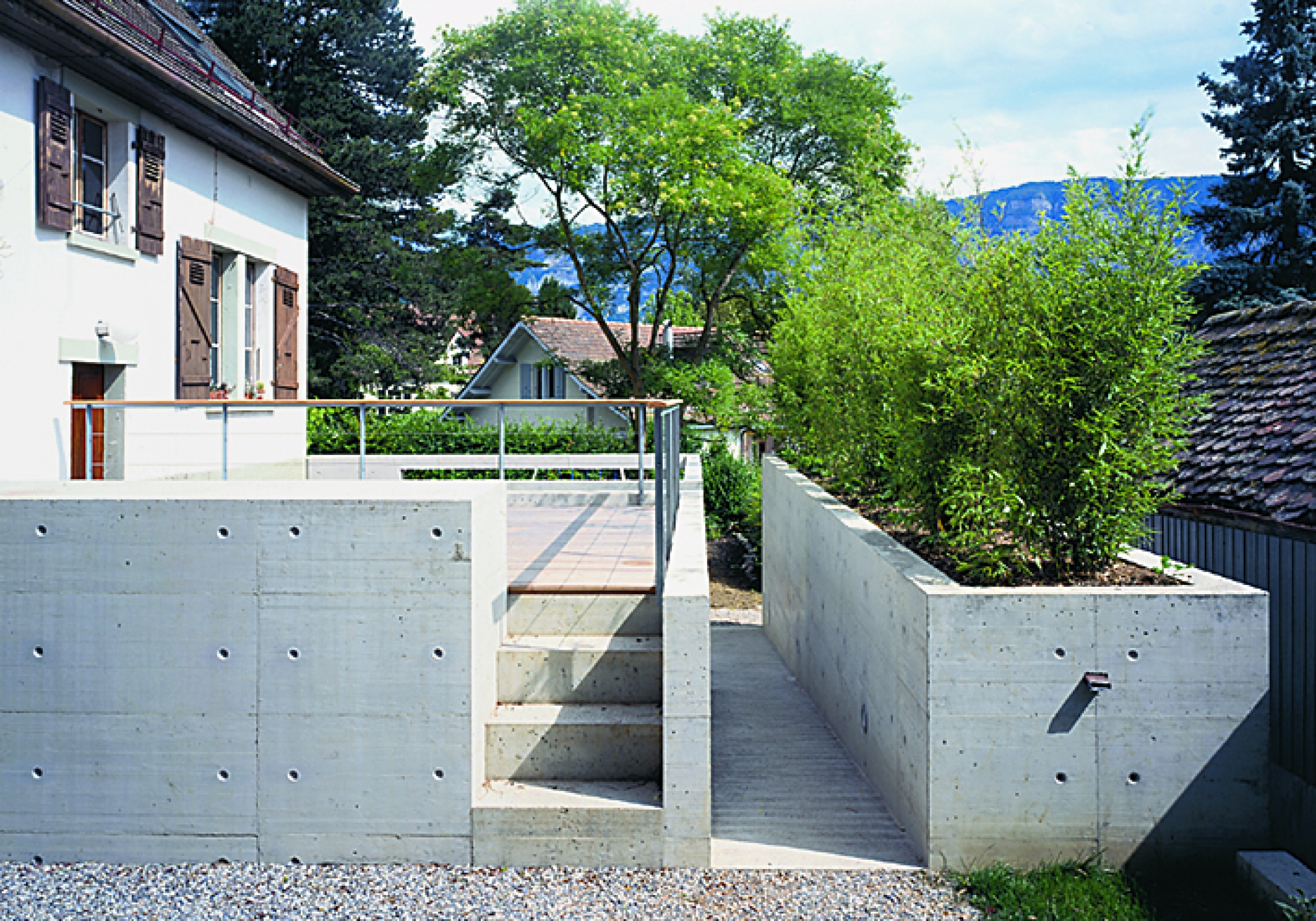 Dans le cadre de la transformation d’une maison du début du vingtième siècle, ce projet d’aménagements extérieurs cherche à construire un nouveau paysage. Un dispositif géométrique en béton prolonge les espaces intérieurs contigus en reprenant la typologie intérieure de la maison, sous la forme de deux 'chambres extérieures': l’une s’inscrivant en positif devant la pièce de jour : la terrasse, et l’autre en négatif devant une chambre nouvellement créée: le patio.