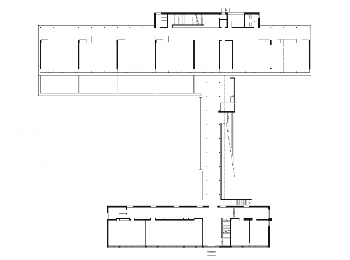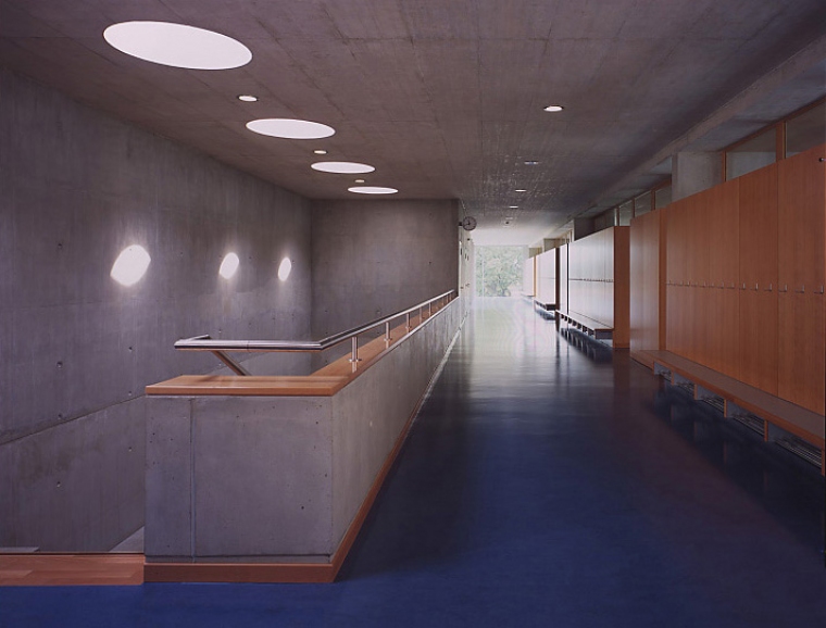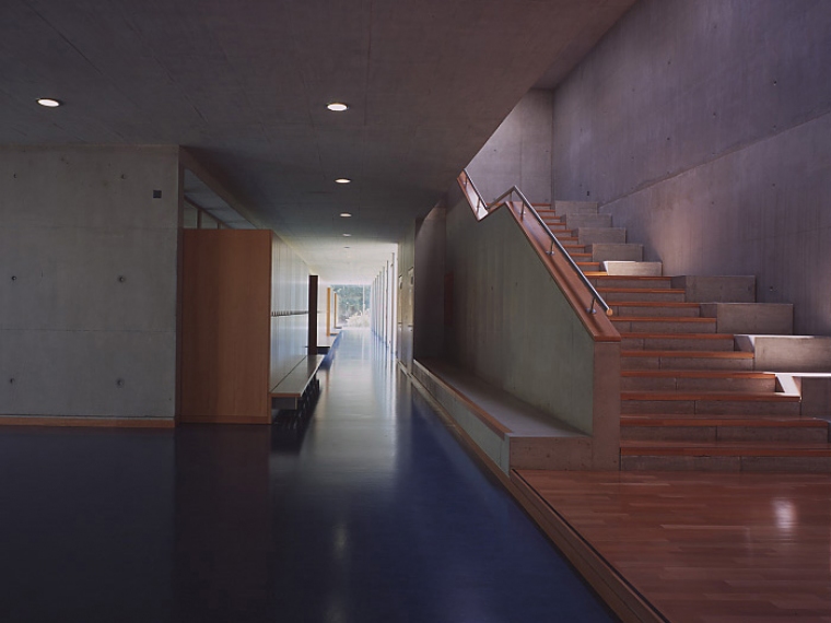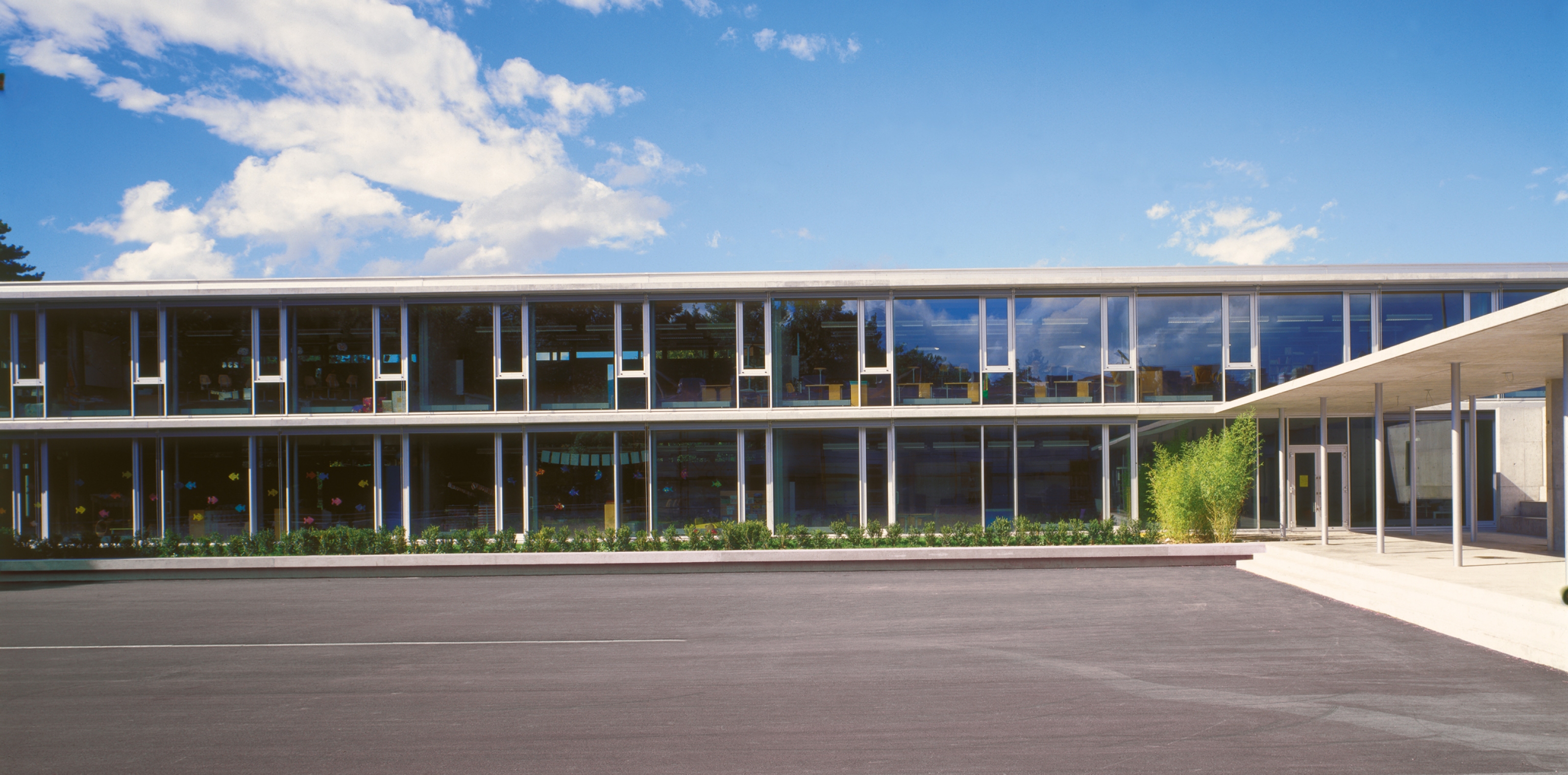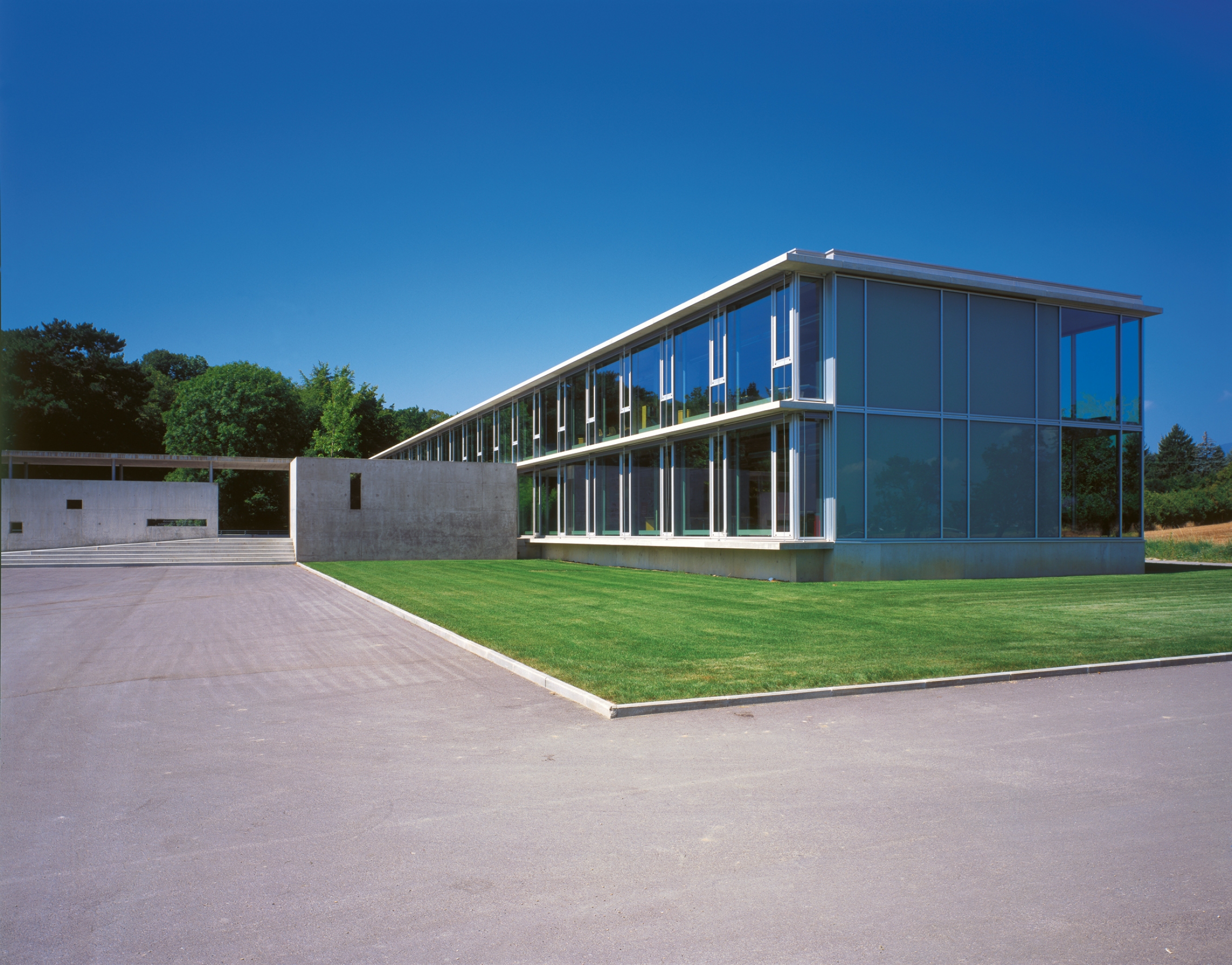 Le rapport structure-enveloppe est envisagé de telle manière à utiliser, à l’intérieur, un minimum de matériaux et de rendre lisible la présence de la structure. C’est la coupe, par sa transparence qui révèle le caractère traversant du lac au Jura. La façade-rideau en verre permet l’appropriation totale de ce paysage que ce soit depuis les classes ou depuis les couloirs.
