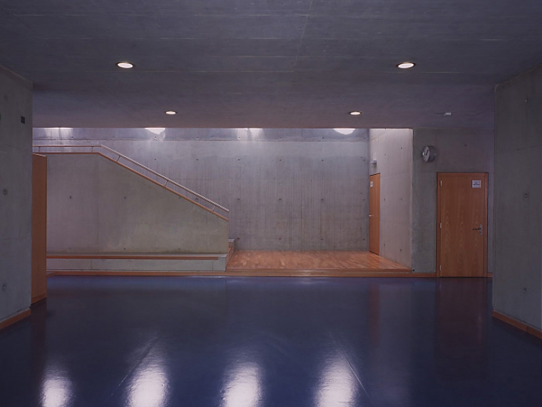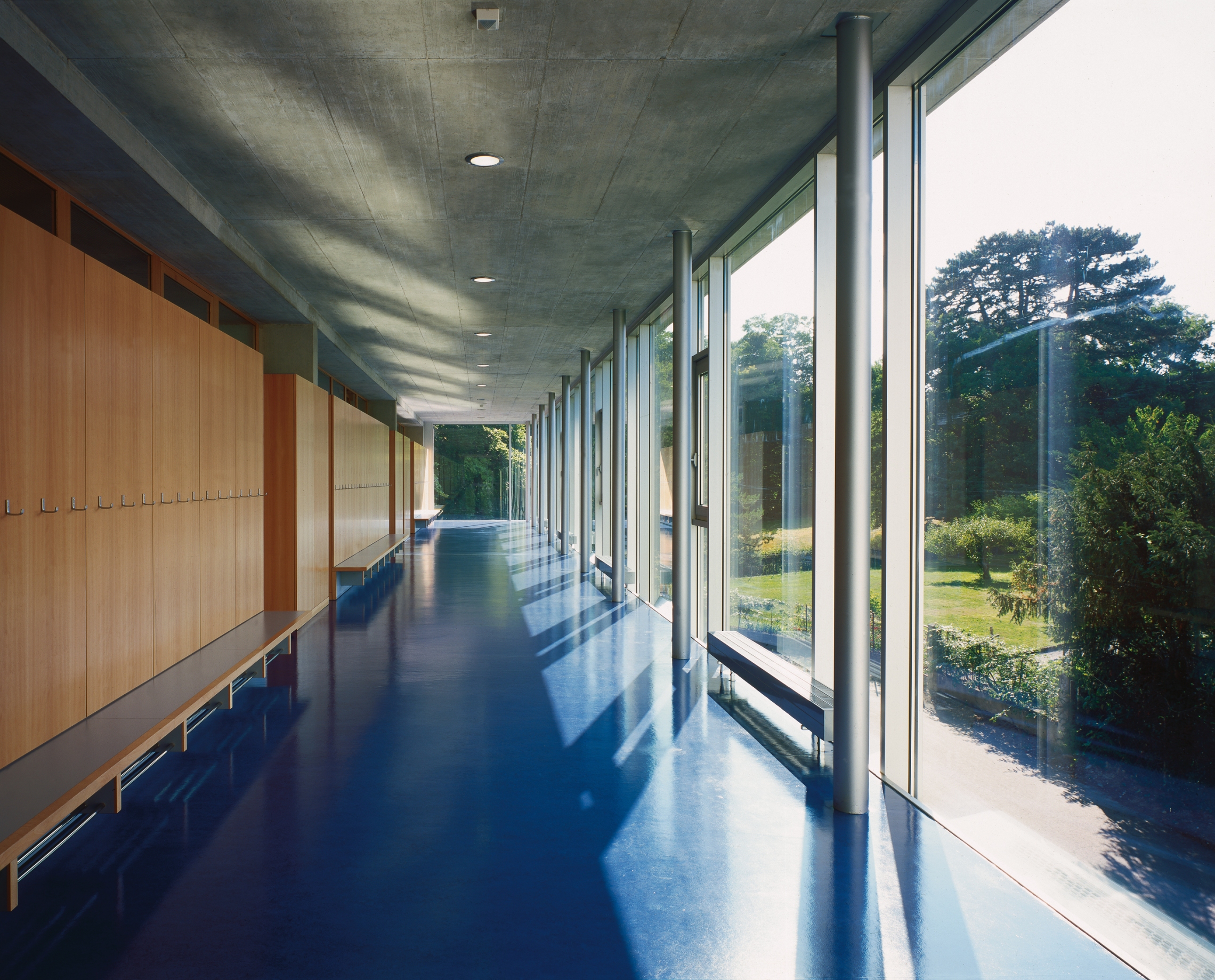 Le collège est constitué d’un système porteur lamellaire en béton définissant chacun des espaces de classes et d’une façade vitrée périphérique. La séparation classes - couloirs s’affirme à travers un élément non porteur constitué d’armoires et de hauts-jours en hêtre naturel. Les revêtements de plafonds des classes sont eux aussi traités dans la même essence. L’ensemble des sols est unifié par un linoléum de couleur bleue.