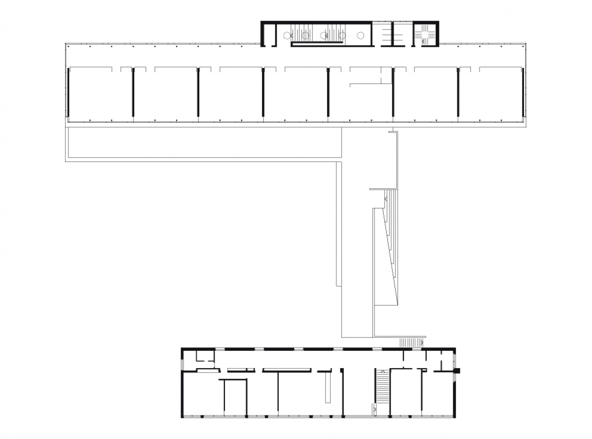 Le nouveau bâtiment accueille au rez-de-chaussée quatre classes enfantines prolongées sur l’extérieur par des « classes extérieures » pour les plus petits élèves, permettant une transition entre le préau et la façade. A l’étage, sept modules de classes identiques se suivent le long d’une coursive intérieure vitrée sur le paysage. Au nord un bloc de service comprend les escaliers, les sanitaires et les locaux de nettoyage.
