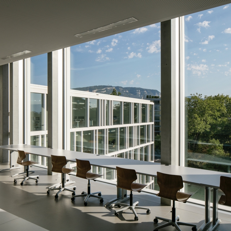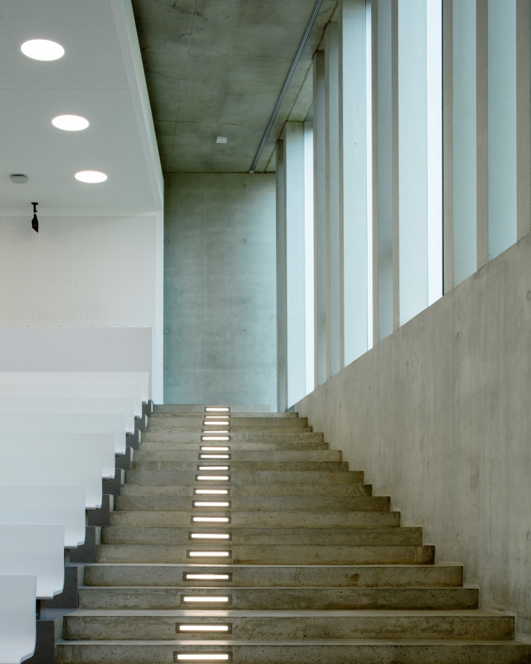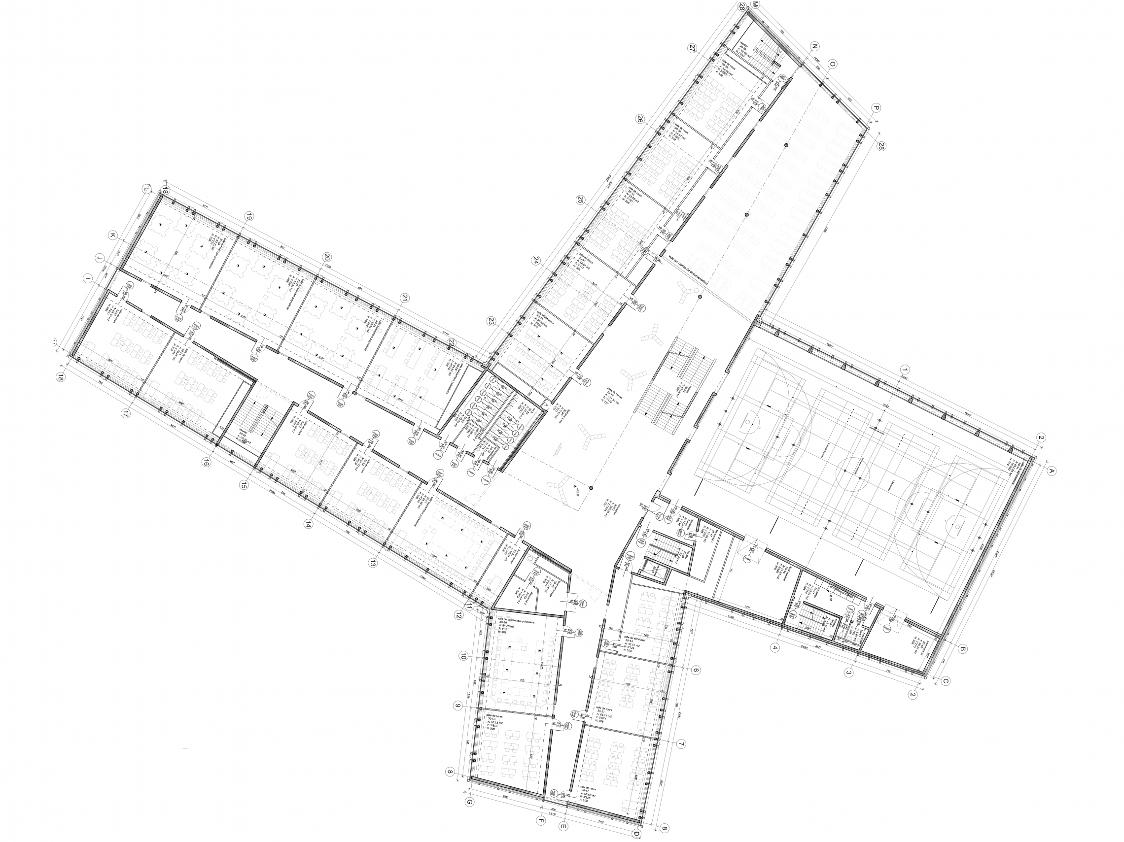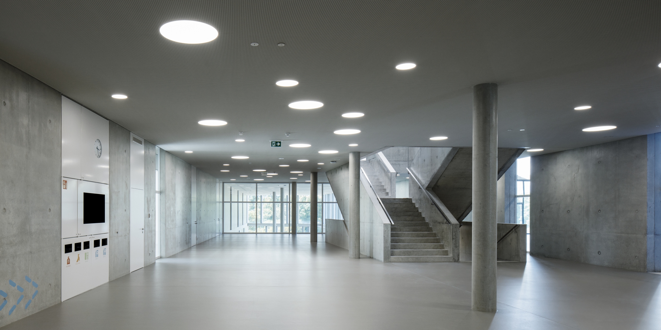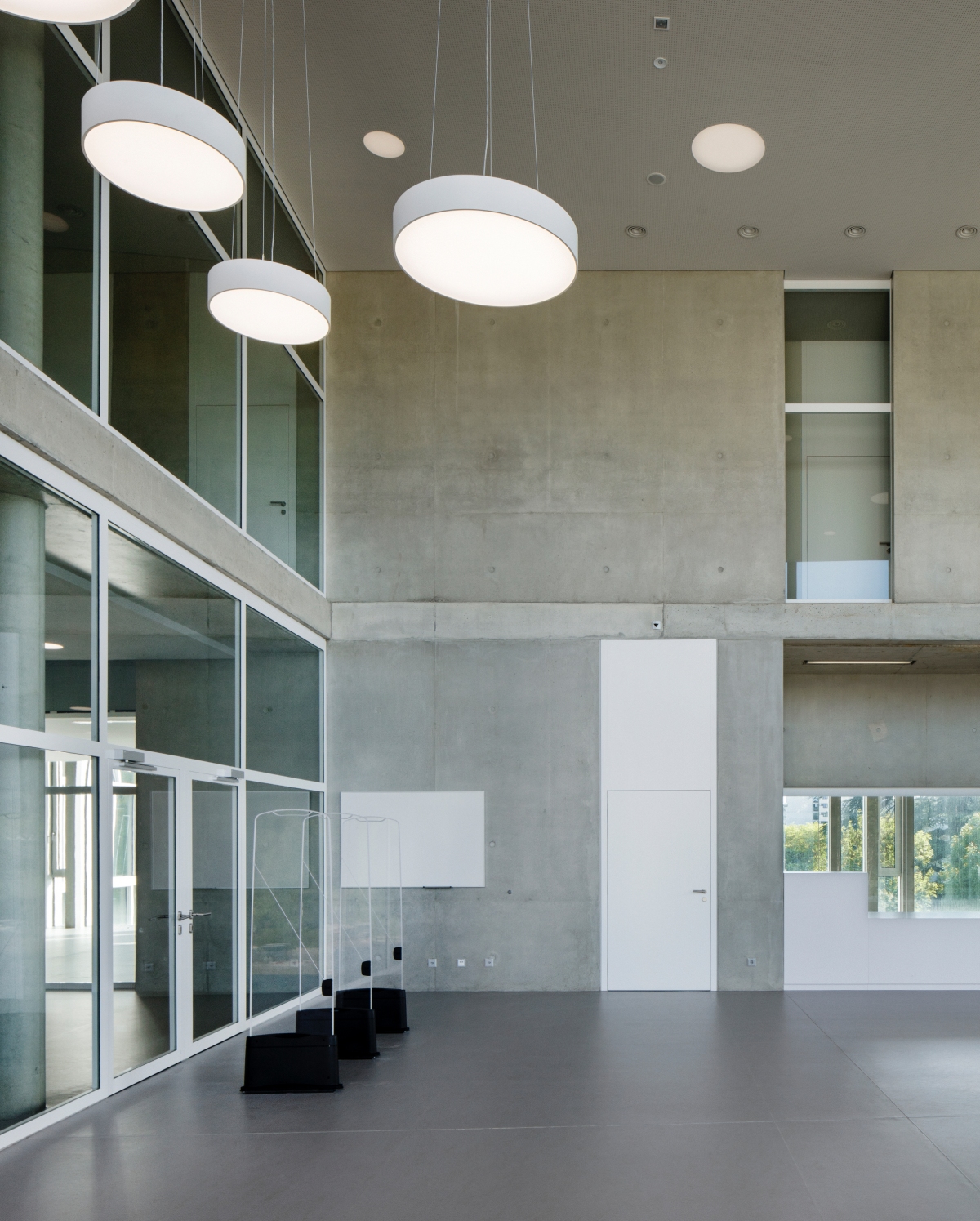 Disposées 'en étoile' autour du cœur distributif, les salles de classes et salles spéciales s’égrainent le long de murs en béton brut apparent, percés de fines césures de lumière. Dans la branche nord-ouest de l’école se situent les éléments programmatiques communs : la cafétéria, la salle des maîtres, la médiathèque (avec un double niveau) et une salle polyvalente.