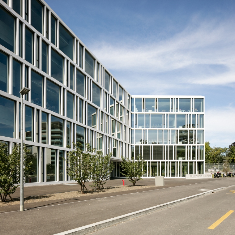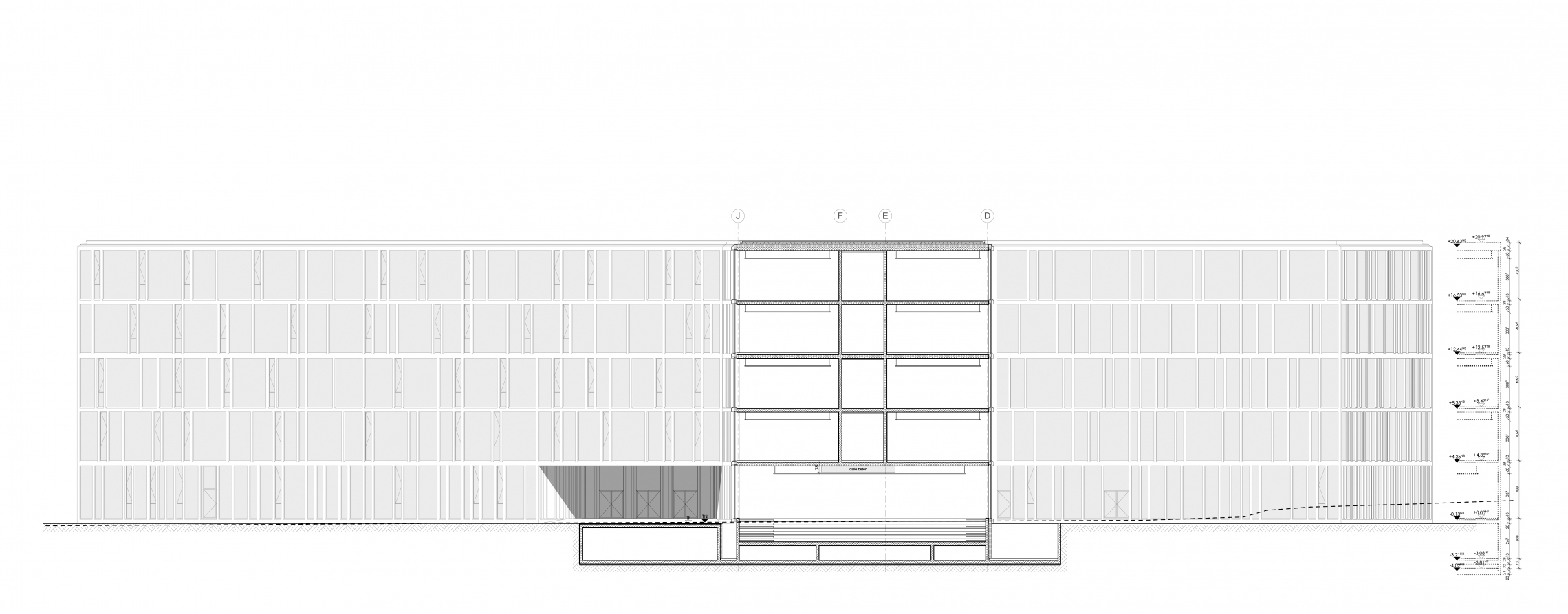 Les façades sont constituées d’éléments préfabriqués en béton haute performance, dont la rythmique évoque la structure d’un arbre. Une plus grande densité de porteurs en bas, s’allégeant vers le haut, allant ainsi dans le sens naturel de la diminution des efforts.
