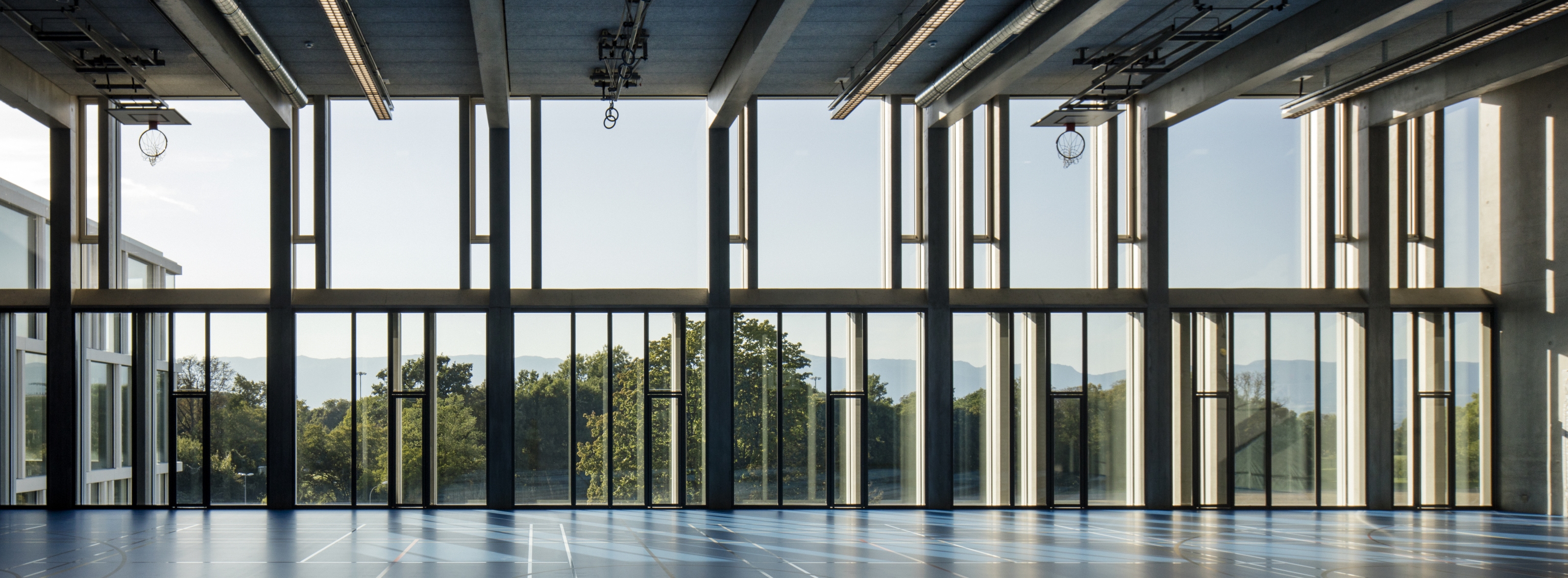 Ouvrant ses 'bras' au paysage lointain (Salève, Voirons, Jura, etc), l’école s’insère dans un monde végétal dont elle est le prolongement artificiel. Afin de limiter l’impact sur le sol, les trois salles de gymnastique ont été superposées. Ce dispositif en coupe, permet non seulement d’avoir des vues dans les salles depuis les espaces de distribution, mais aussi d’éclairer naturellement ceux-ci par l’apport de lumière des salles elles-mêmes.