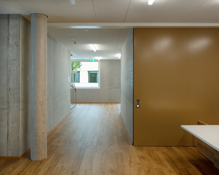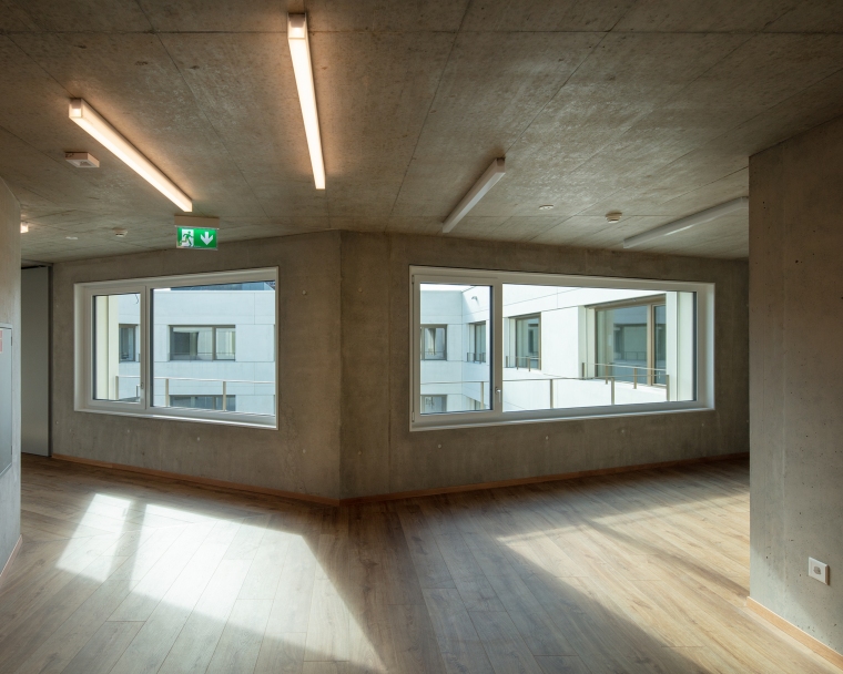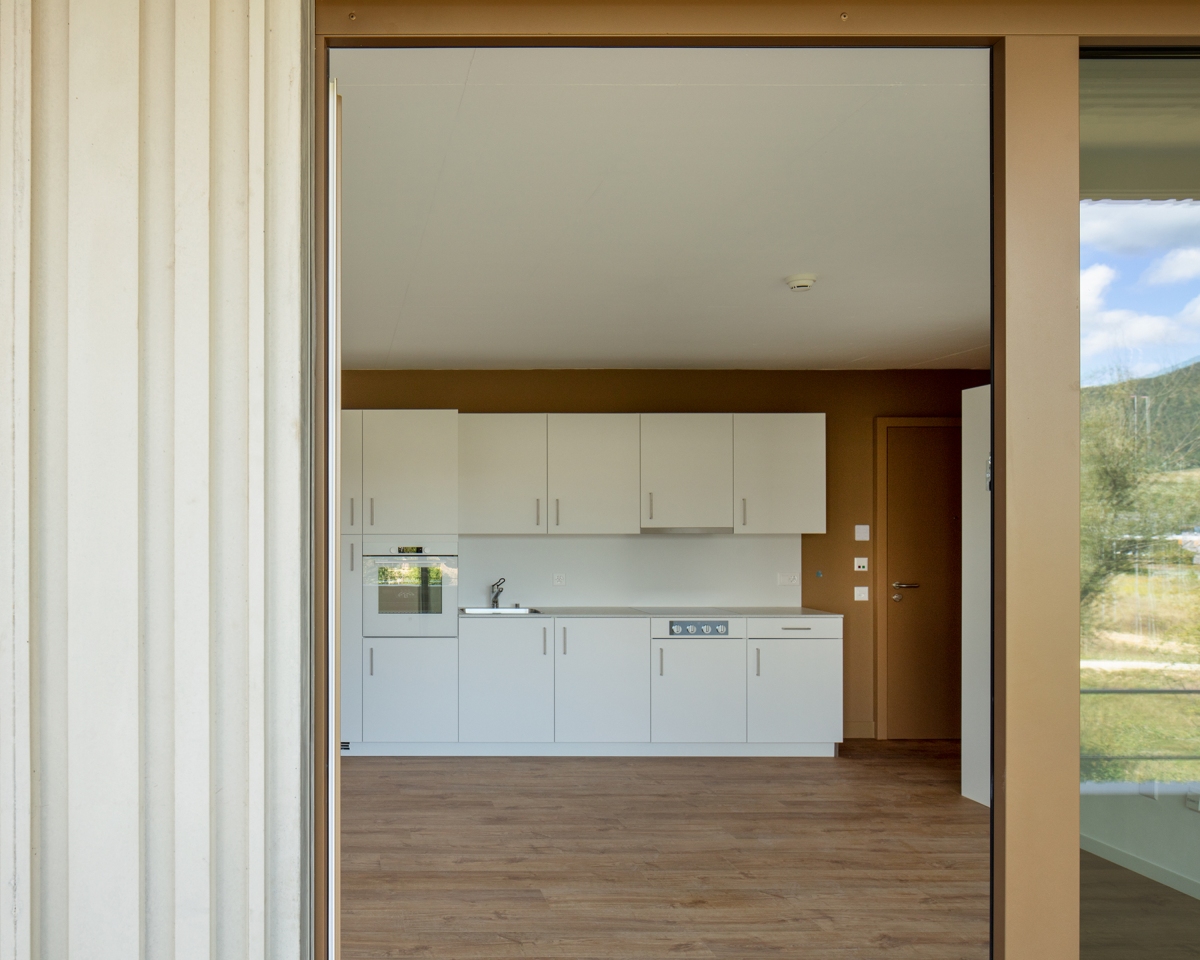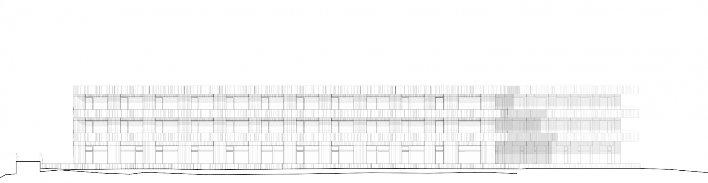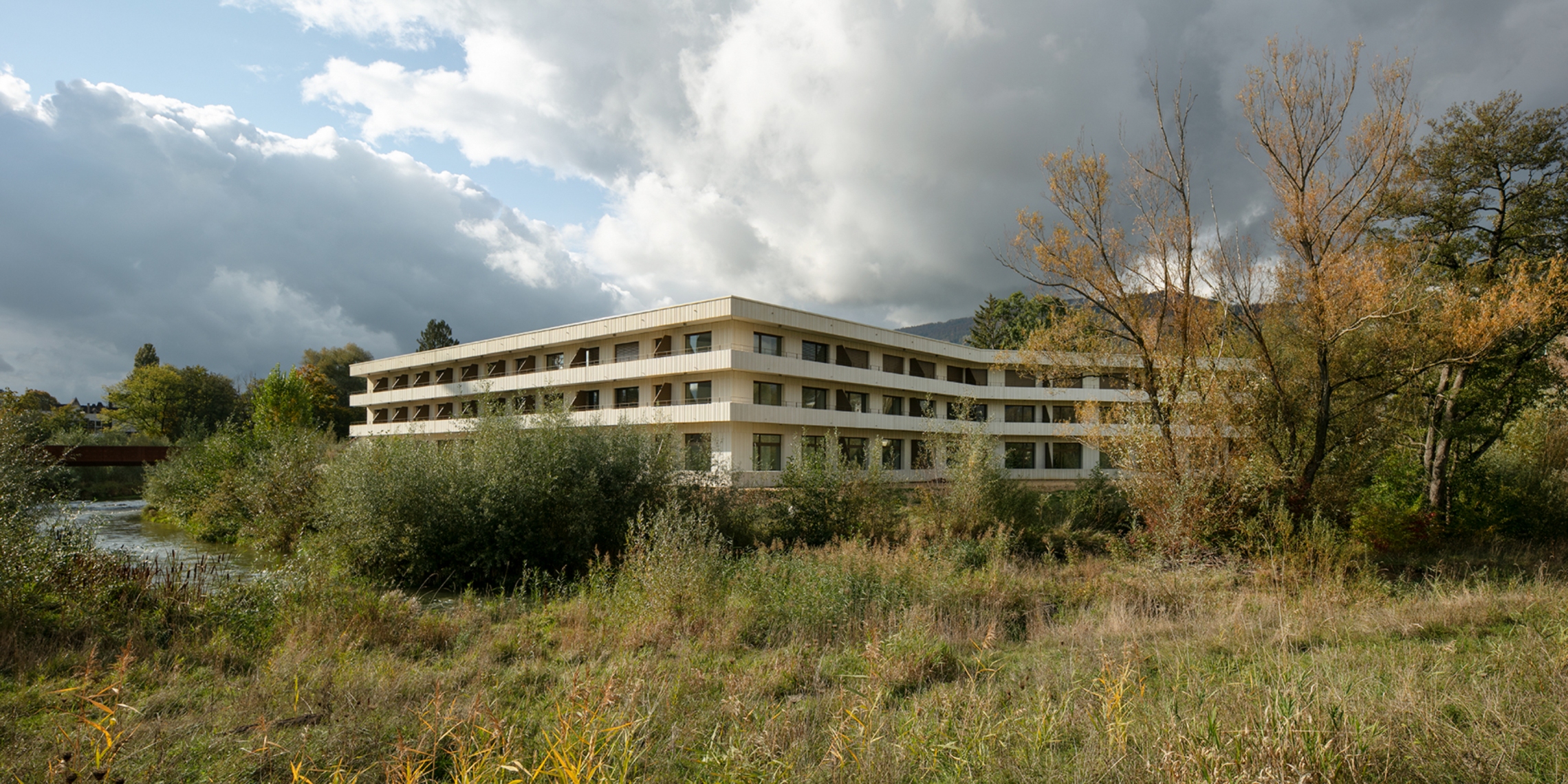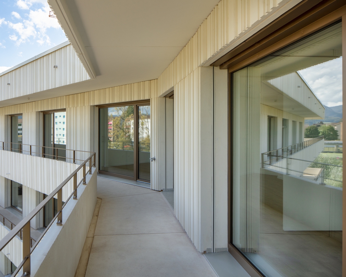 Niché au creux d’un méandre de la Sorne, le bâtiment se plie pour épouser les contours de l’environnement : le long de la rivière de larges terrasses s’ouvrent sur le monde végétal induit par l’hydrologie ; au nord le volume de faible gabarit s’inscrit dans la continuité du paysage bâti existant. Au cœur de cette forme hybride s’installe une cour ouverte à destination des aînés de l’institution. Les distributions horizontales bénéficient de l’apport de lumière de cette centralité et permet des parcours de qualité pour rejoindre son espace privé domestique, tout en faisant office de lieu de référence et de repérage.
