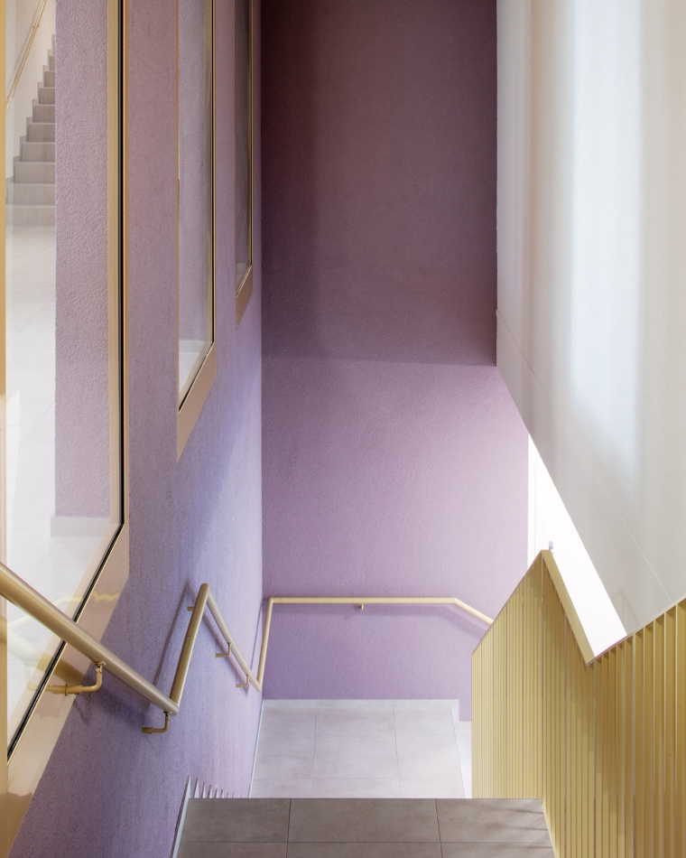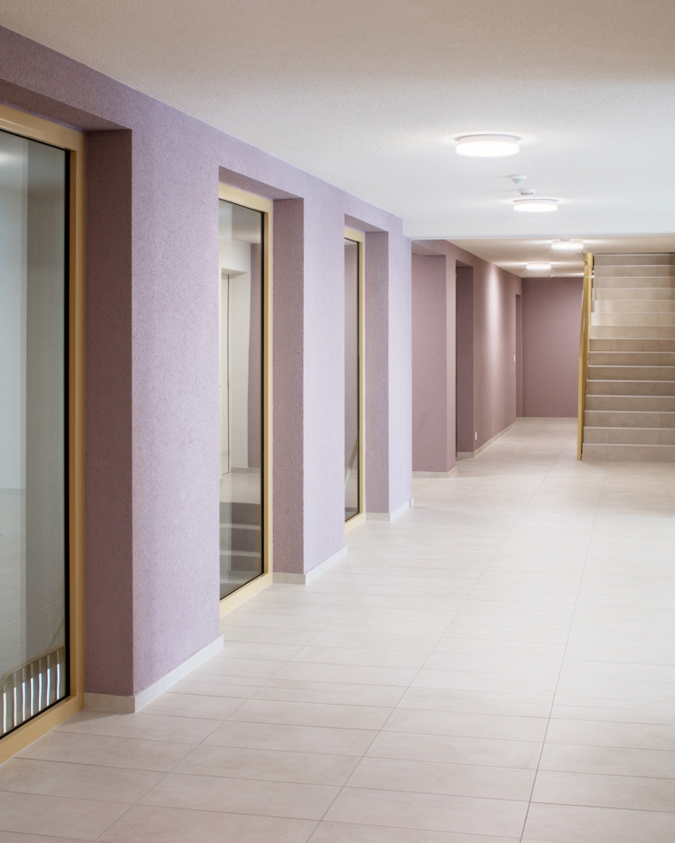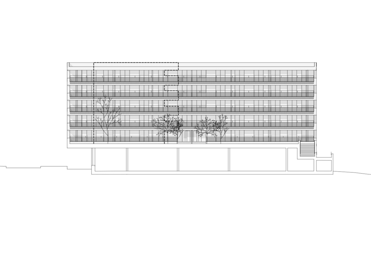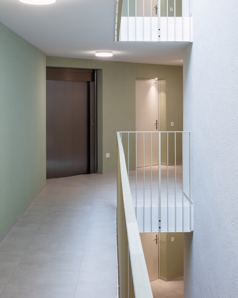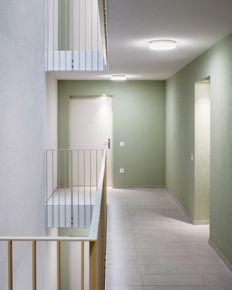 Aux étages, les deux types d’habitat sont clairement dissociés autour du jardin suspendu, lequel est relié avec le sol naturel par un grand escalier. Au nord, l’immeuble rectiligne accueille des appartements traversants et sur les angles, offrant des vues lointaines sur l’environnement. Le hall s’inscrit dans une coupe qui permet de relier la voie de desserte au jardin intérieur. Dans les logements destinés aux seniors, l’entrée en double hauteur relie également la rue à la terrasse, espace de délassement au bénéfice des usagers. La salle commune y trouve un emplacement stratégique. Au-dessus, les logements s’égrainent autour d’une longue cage d’escaliers dont la forme pliée offre des jeux d’ombre et de lumière.