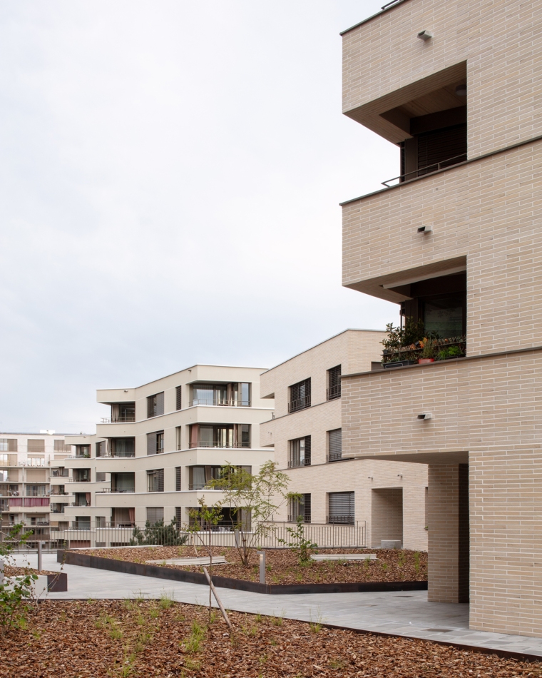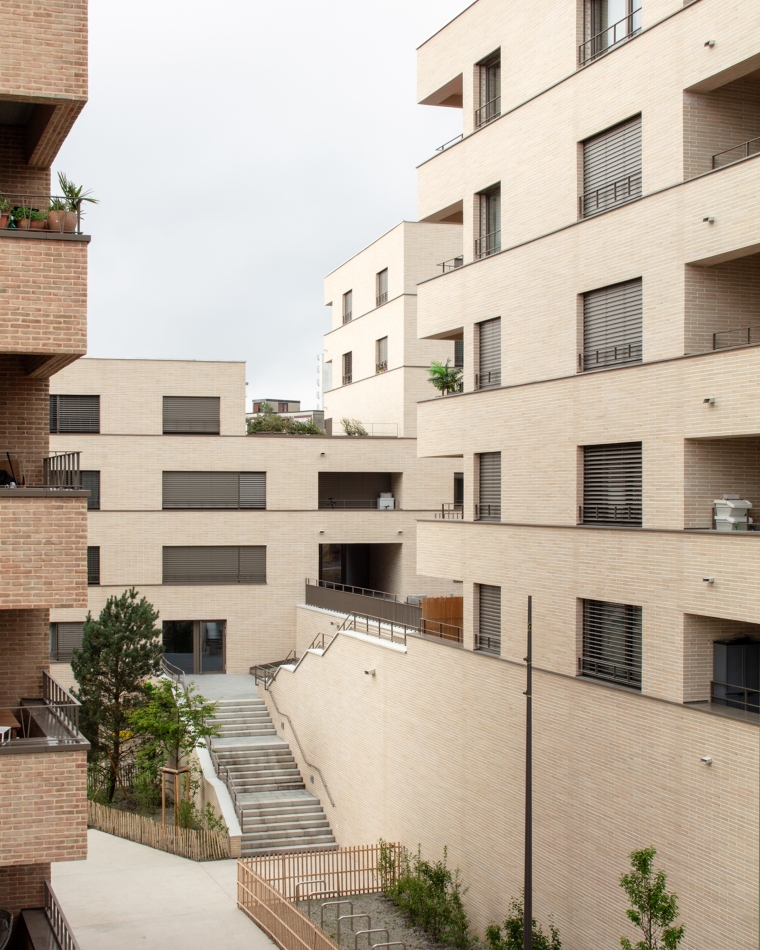 L’expression des façades se met en syntonie avec les autres édifices de la pièce urbaine : des terrasses continues, des balcons, des garde-corps en serrurerie ou un revêtement en brique cherchent des parentés avec les immeubles voisins. La matérialité intérieure revêt un caractère domestique avec un crépi coloré dans les espaces communs et la présence de bois naturel dans les plafonds des logements. L’ensemble bâti répond aux critères stricts d’un éco-quartier durable.