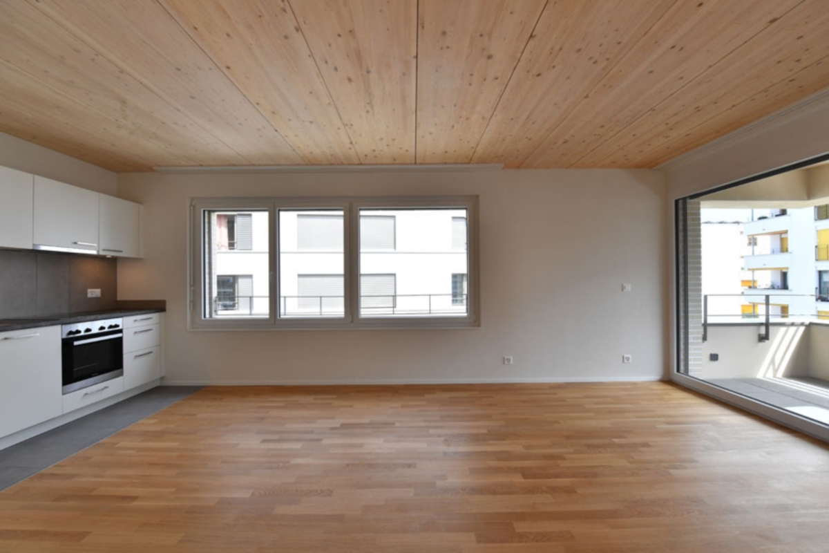 Le bâtiment situé à l’ouest de la pièce urbaine « B » se compose de deux volumes posés distincts, sur un socle. L’ensemble réalisé s’inscrit dans la silhouette du quartier qui cherche à reproduire une courbe dont le centre est plus bas que les extrémités. La disposition des immeubles offre une percée visuelle depuis l’espace semi-public situé sur la toiture-jardin, vers le grand paysage lacustre.