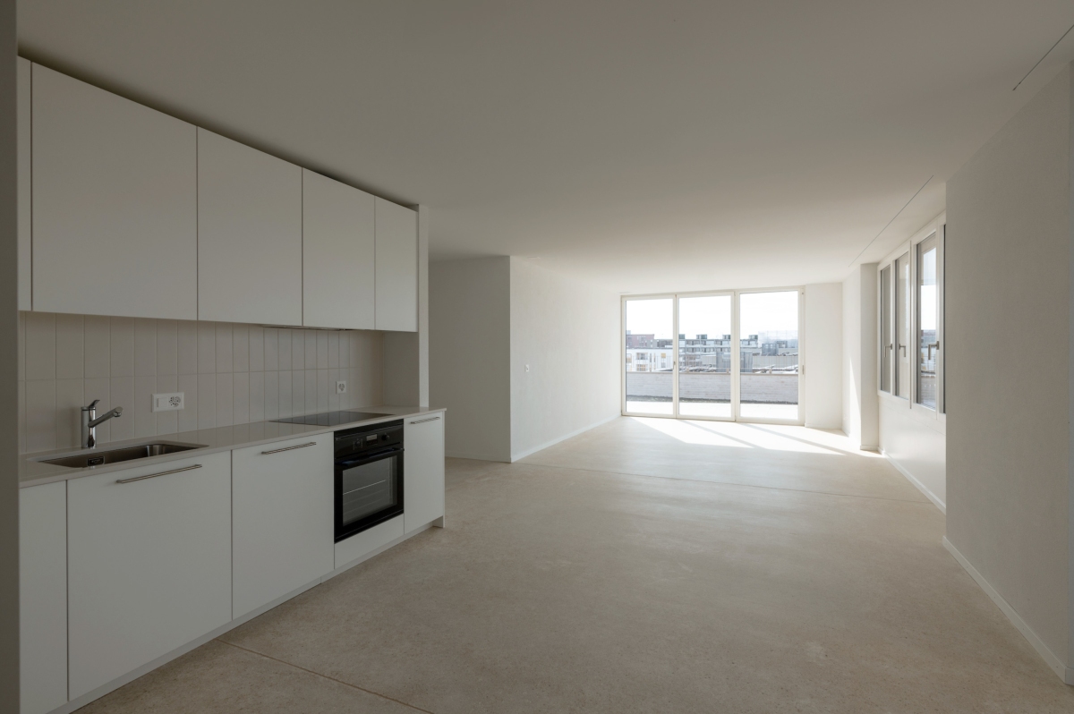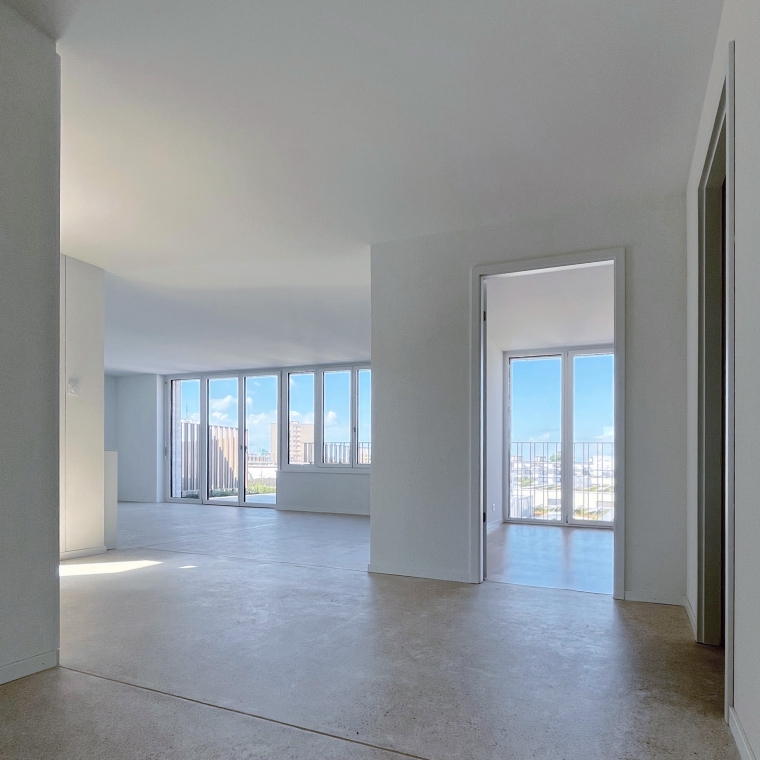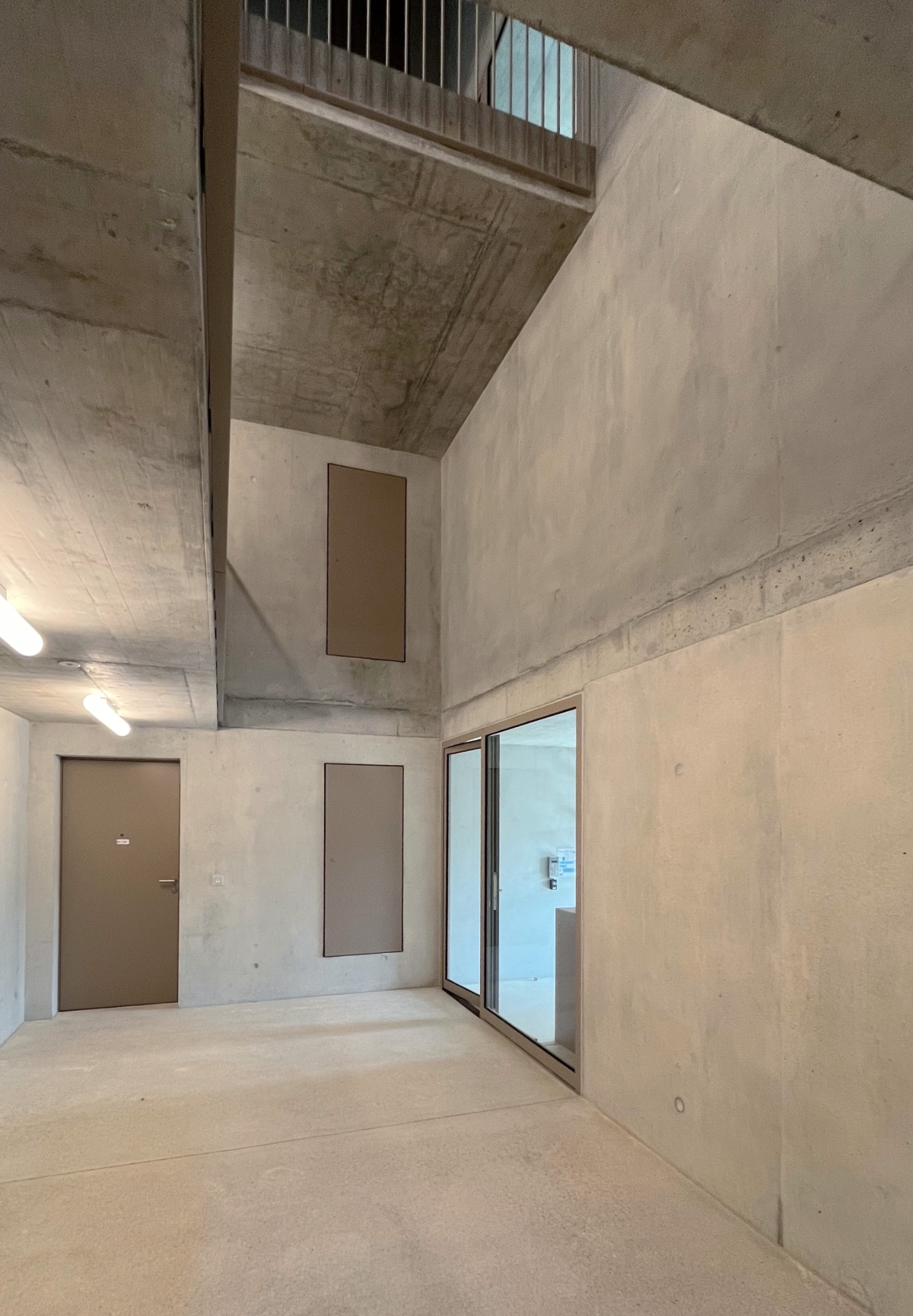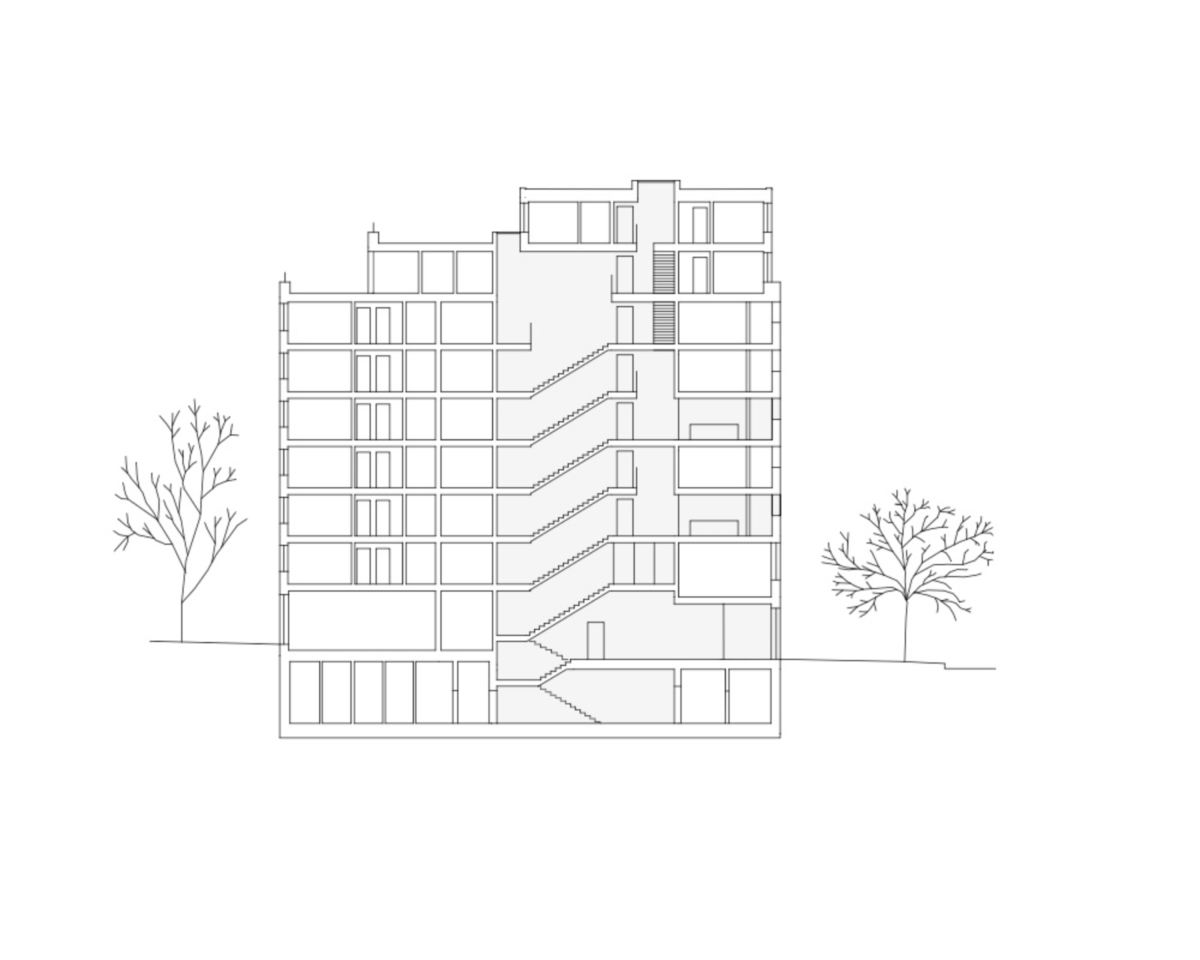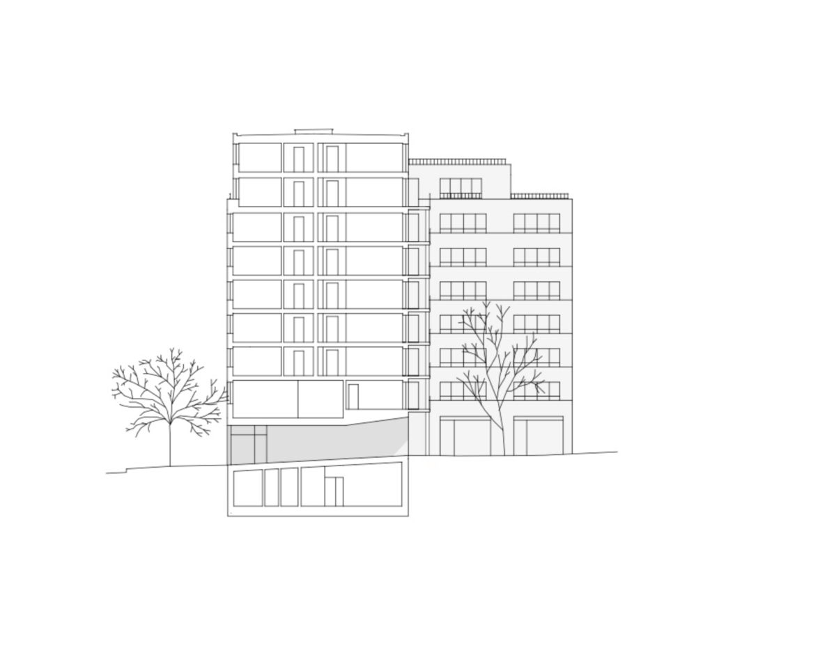 L’immeuble est constitué d’un rez- de-chaussée et de huit étages, dont deux en léger retrait. Ces retraits assurent la transition d’échelle entre le front de la route des Plaines- du-Loup et ses voisins. De grandes terrasses accompagnent l’orientation majeure des appartements dont la typologie traversante se tourne vers la nature.