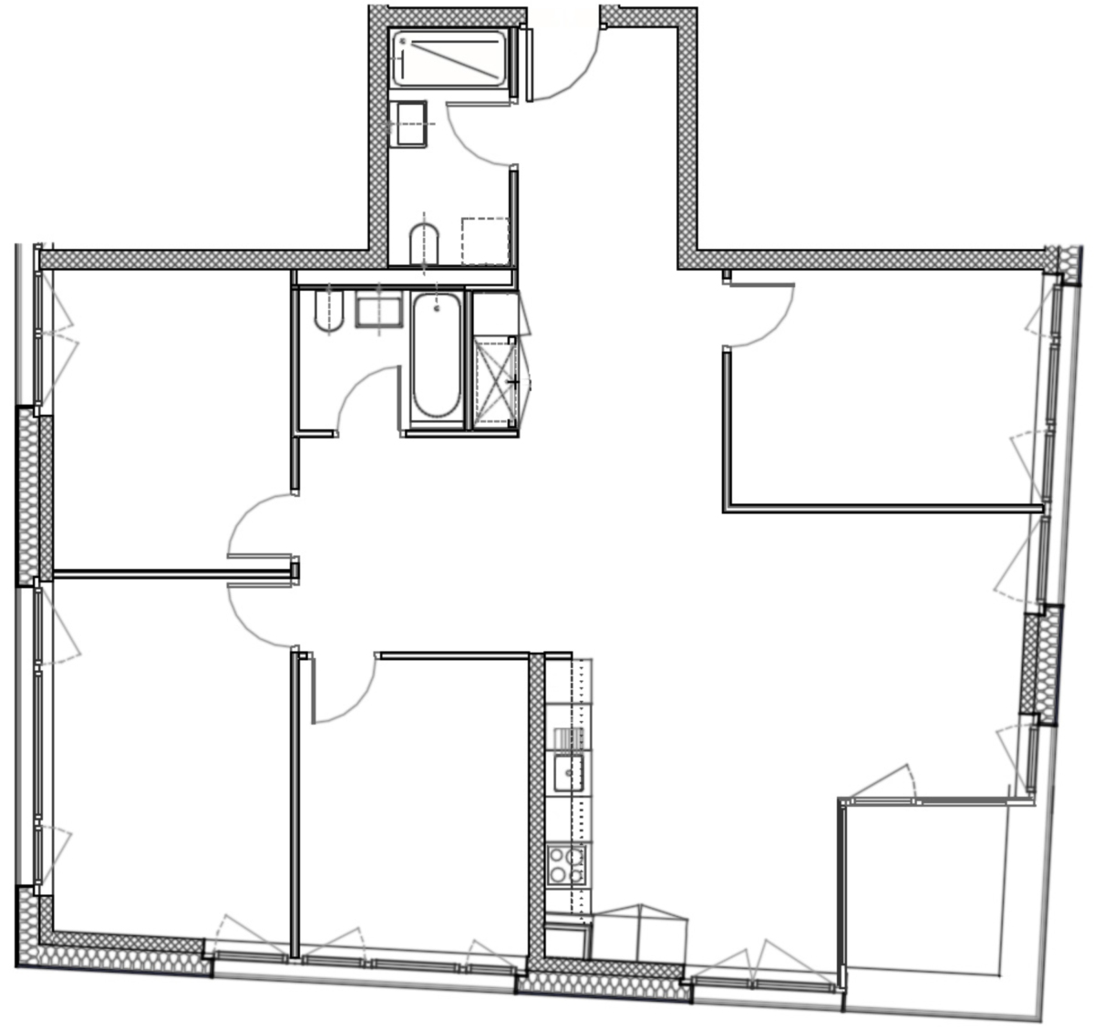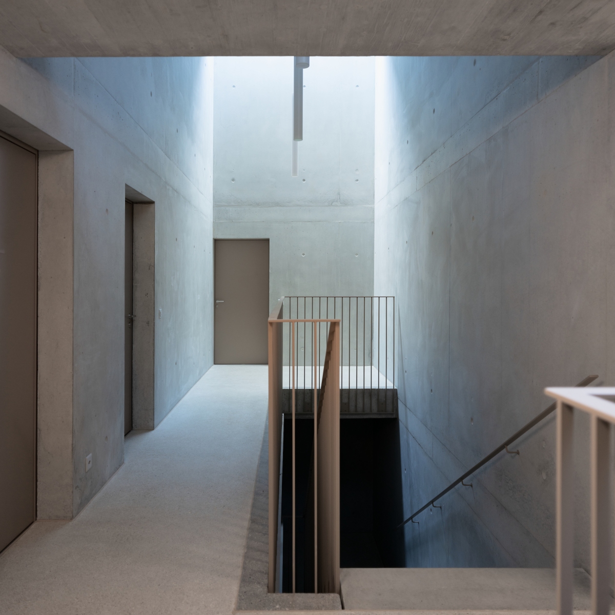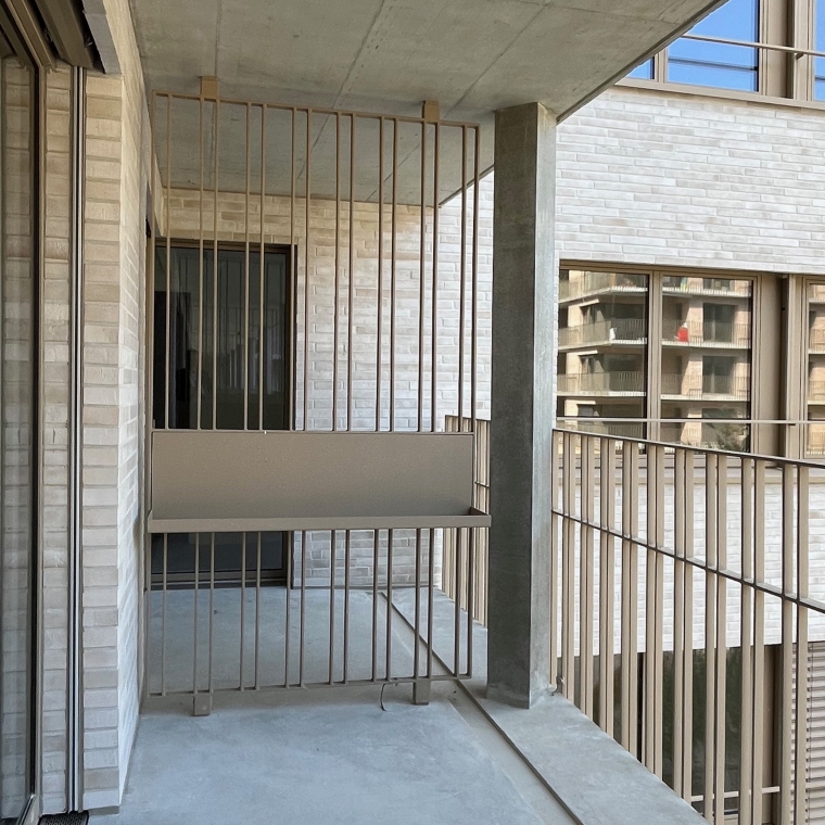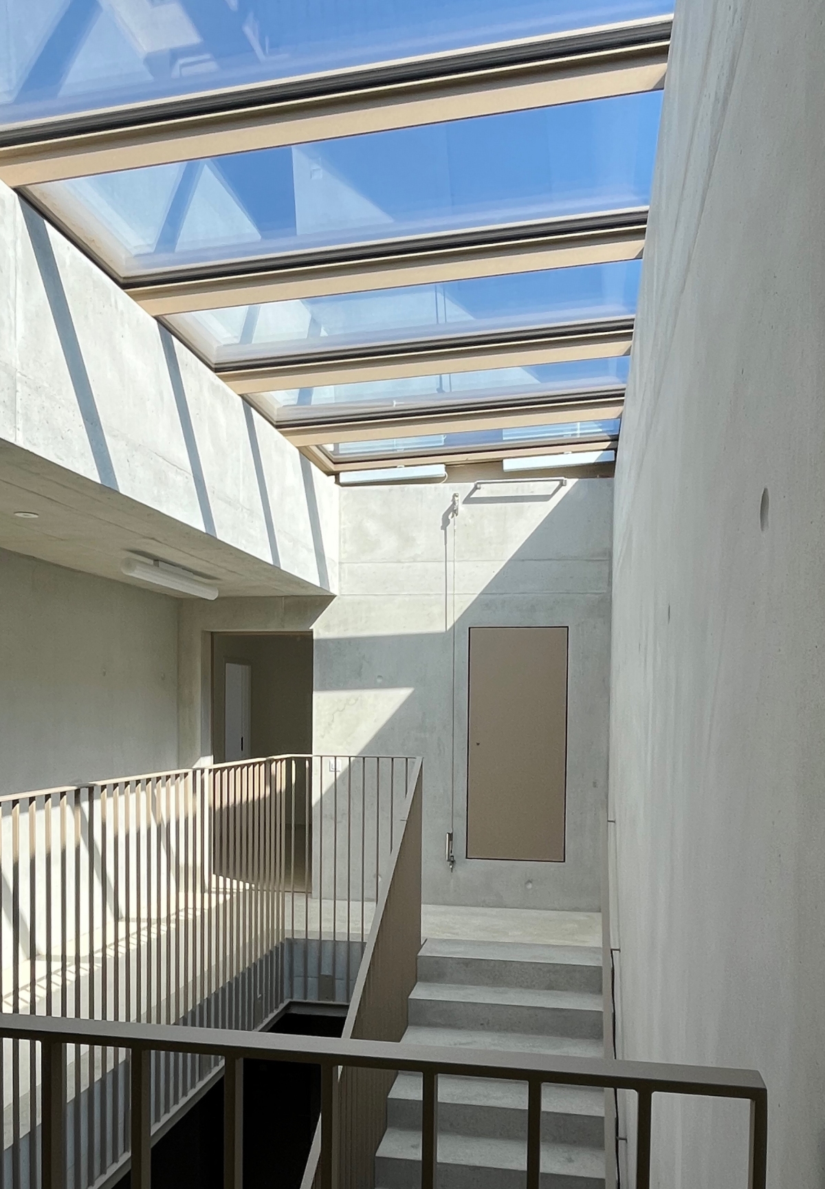 L’immeuble est constitué d’un rez- de-chaussée et de huit étages, dont deux en léger retrait. Ces retraits assurent la transition d’échelle entre le front de la route des Plaines- du-Loup et ses voisins. De grandes terrasses accompagnent l’orientation majeure des appartements dont la typologie traversante se tourne vers la nature.
