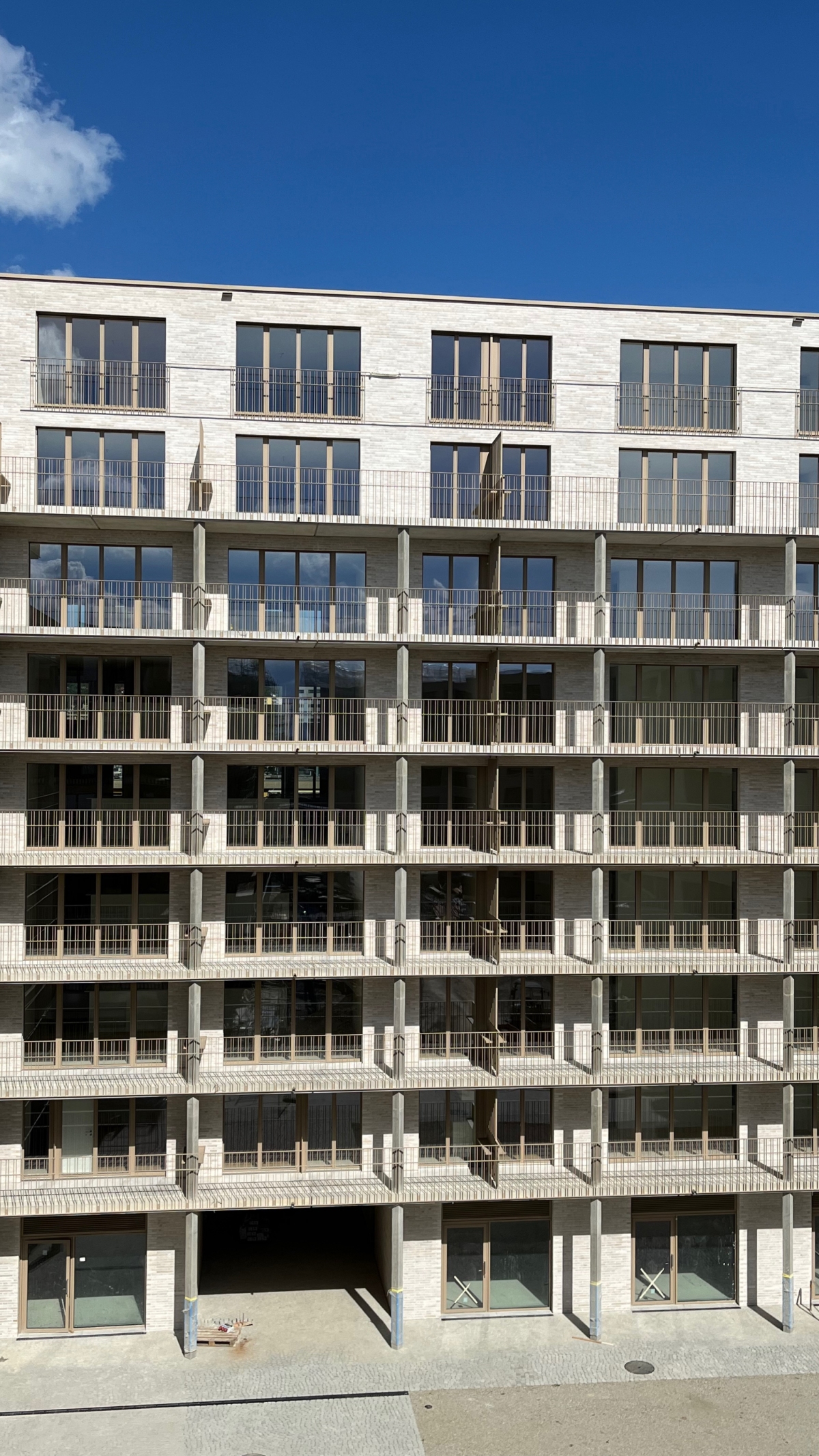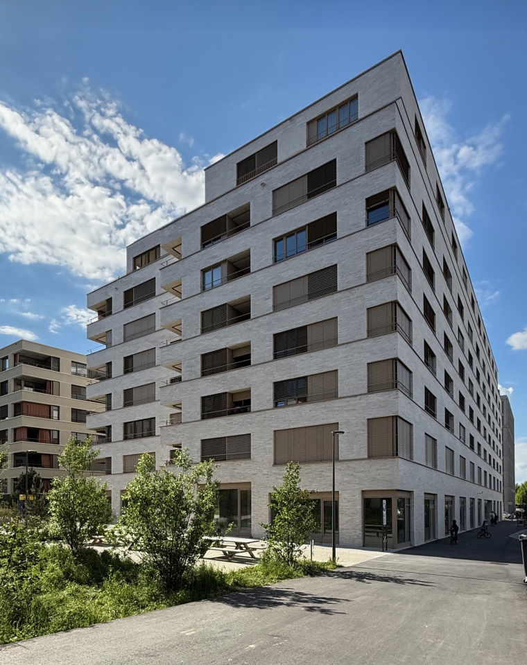L’ensemble du bâtiment est rythmé par de grandes ouvertures. La structure du bâtiment est conçue en béton pour répondre de façon efficace aux exigences statiques d’un immeuble sur 9 niveaux hors-sol. Ce béton est recyclé pour répondre aux attentes liées au développement durable pour le quartier. La façade est composée d'une isolation périphérique recouverte d’un revêtement céramique. L’ouvrage a été développé selon les critères SMEO et MINERGIE P ECO.