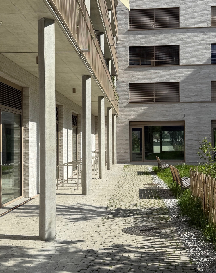 En limite de l’éco-quartier des Plaines-du-Loup, l’immeuble s’ouvre à l’ouest vers le « grand pré » qui est l’espace de référence arboré au cœur de la pièce urbaine. La volumétrie est pensée pour s’intégrer à l’environnement bâti et dégager des vues sur le paysage.
