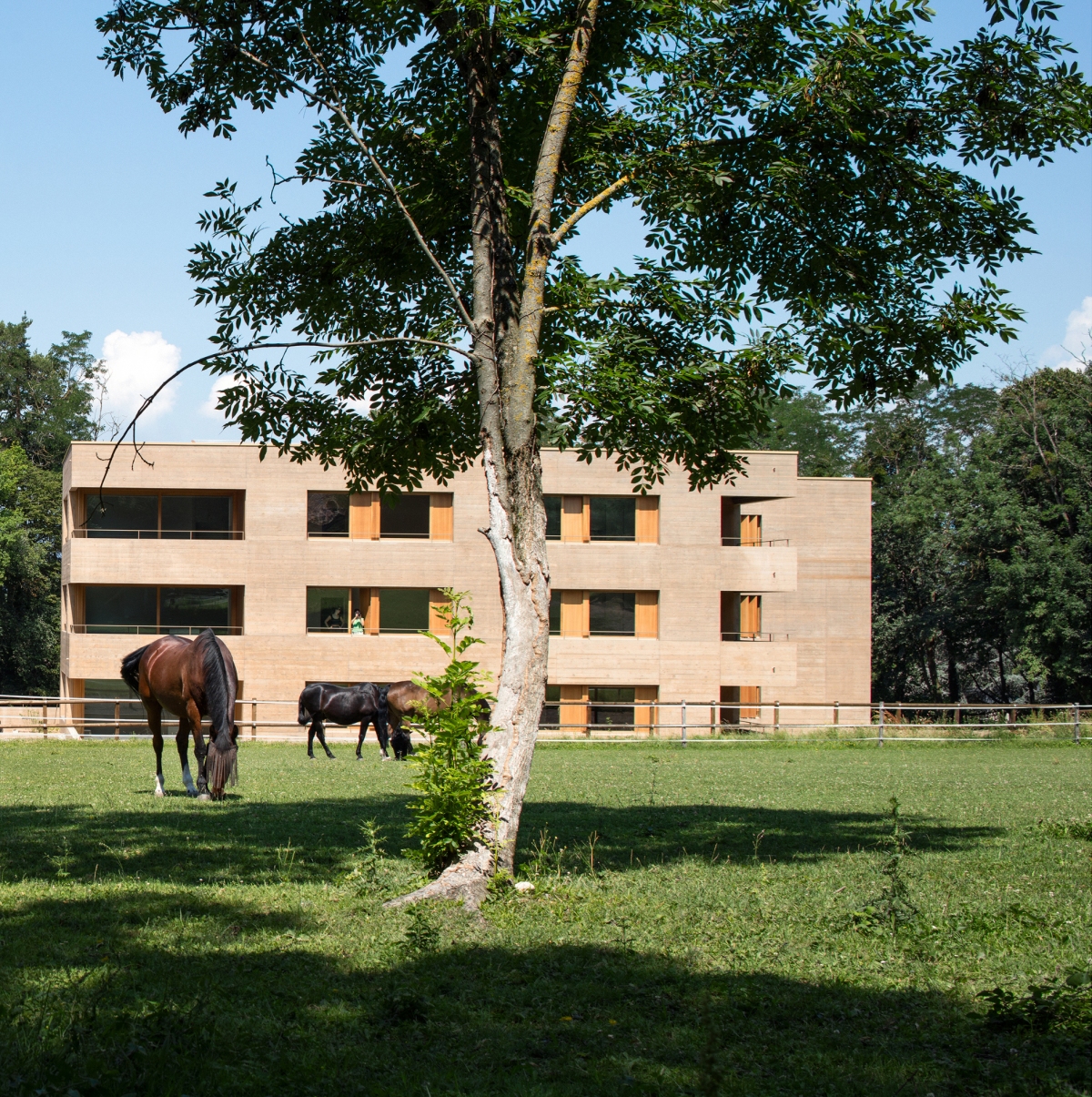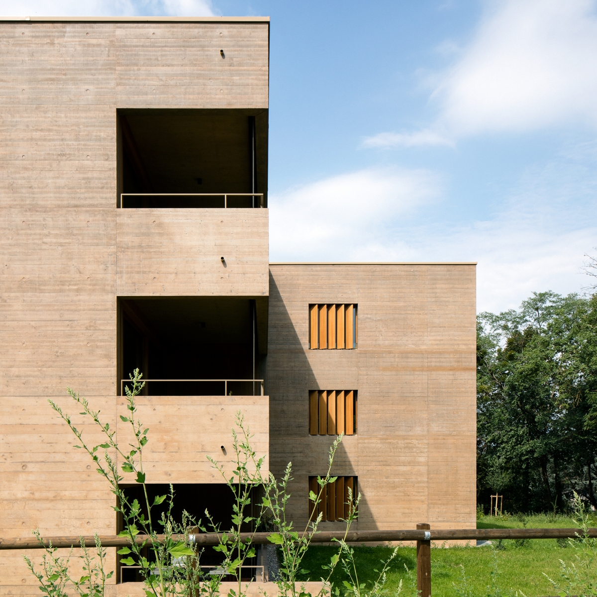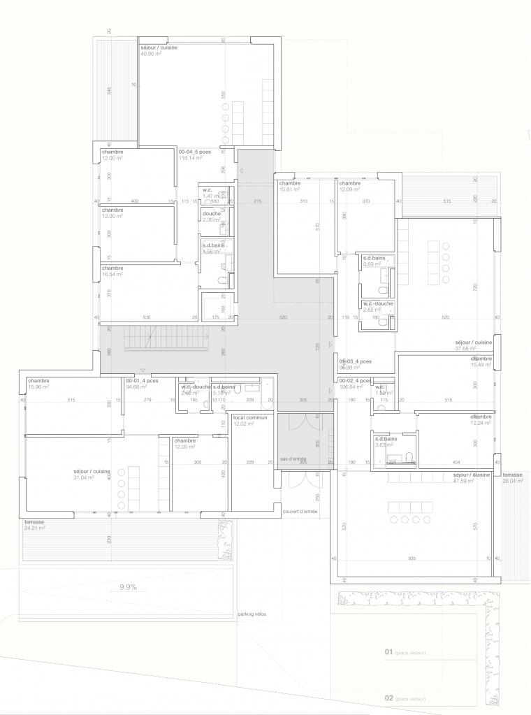 Le projet propose 12 appartements de 4 et 5 pièces possédant chacun une loggia sur l’angle (double orientation solaire possible), à l’exception de deux appartements du rez-de-chaussée, dont l’un se prolonge par une terrasse. La distribution verticale s’effectue par un escalier éclairé naturellement, qui permet de mettre de la distance entre les deux appartements au Nord et d’apporter de la lumière au centre du volume.