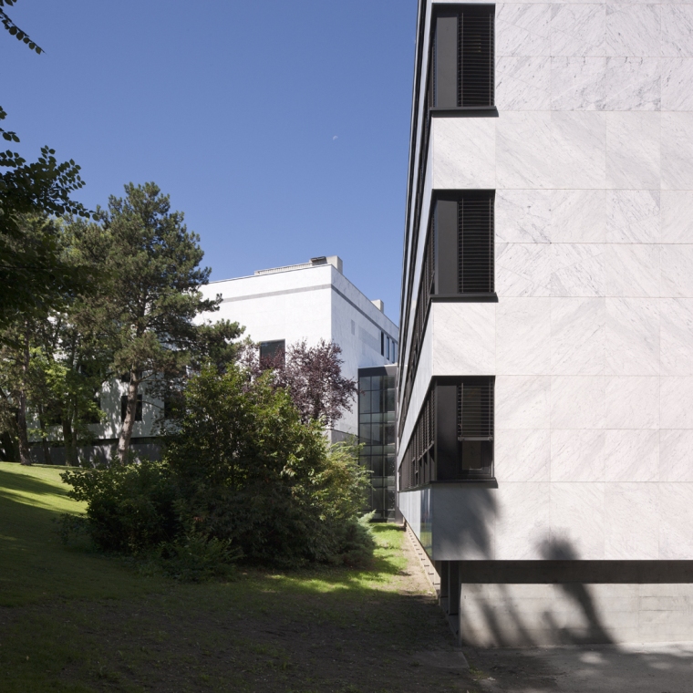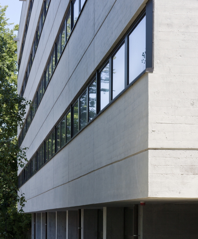 La modification majeure interviendra au sens de la mise en oeuvre du placage, qui deviendrait une façade ventilée, alors qu’il était 'collé' au mur porteur à l’époque de sa réalisation. Le respect du dessin original sera entrepris avec les quelques nuances dimensionnelles permettant d’atteindre les valeurs thermiques que la notion de développement durable nous porte à devoir accepter.