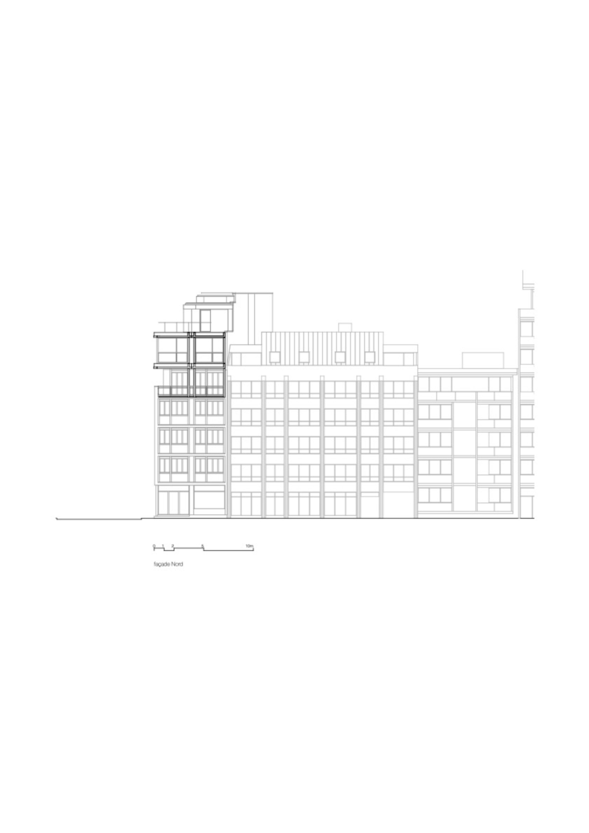 Le volume existant présente une façade très travaillée avec une grande visibilité des éléments constructifs distincts. Le projet reprend le langage architectural ainsi que les travées structurelles originelles. Les modules des fenêtres de la sur-élévation s’ouvrent sur la totalité de la trame offrant plus de lumière aux nouveaux appartements. Le 6ème étage, en retrait, continue cette même métrique avec une matérialité et une expression de façade plus contemporaine et légere.