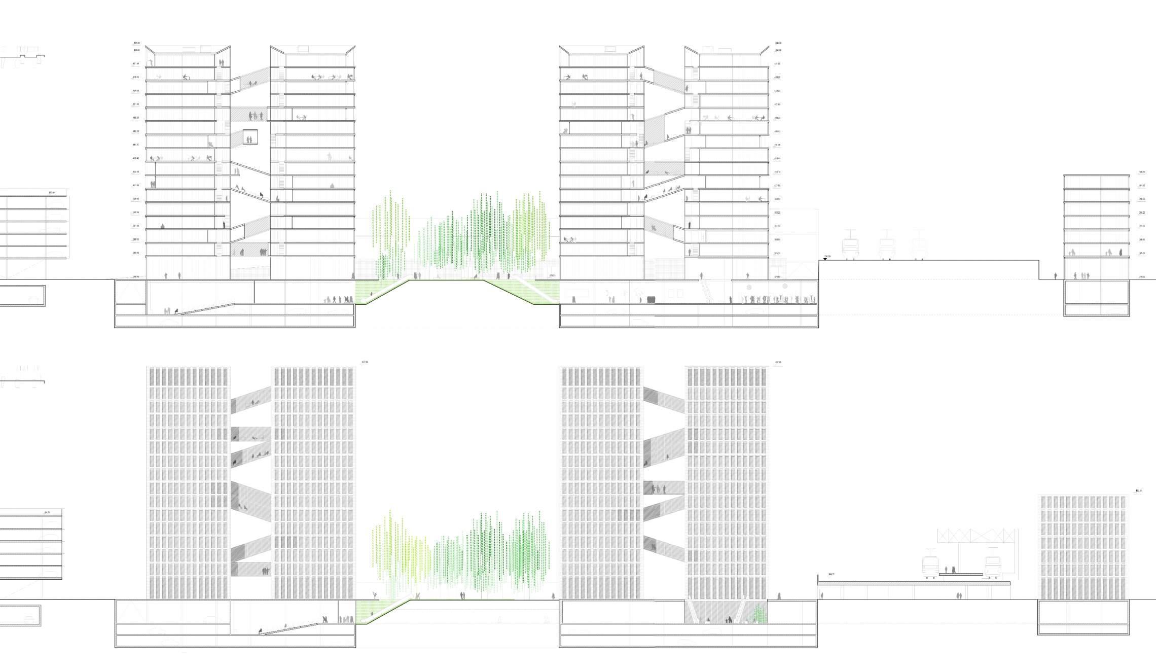 A la sortie de ce dernier, le rez-de-chaussée du bâtiment  'L14' est presqu’entièrement évidé afin de donner la continuité de l’axe piétonnier depuis la future place de la Gare. Le passage sous le CEVA s’effectue par une large galerie hypostyle où les montées vers les voies sont mises en évidence. Le parcours se poursuit entre les nouveaux bâtiments au pied desquels s’installent les commerces et les différents accès vers le haut (bureaux dans les étages), mais aussi vers le bas (cinémas et parkings au sous-sol). Pour amorcer le passage difficile de la route des Jeunes, sans mettre en jeu la démolition du P+R de l’Etoile, le rez-de-chaussée de ce dernier est aussi vidé (discothèque déplacée dans le complexe) pour permettre une grande ouverture, à l’échelle de l’homme, face au gigantisme de la future place de l’Etoile. Le parcours se poursuit dans l’avenue de la Praille vers l’Arve. Une traversée de la ville de rivière à rivière.