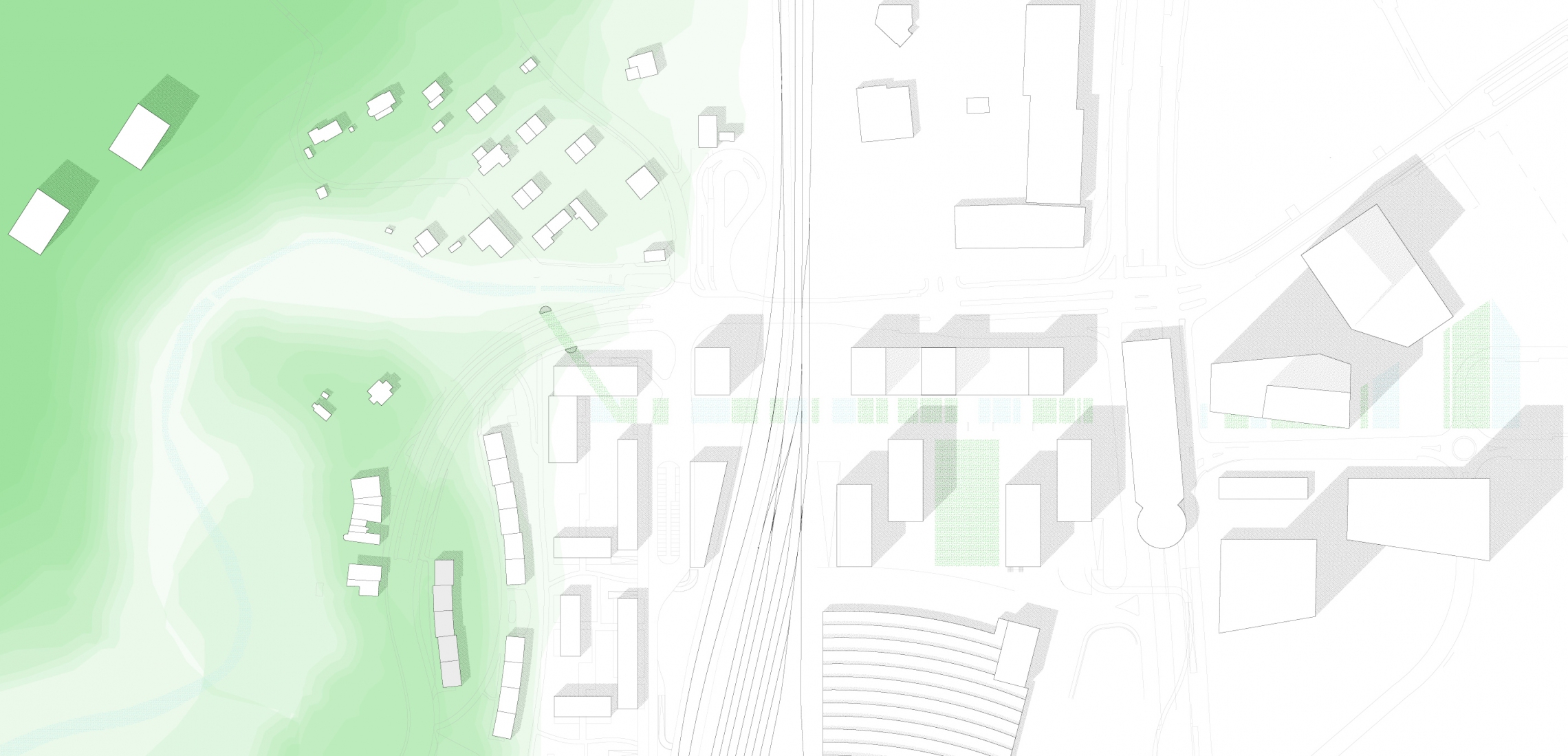 La création d’un nouveau quartier ne peut se détacher d’une vision territoriale. Cette dernière est déjà esquissée dans le plan général du morceau de ville qu’est le plan 'Praille-Acacias-Vernets'. L’îlot du Pont-Rouge vient renforcer la liaison entre les zones vertes que sont les bords de l’Arve et les bords de l’Aire : un lien entre Carouge et Lancy. Cette relation est encore accentuée par la présence d’un skyline vertical mis en place dans les années soixante à travers les tours de Lancy (Jean-Marc Lamunière, 1963-64) et les tours de Carouge (G. Brera & altr., 1958-69). Ce lien paysager est caractérisé par un projet de sol, dont la matérialité s’appuie sur la mémoire, ou la métaphore, des rivières enterrées l’Aire et la Drize. Pour rendre plausible cette vision urbaine qui ne pourrait rester qu’au niveau de l’idée conceptuelle, il s’agit de mettre en place un vrai parcours avec un début et une fin. Le parcours commence du côté de Lancy, dans le bucolique bois de l’Aire (chemin des Vignes), pour ensuite se connecter par un passage sous la route du Grand-Lancy, à la manière du parc en Sauvy (Georges Descombes, 1980-86).
