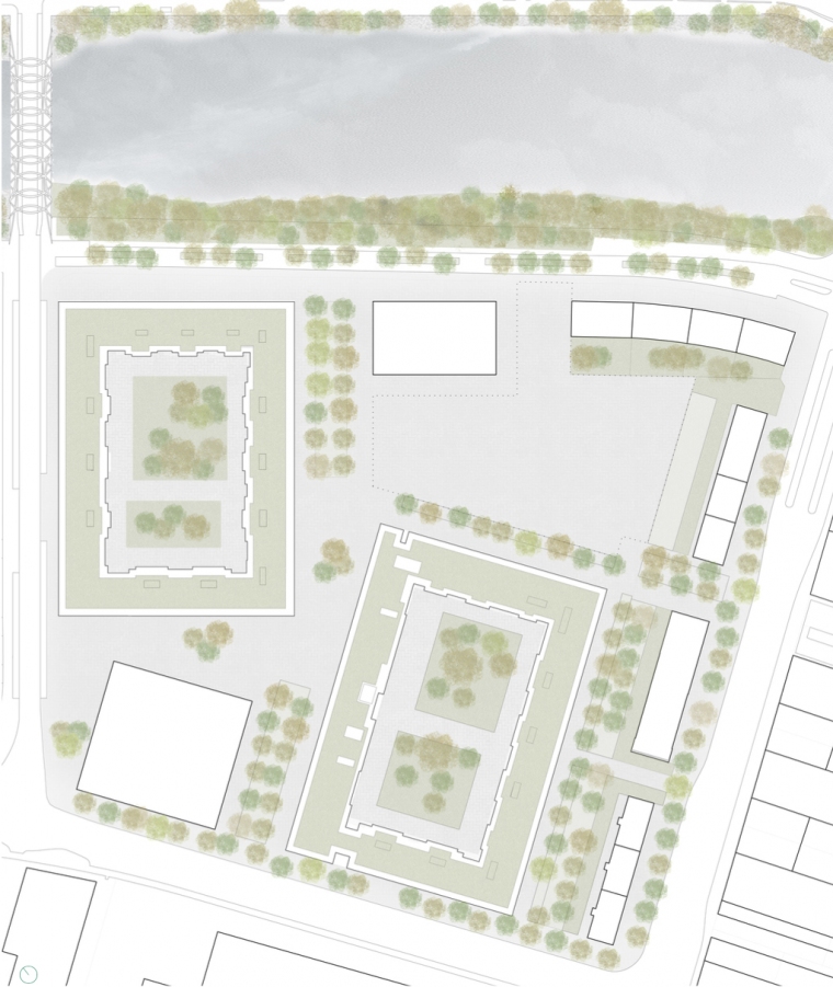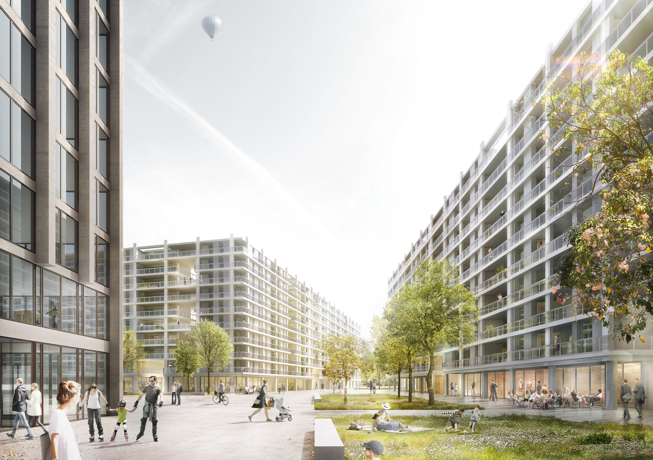 La conception de l’enveloppe d’untel ensemble urbain se veut rationnelle et répétitive, tout en permettant la diversité. A la masse bâtie définie par le PLQ répond une forme de légèreté qui permet une perception visuelle agréable à l’usager de la ville et à l’habitant. Sur la périphérie, les dalles des loggias-balcons se détachent horizontalement devant des colonnes qui marquent à la fois le socle et le couronnement. Un garde-corps en verre accompagne cette stratification du volume. Enfin, le projet a été conçu pour offrir une structure simple, respectant des portées d’environ six mètres, avec un mélange entre des éléments coulés sur place et préfabriqués.